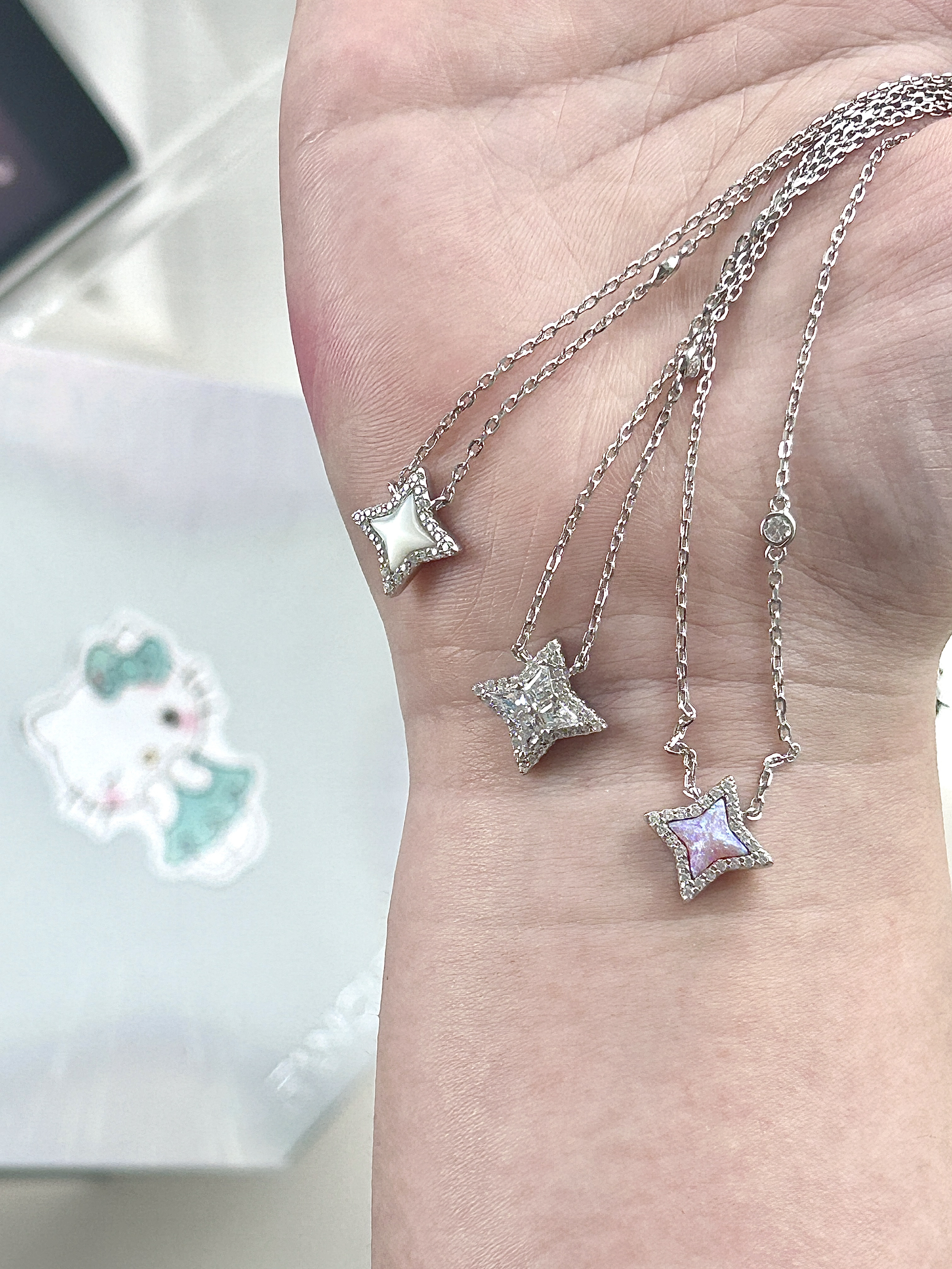 是谁一次性收到了男朋友送滴三条项链!!🥺 原来是我!!! 三条都是一个系列滴! 是fanqi家滴光芒系列~✋ 每一条都闪到挪不开眼睛耶! bling bling闪着光芒~在锁骨间微微摆动🥳 自带氛围感~带上感觉自己都变温柔噜! 款式简单大方 hin百搭!😋 搭配裙子T恤西装等等等都可以! 礼盒装也敲适合送人滴!