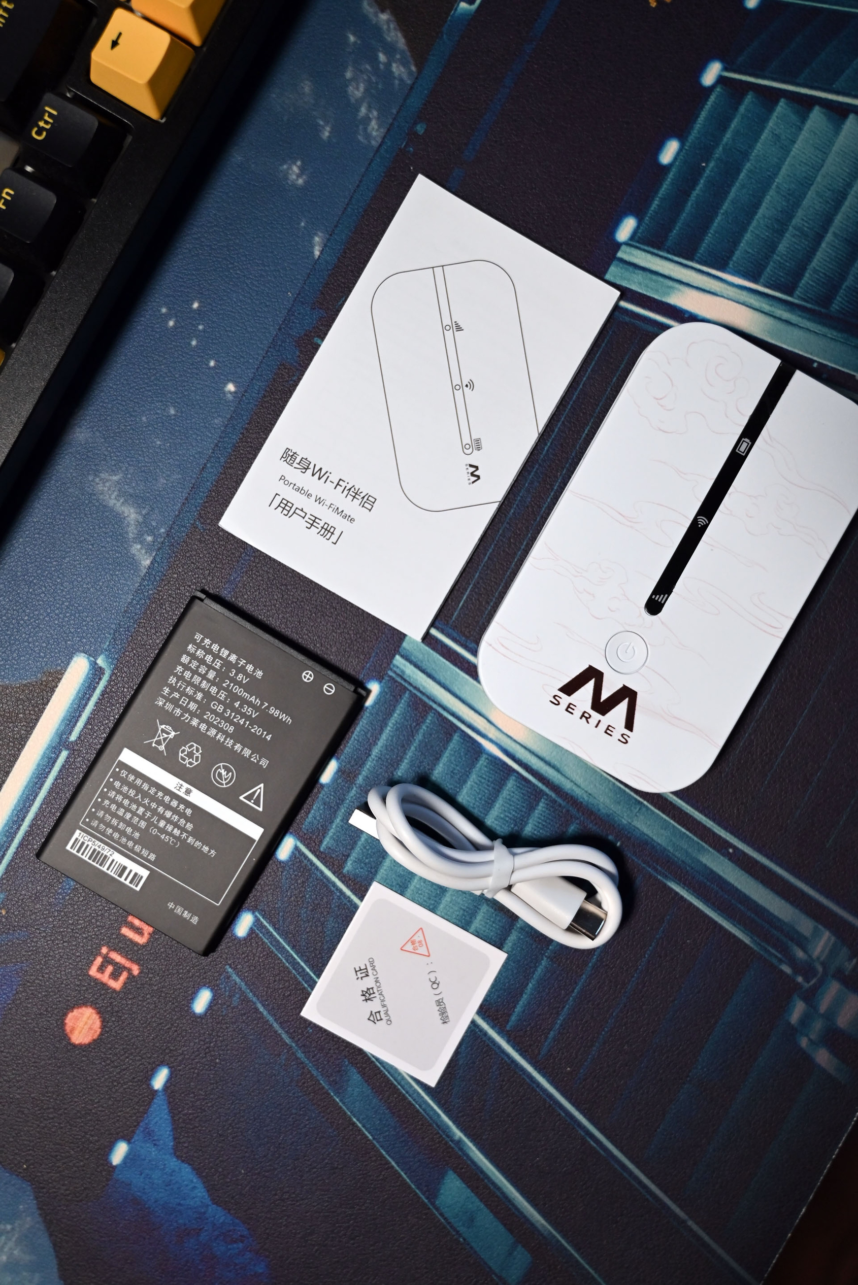包装清单分别是:1个随身WiFi盒子主体、1本用户手册、1根C口充电线、1块2100mAh可充电锂离子电池,以及一张合格证。个人认为这是一款非常实用的移动网络设备,方便你在网络不好的情况下上网,如今互联网高度发达,没有网络简直跟没了空气一样。