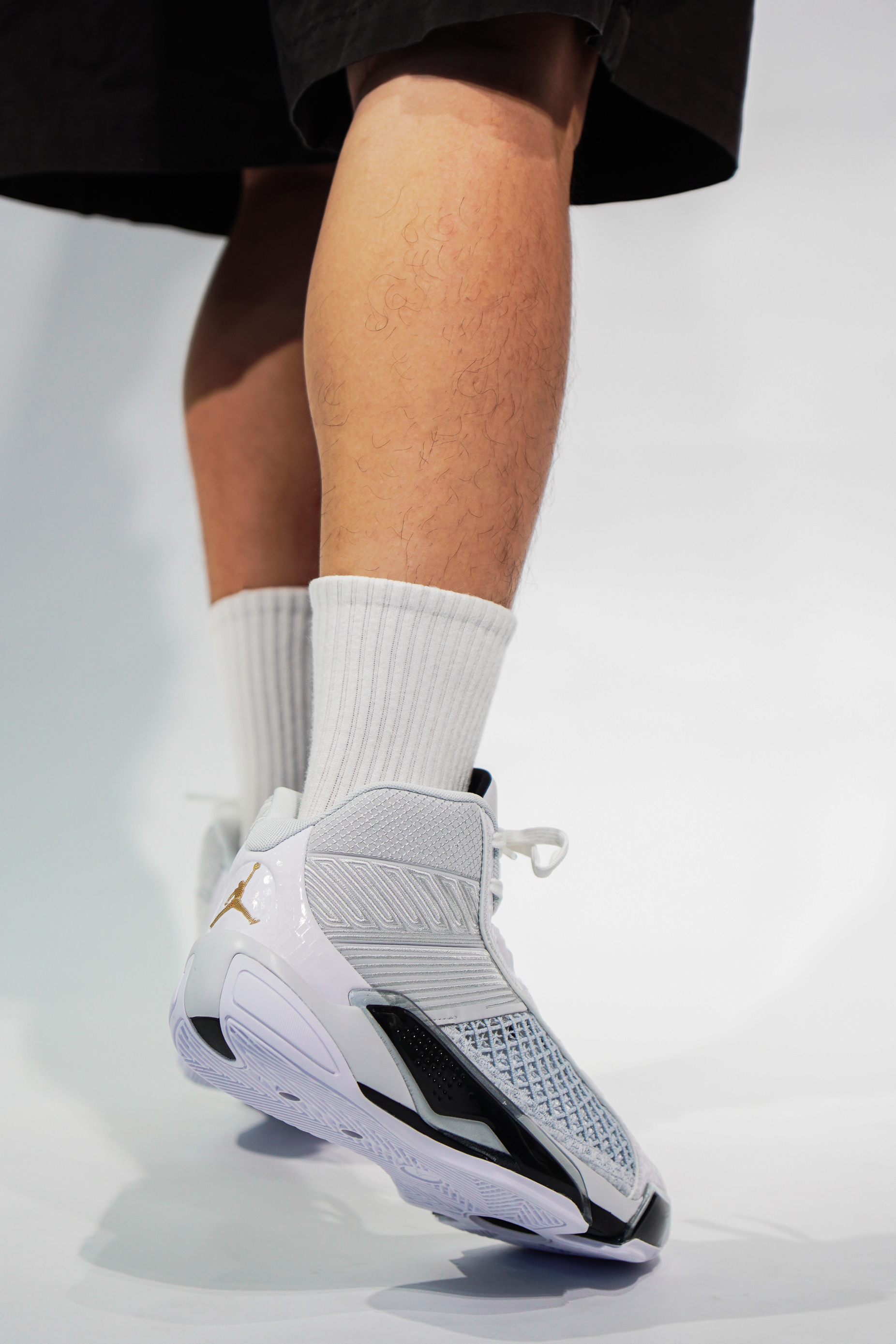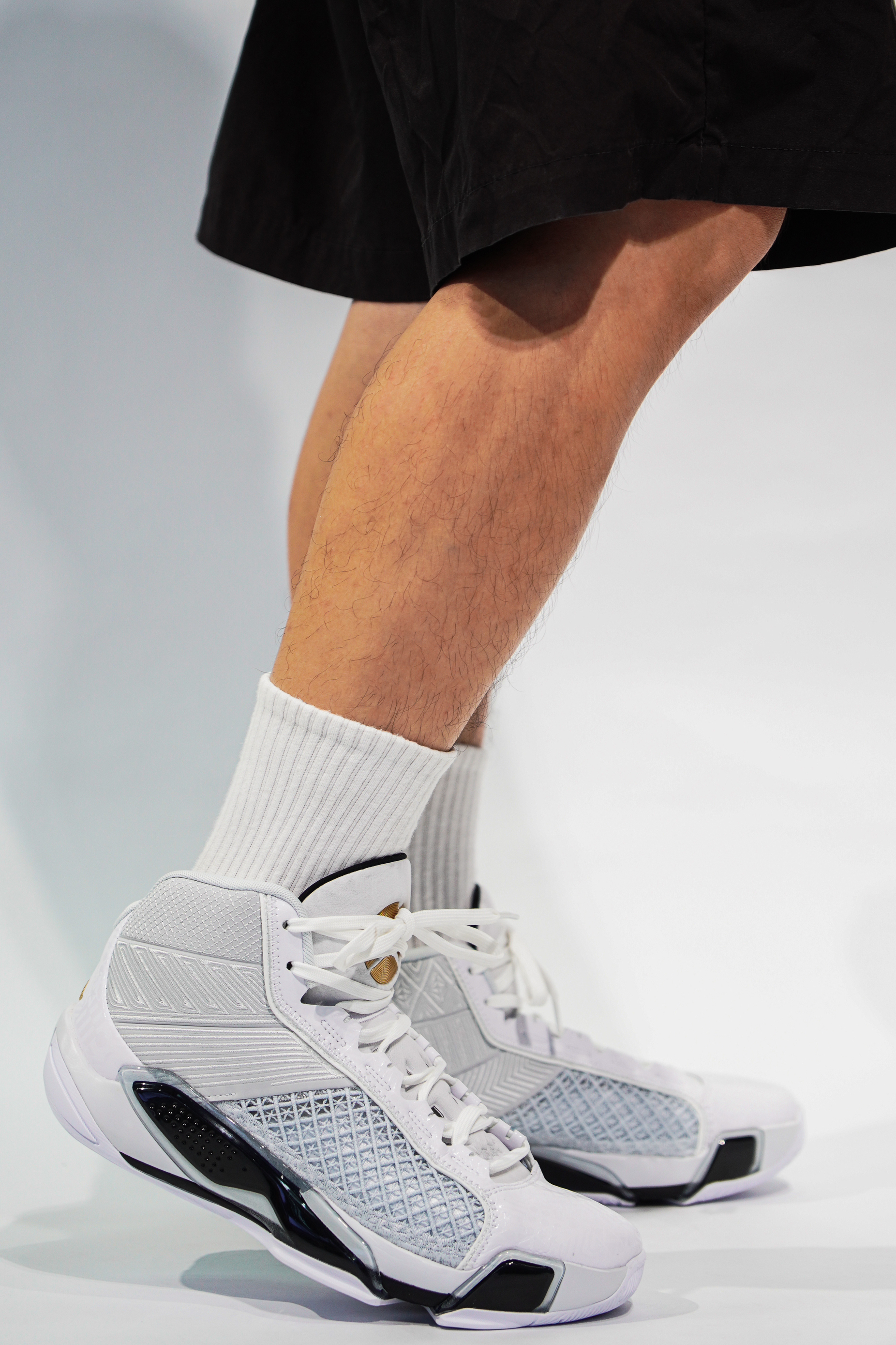 此次带来的这款 Air Jordan 38 以今年的 FIBA 篮球世界杯为灵感打造全新配色,整体采用了白灰色为主色设计,再以黑色还有金色点缀鞋款细节。而鞋面采用的多种材质打造。带来了出众的层次感。内侧还有篮球世界杯奖杯的图案。鞋舌和后跟的 Jumpman Logo 则是金色,象征 FIBA 男篮世界杯的最高荣誉。甚至直接在鞋舌内侧印着男篮世界杯的冠军奖杯,突出配色主题。