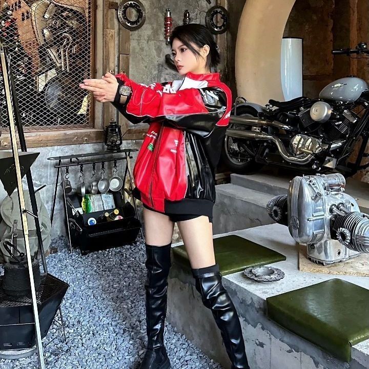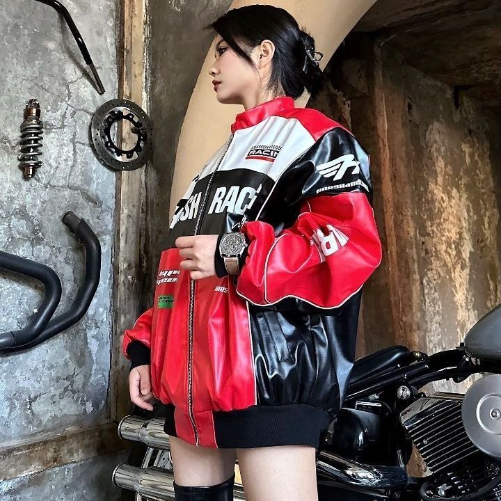 👉炸街必备款!这个夹克穿上立马拉风!🚜💨 👉超级喜欢它的立领设计,满满的复古街头风,真的太有感觉了!💗💗 👉oversize的版型,穿起来非常舒服,仿皮夹克的质量也是非常棒👍👍 👉赛车服的设计,口袋、拉链等细节都做的很好,整体很有质感。🛡️🔥 👉搭配牛仔裤、运动鞋,就可以轻松出门啦!🚶♀️👟💨 总结: 这款夹克真的是非常值得入手!👌👌 ✨图片来源博主:辣辣哟