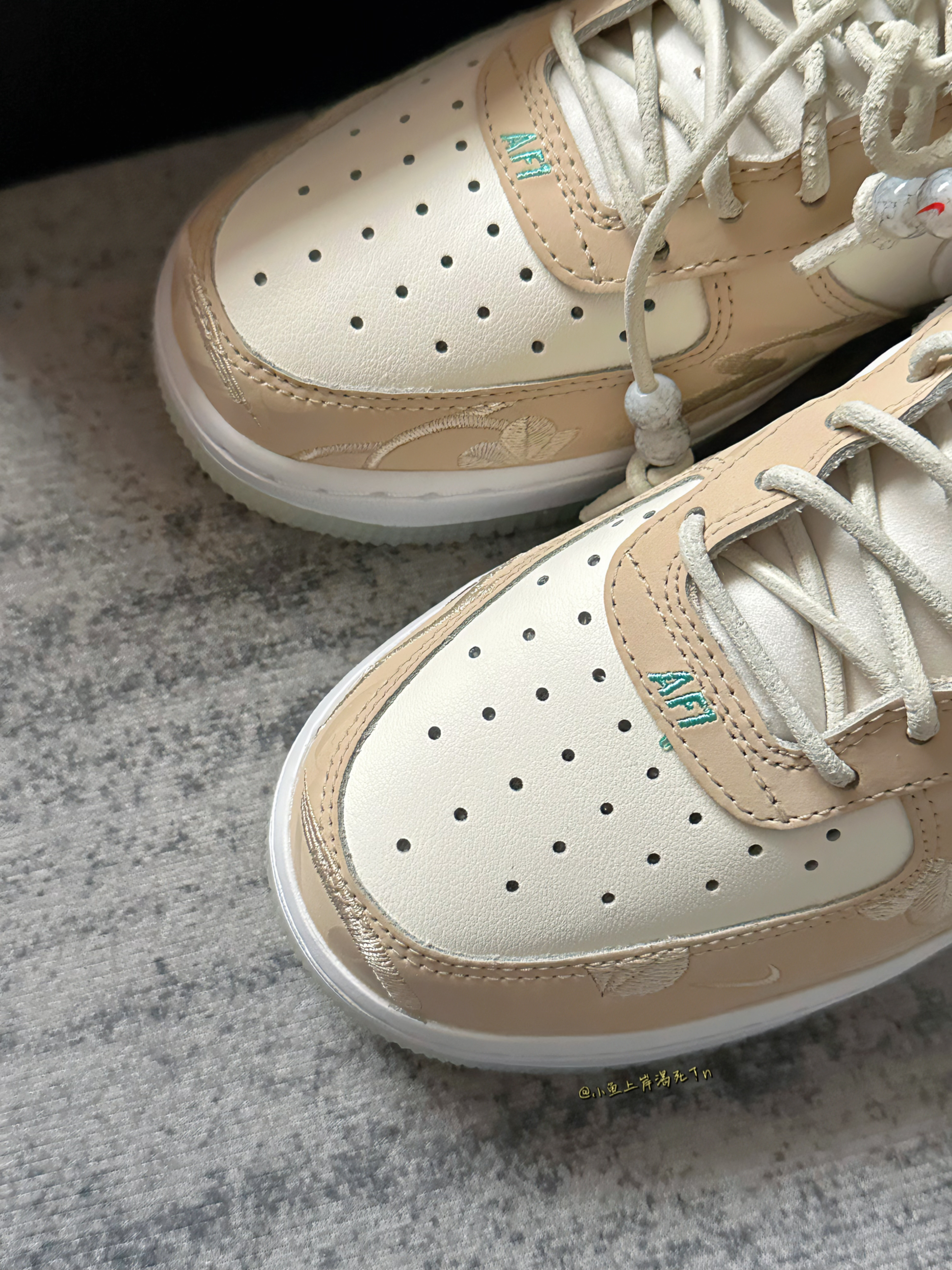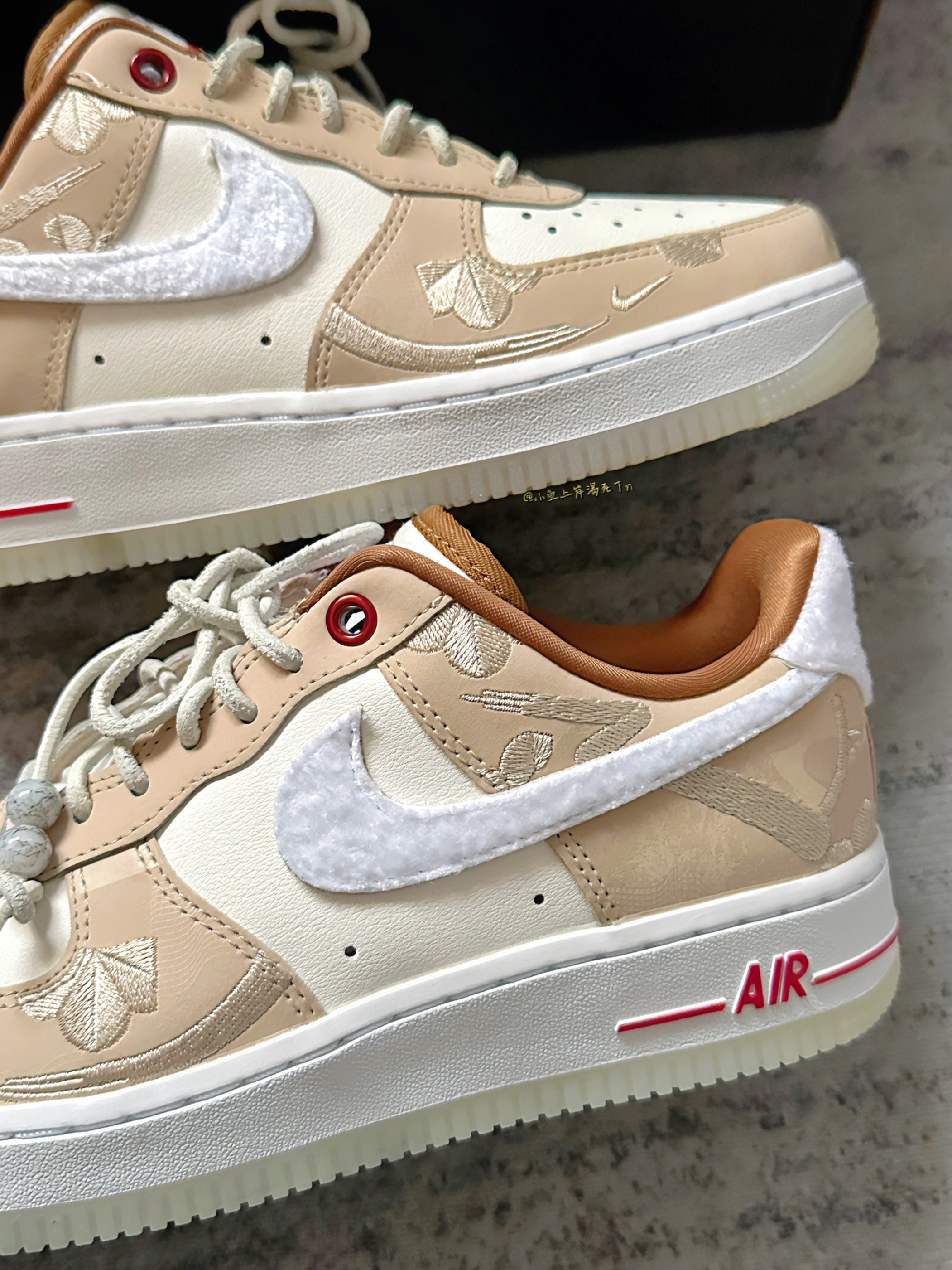 哈喽 小鱼来喽! 今天给大家推荐分享这双air force 1 兔年限定 这双也是今年过年时发售的一款 实物质感还是不错的 侧身的swoosh和后跟都是白色毛绒设计 很有兔子的 感党 白棕配色也是挺百搭耐看的 不过鞋面全合成革 我觉得还是差点儿意思的hhh 诚意没有那么足 大底是半透明的水晶底 很像大理石的感党 目前价格还是不错 挺适合学生党的