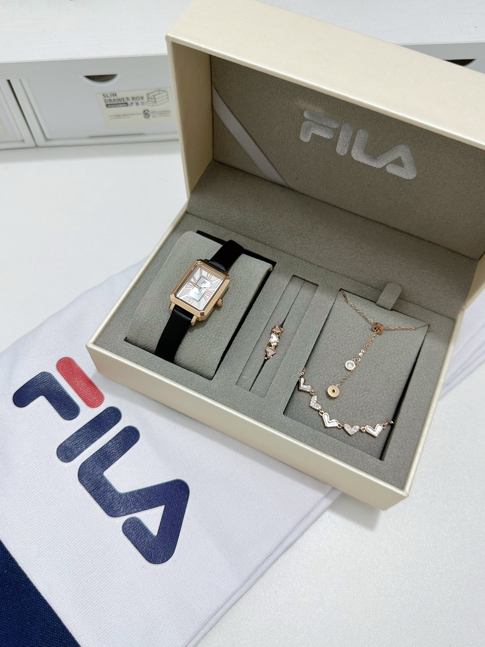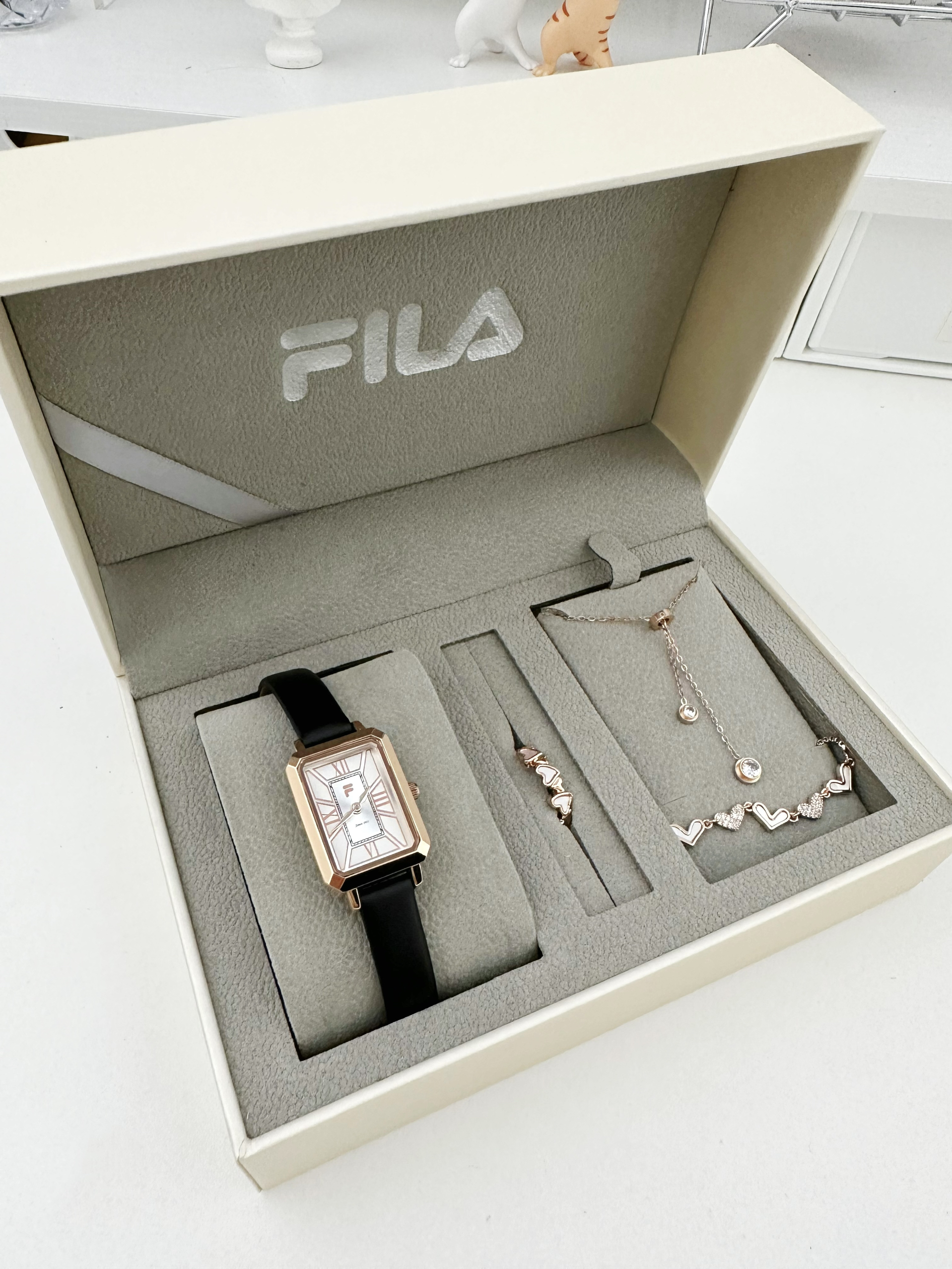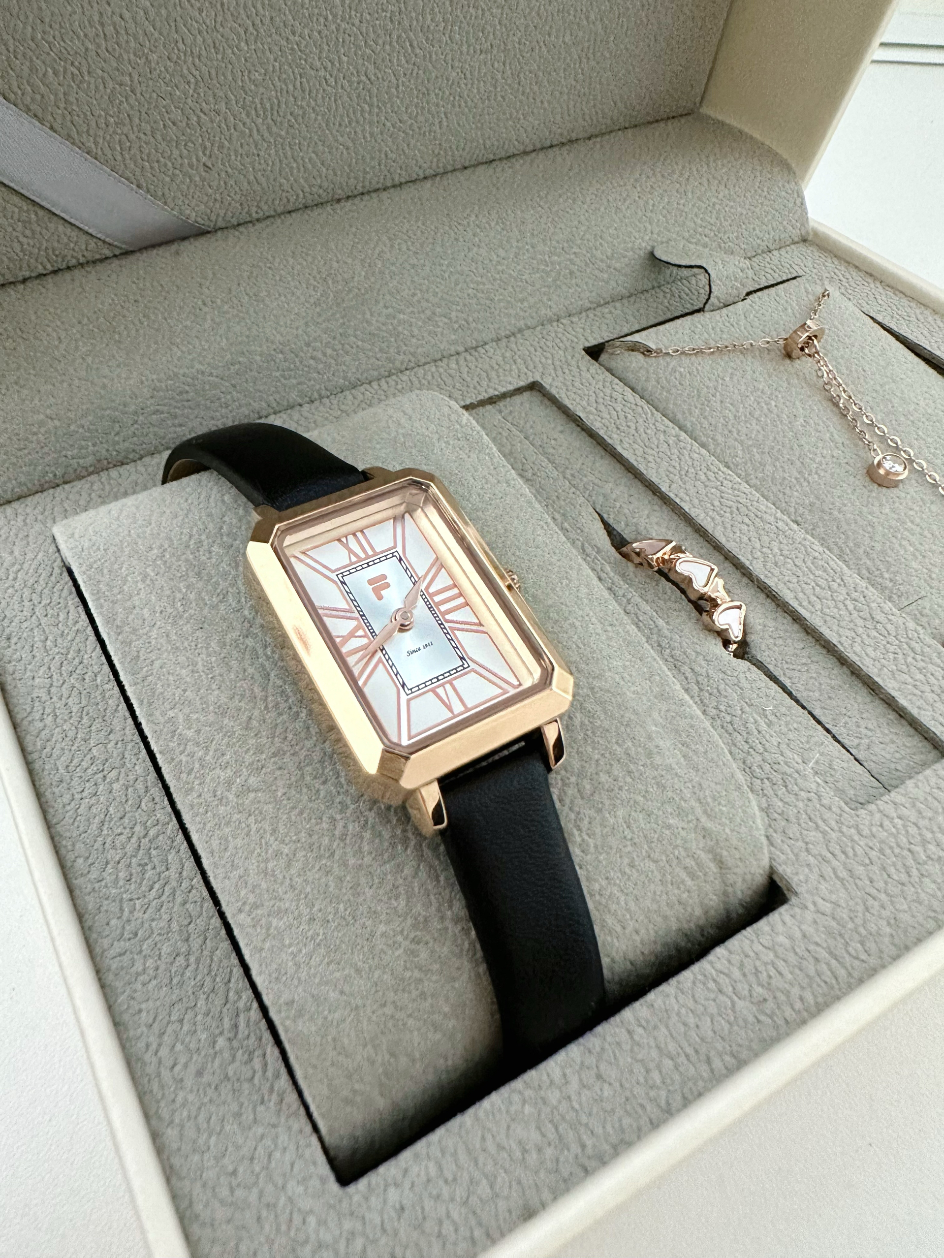 最近真的很表白斐乐的复古小方表⌚️ 皮质表带➕玫瑰金表盘 真的好有气质啊!!! 还送了项链戒指手链一套饰品 礼盒也很高级哦~