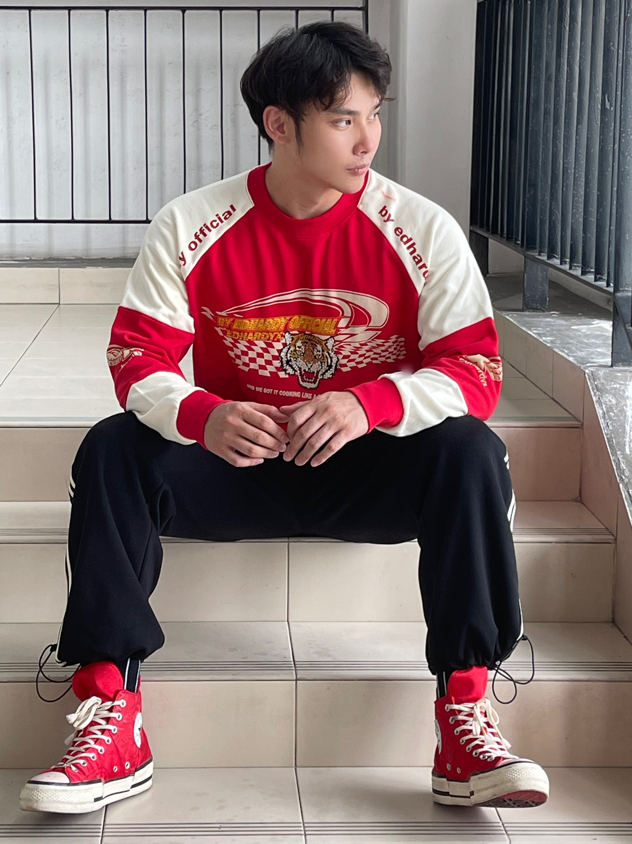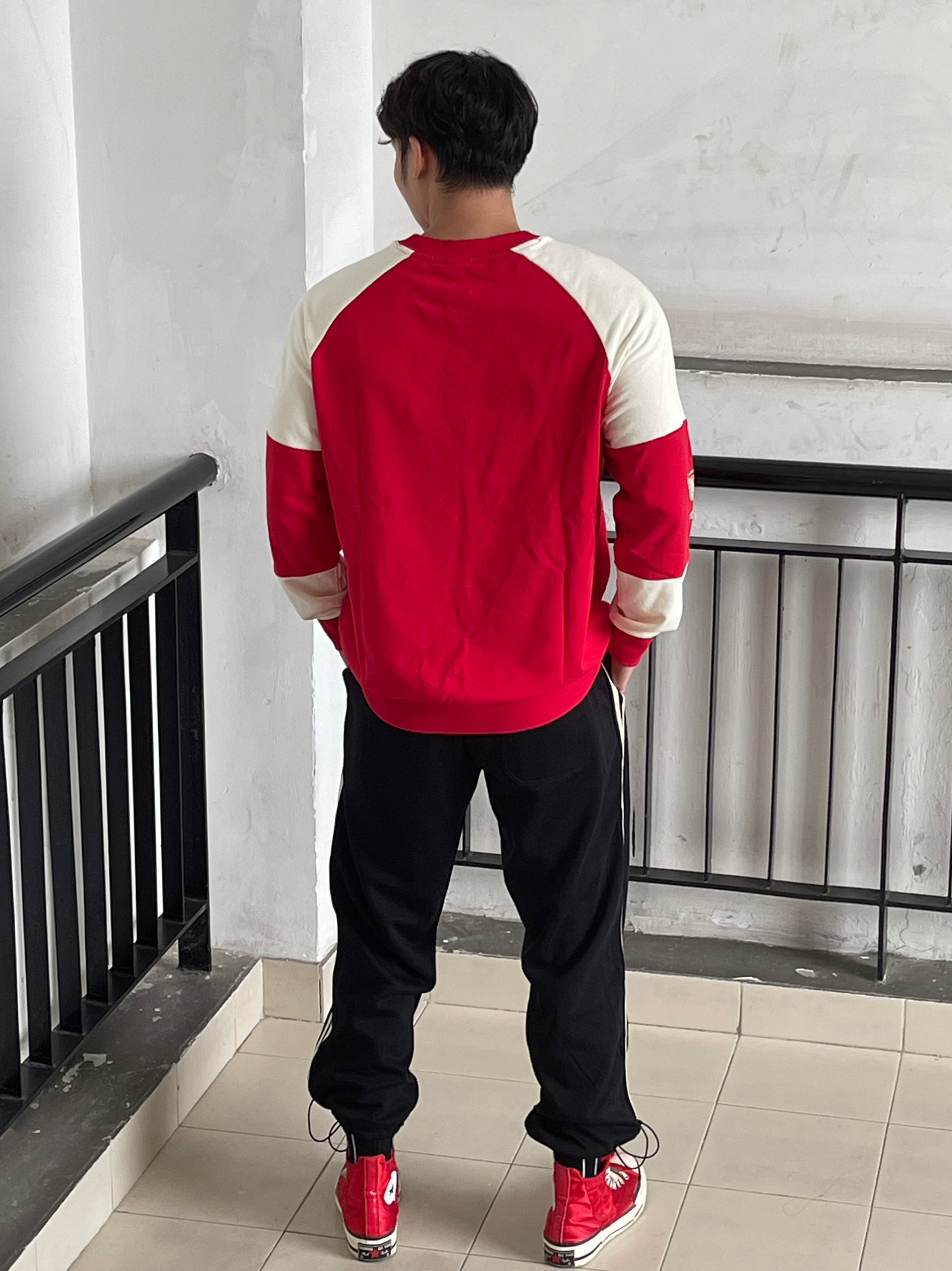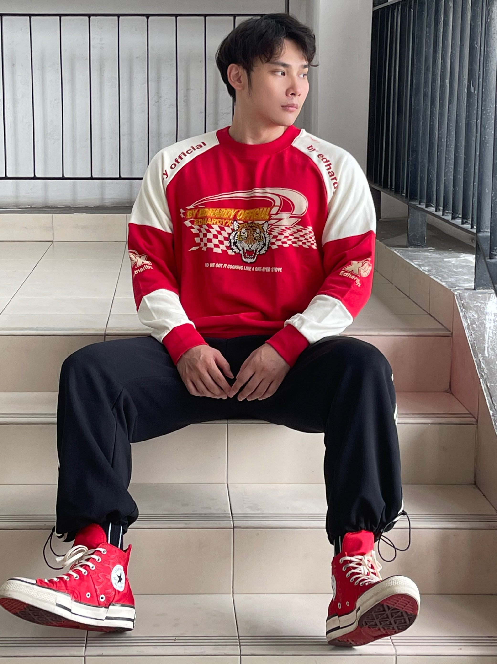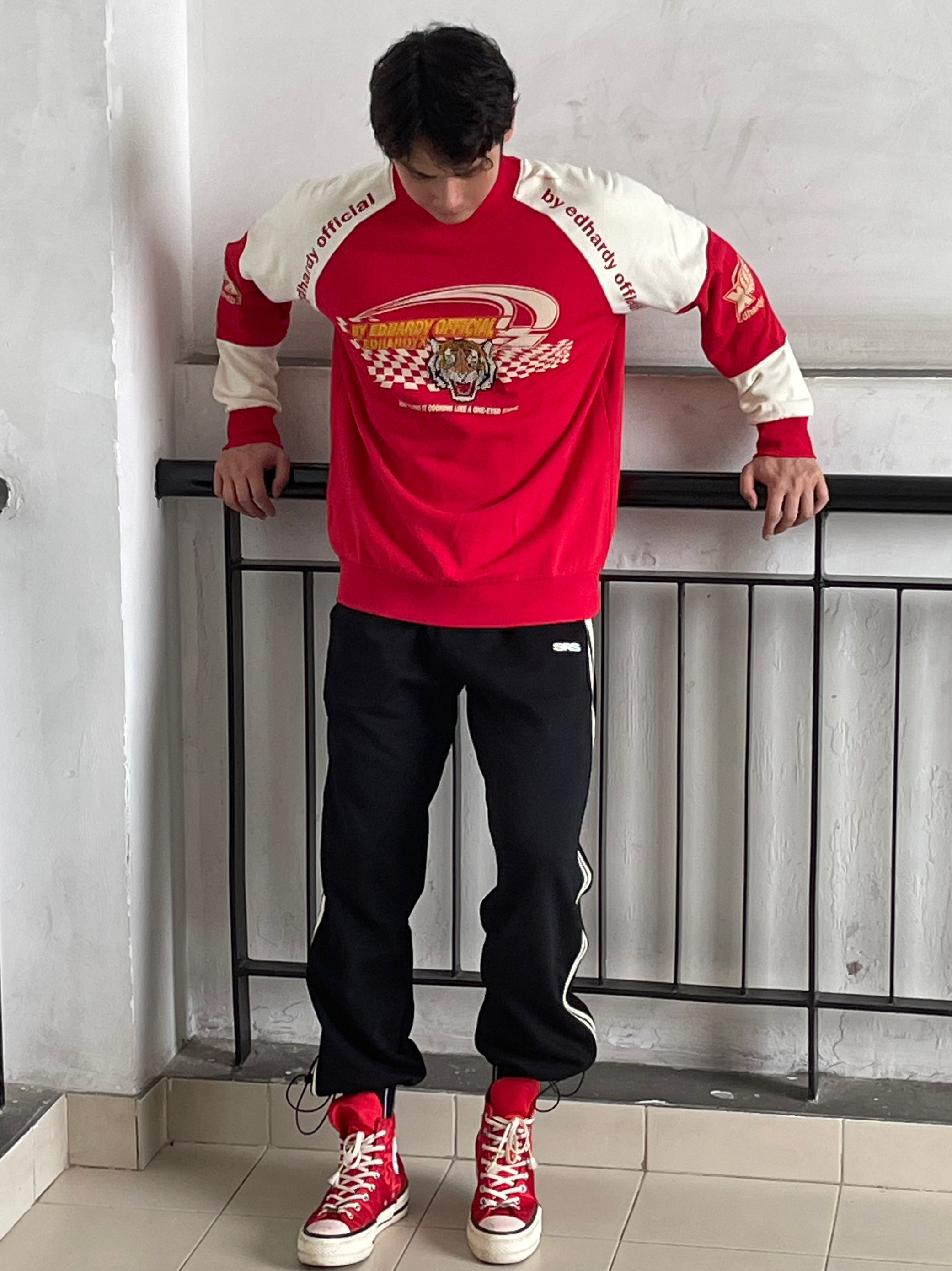 目👀测今年秋冬男生穿搭要被红色系承办了 这还不该火🔥吗❓ 红色系卫衣不仅提气色 简约里还透漏着高级feel👌🏻 就是普通人穿起来都会很好看的色系😍 真的不允许🈲帅哥们没有红色系的搭配 当然,也可是像我这样尝试一下红色➕黑色 🔴⚫️搭配也真的很可以‼️ —————— 卫衣:ED HARDY X 束脚裤:SRME 👟:匡威兔年限定