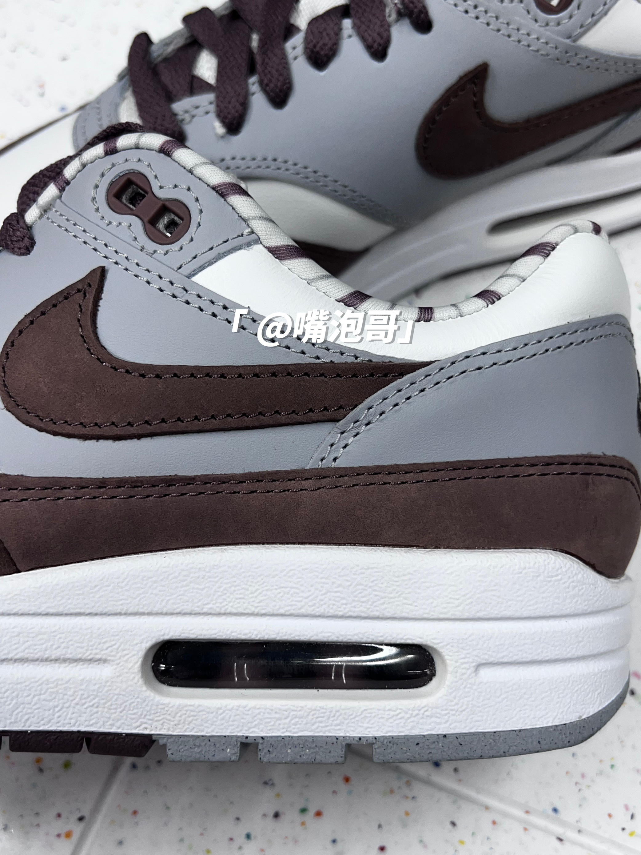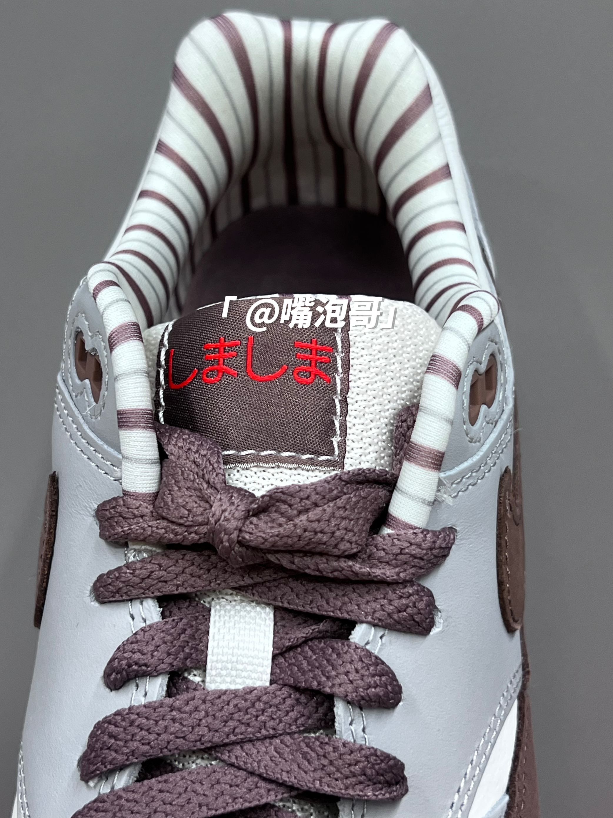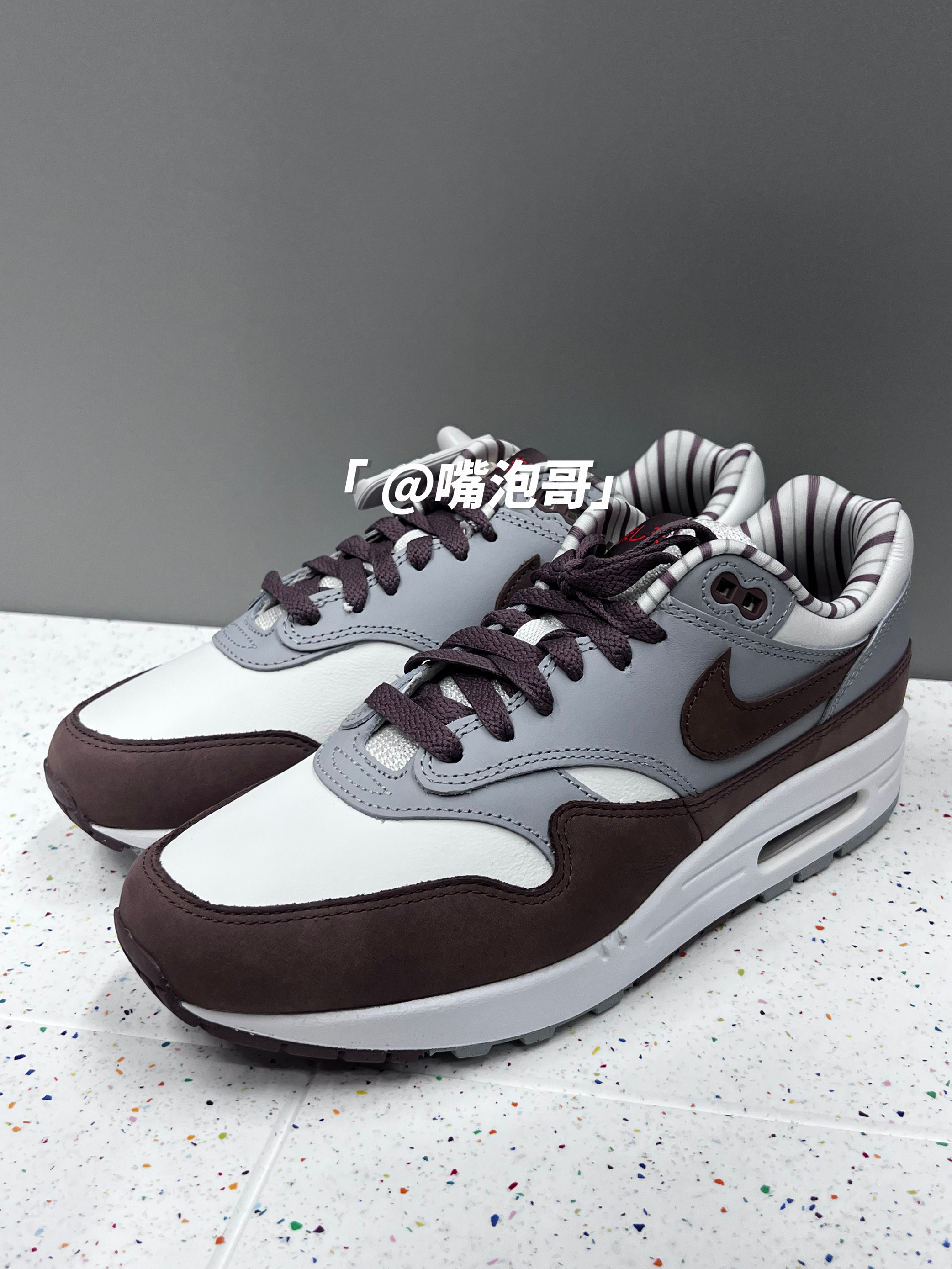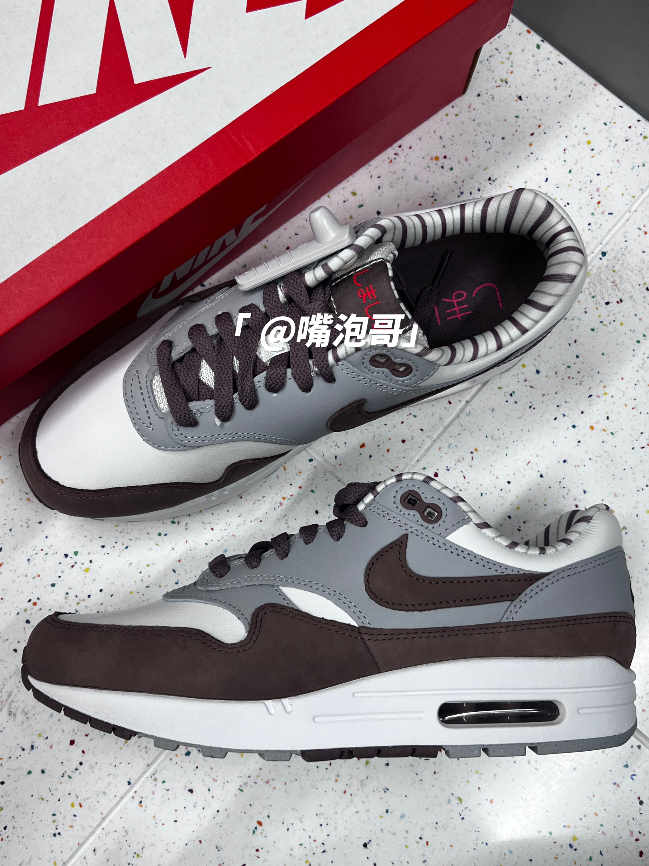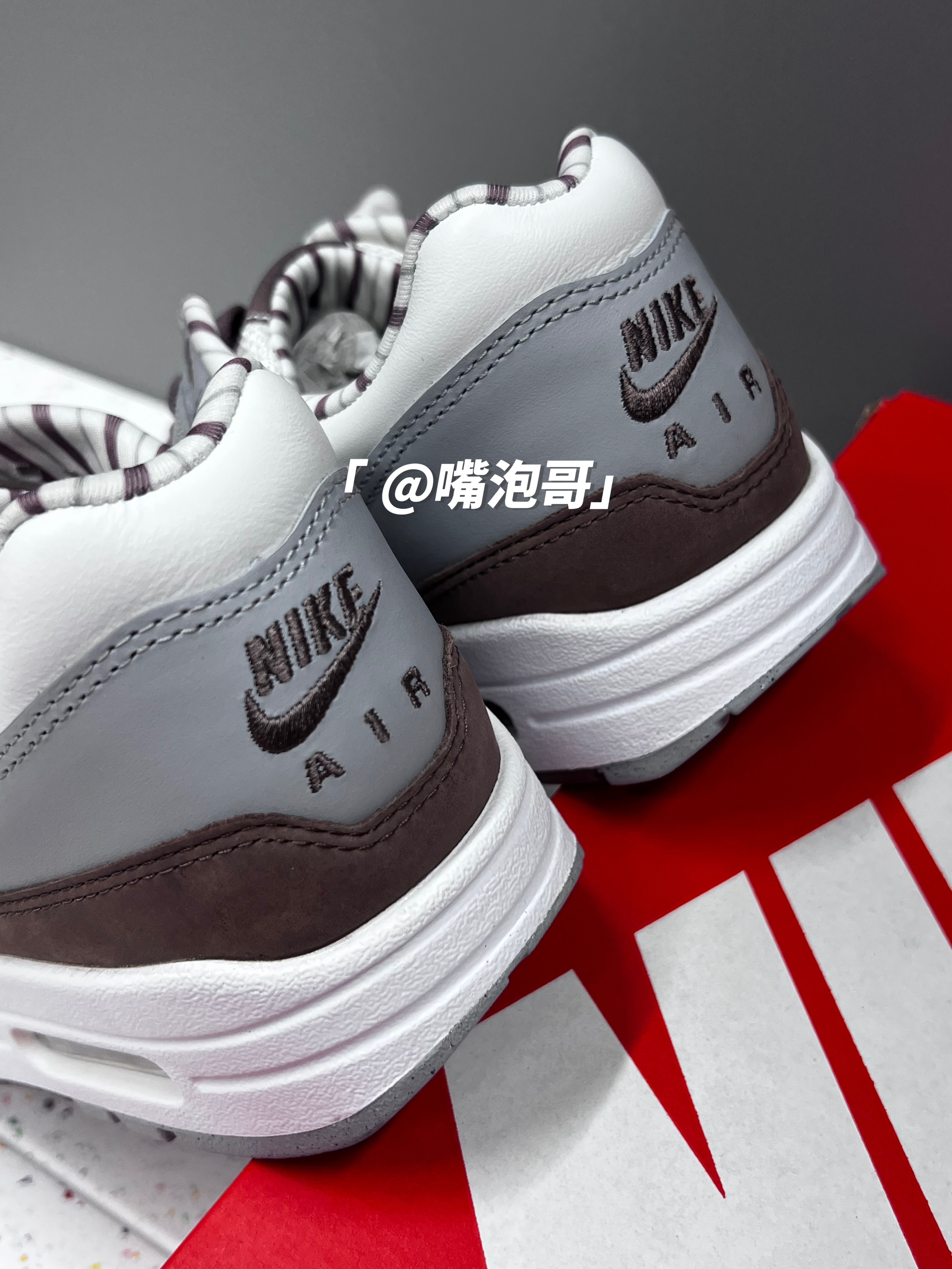 👟:Air Max 1 "Shima Shima" 棕灰色 简介: 鞋款是经典的Air Max 1 鞋型,整体外观配色使用白色、灰色、棕色来组合,并且运用不同的皮质拼接组合而成鞋面,搭配上中底双缓震科技,使鞋子不仅具有质感同时又有良好的脚感。 细节: 鞋面使用白色、灰色、以及棕色麂皮拼接而成,使鞋面具有质感及层次,鞋身两侧的swoosh选用了棕色麂皮制成,织物鞋舌保证了透气性,内里使用...