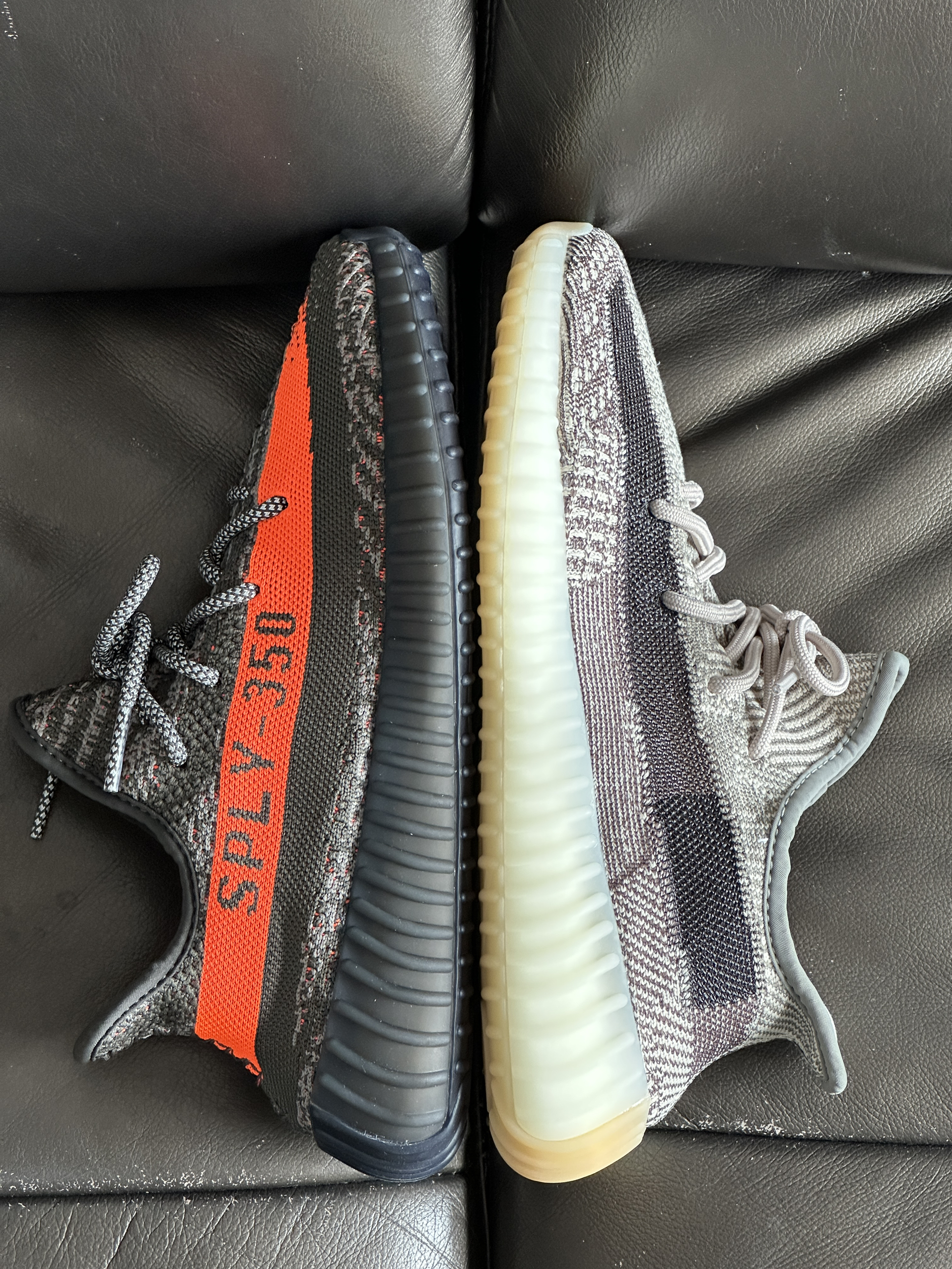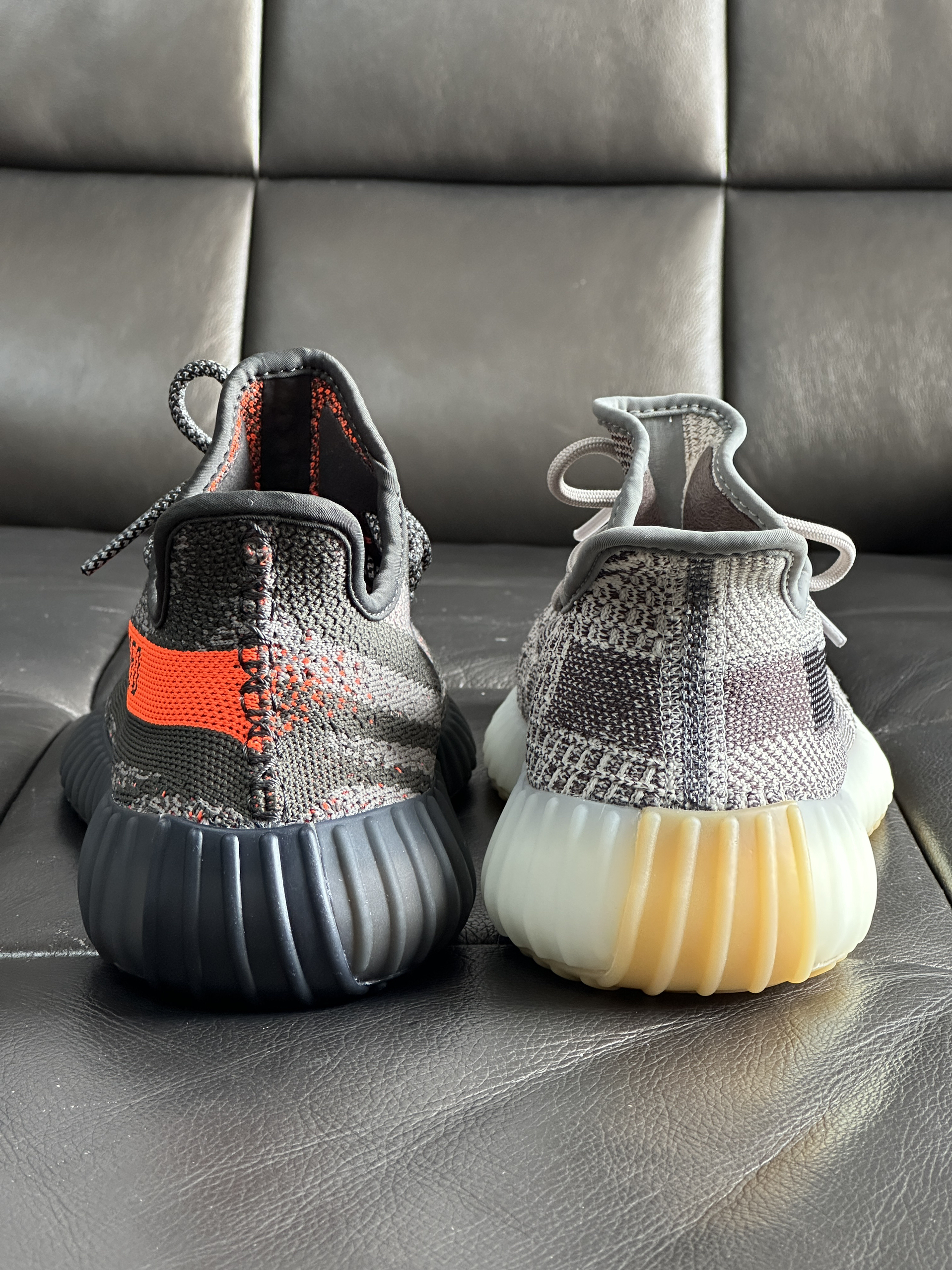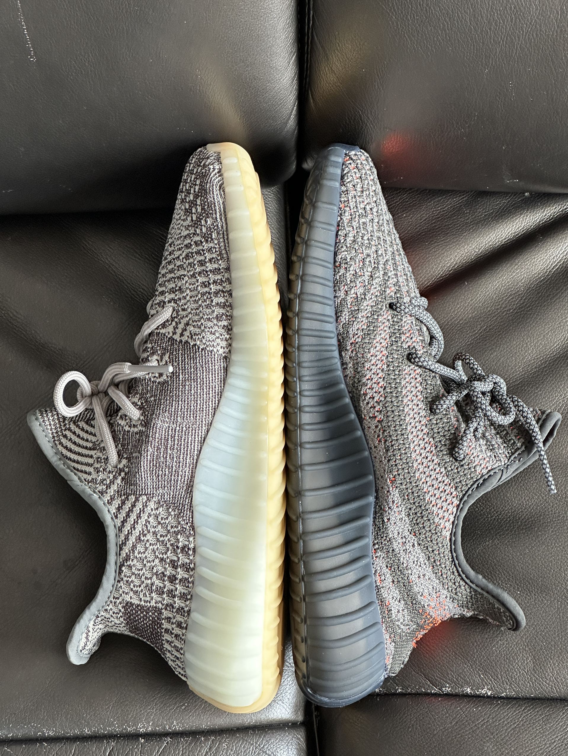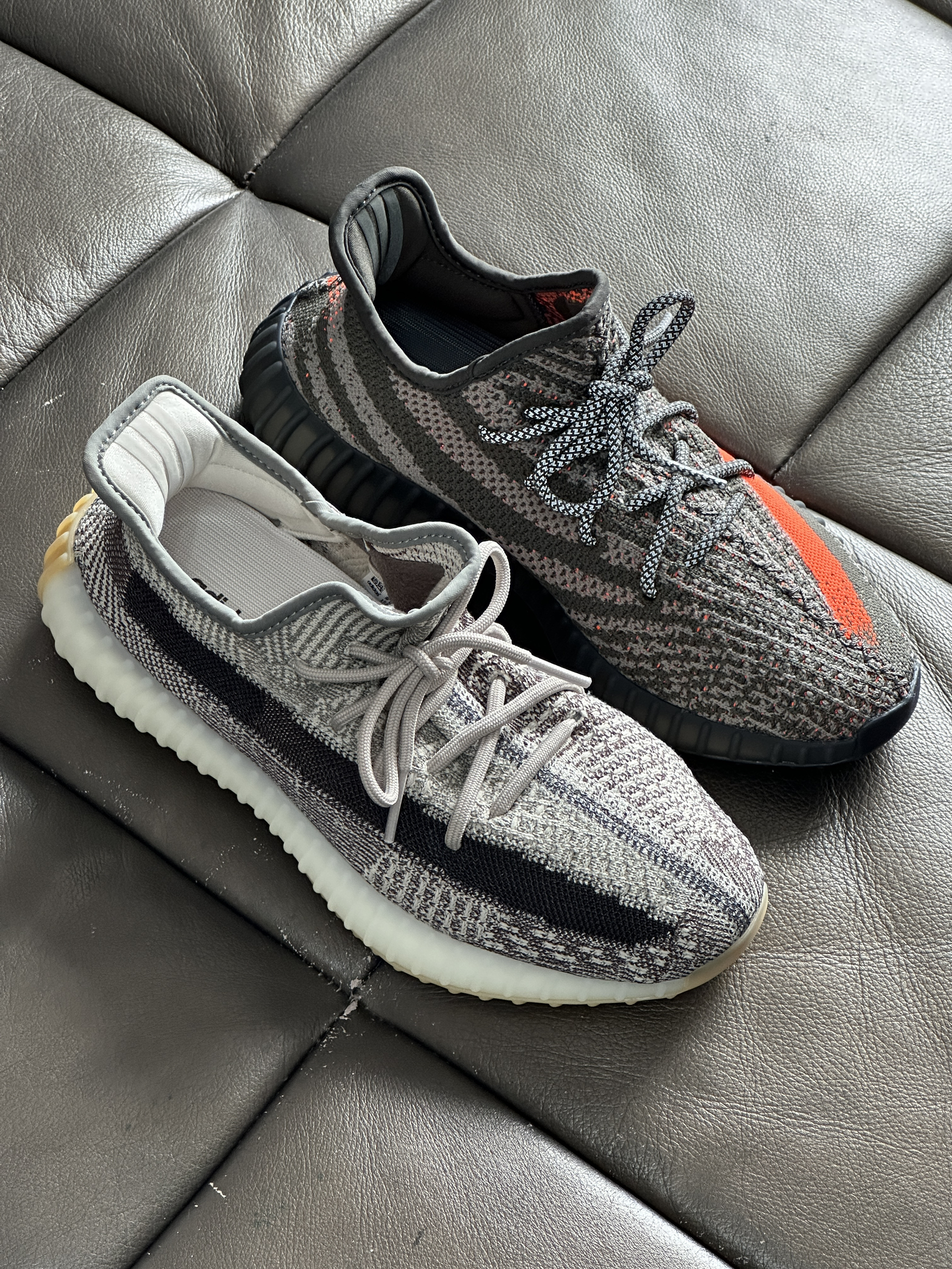 ▶两双灰色系Yezzy350 V2谁的颜值更胜一筹? ▶我个人是非常喜欢灰色系的鞋子,兼具了颜值和耐脏, 灰橙搭配的橙色油漆条让它看起来活力四射!芝麻搭配的黑色油漆条使得它沉稳大气!对于喜欢相对安静的我来说芝麻更好搭配一点点! Yezzy350 V2在柔软的鞋面和出名的Boost大底加持下舒适度毋庸置疑! ▶两双鞋尺码均偏小需要买大半码;