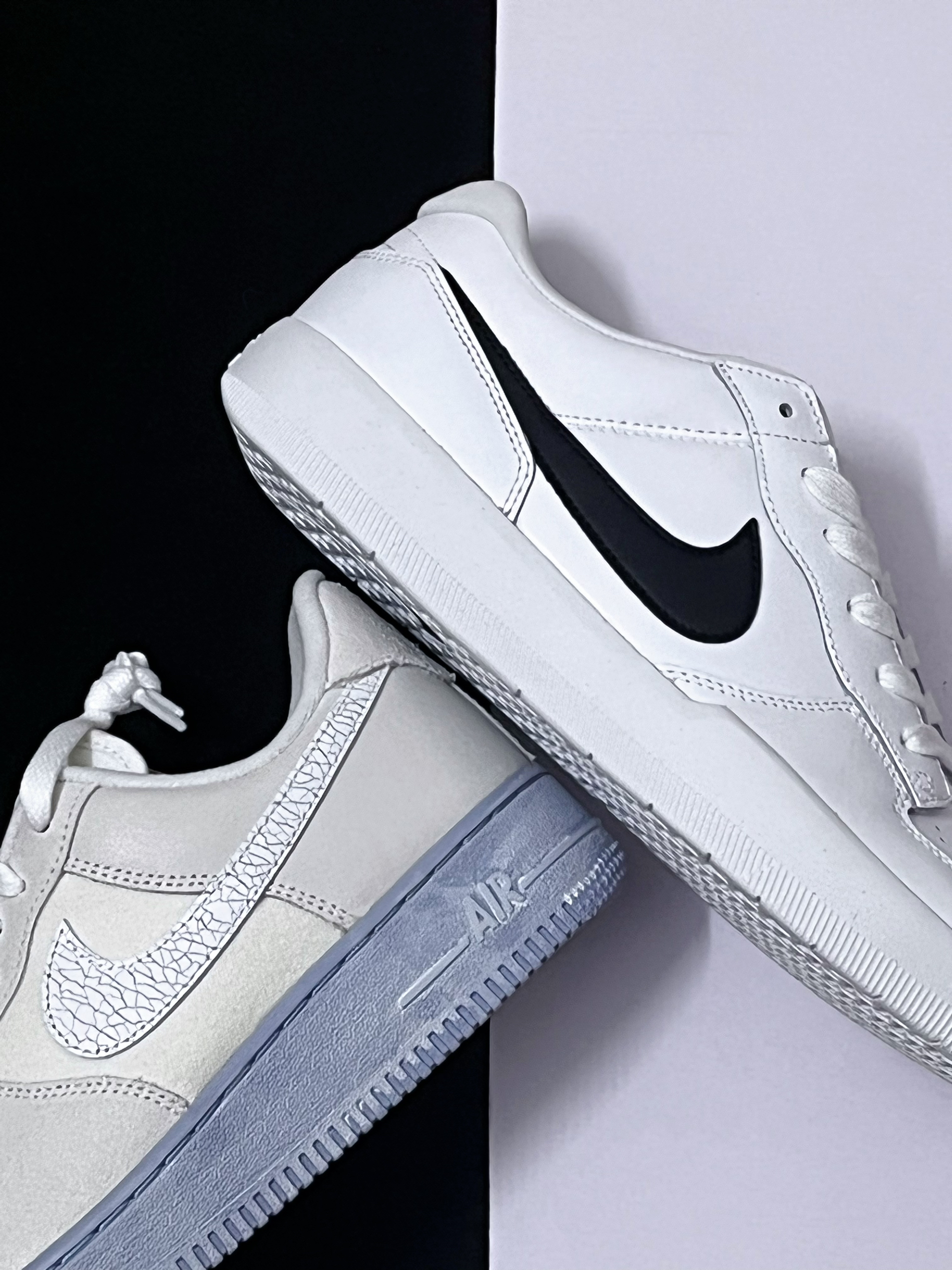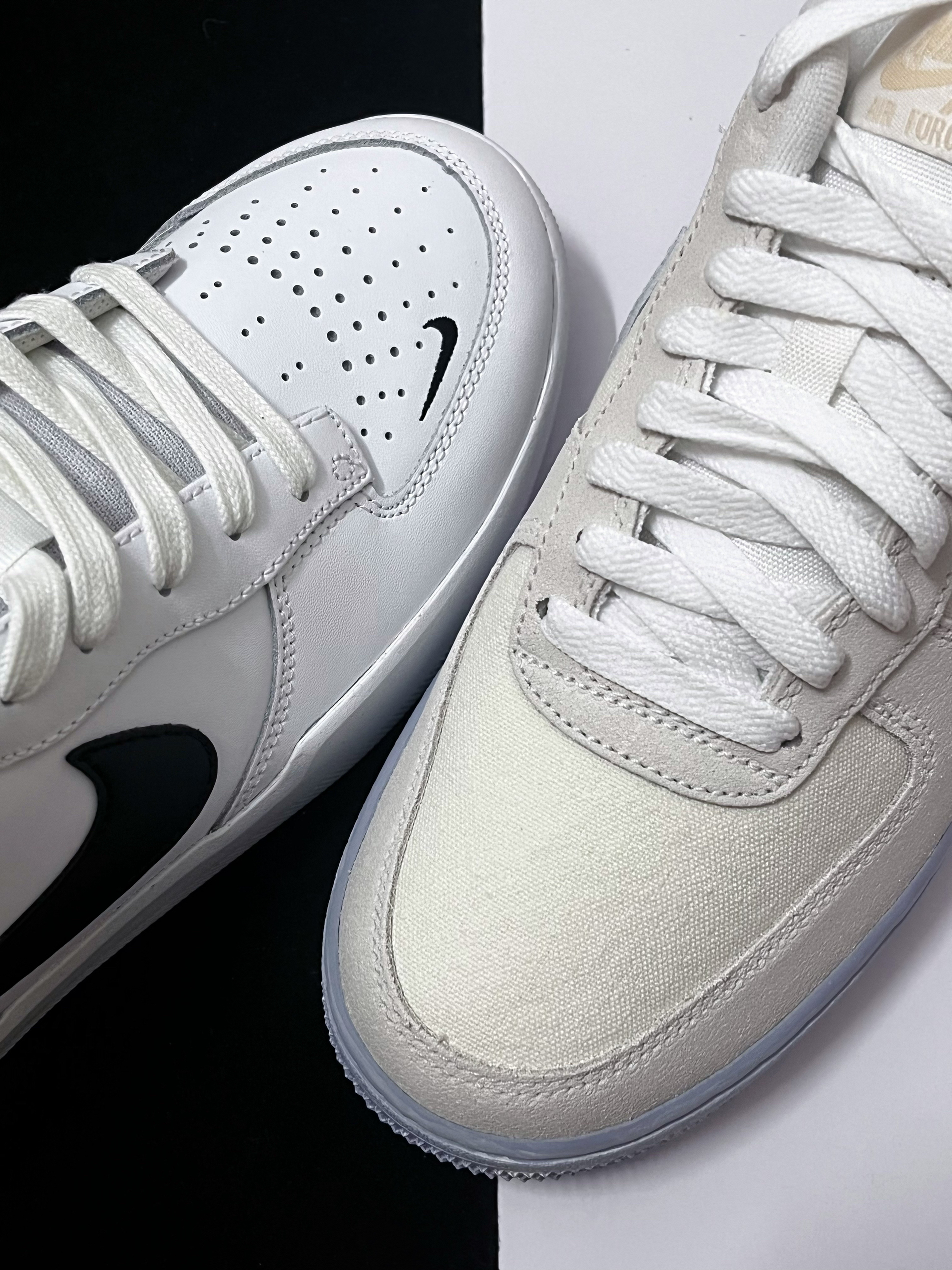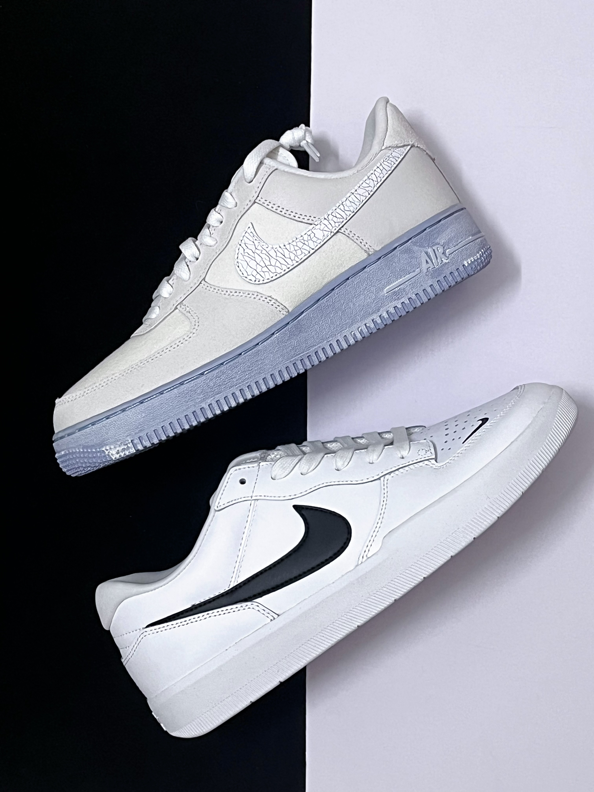 ⚪️今天德鲁大叔为大家分享两款三位数价位的百搭板鞋,AF1冰蓝与Force 58黑白板鞋。 ⚪️首先是这一双Force58黑白板鞋,它的鞋面材质为白色皮革,鞋底厚度比空军一号稍微薄一点,不过鞋舌方面比空军一号厚实,上脚的包裹感很不错。 ⚪️其次是这一双AF1冰蓝,它的材质有点特别,是这种挺复古的帆布材质,日常穿着不容易留下褶皱,质感方面更到位。 ⚪️这两款板鞋的价位普遍在400-500+,性...