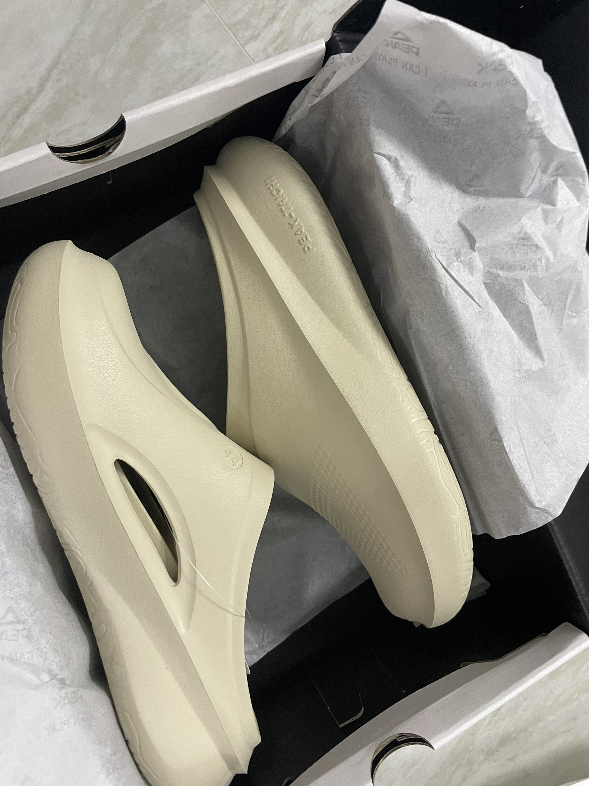 之前不知道是在哪里刷到,觉得这个外观挺好看的就种草了,等了几天终于到货。说说感受,鞋子的码数很迷,说偏小要拍大一码,我平时穿43的,拍了44的发现大很多(图4),然后花了几天退换货,改成43的(图5),发现还是大,懒得继续换了。挺喜欢匹克这个外观 的,拖鞋挺舒服的,偏重。