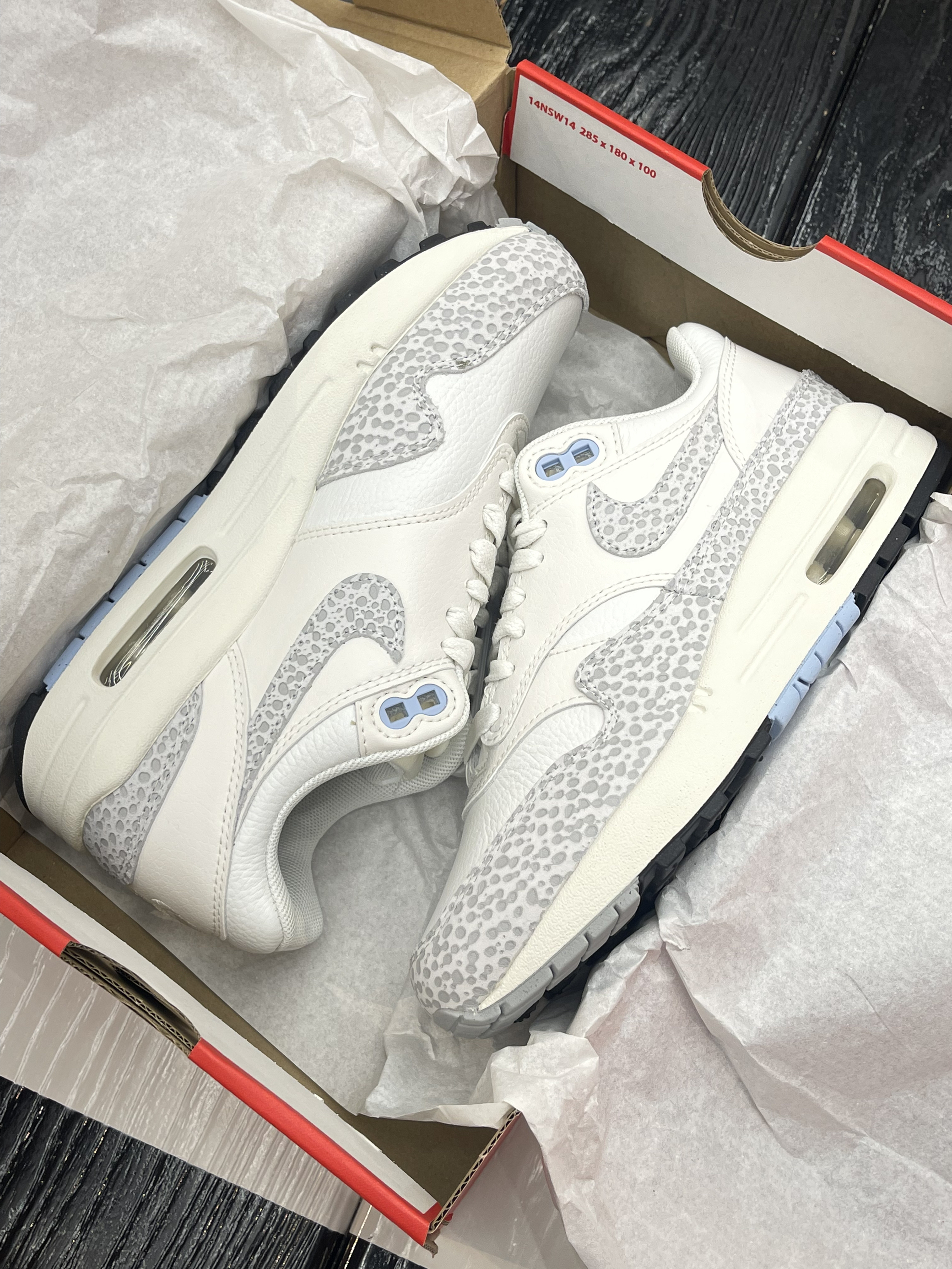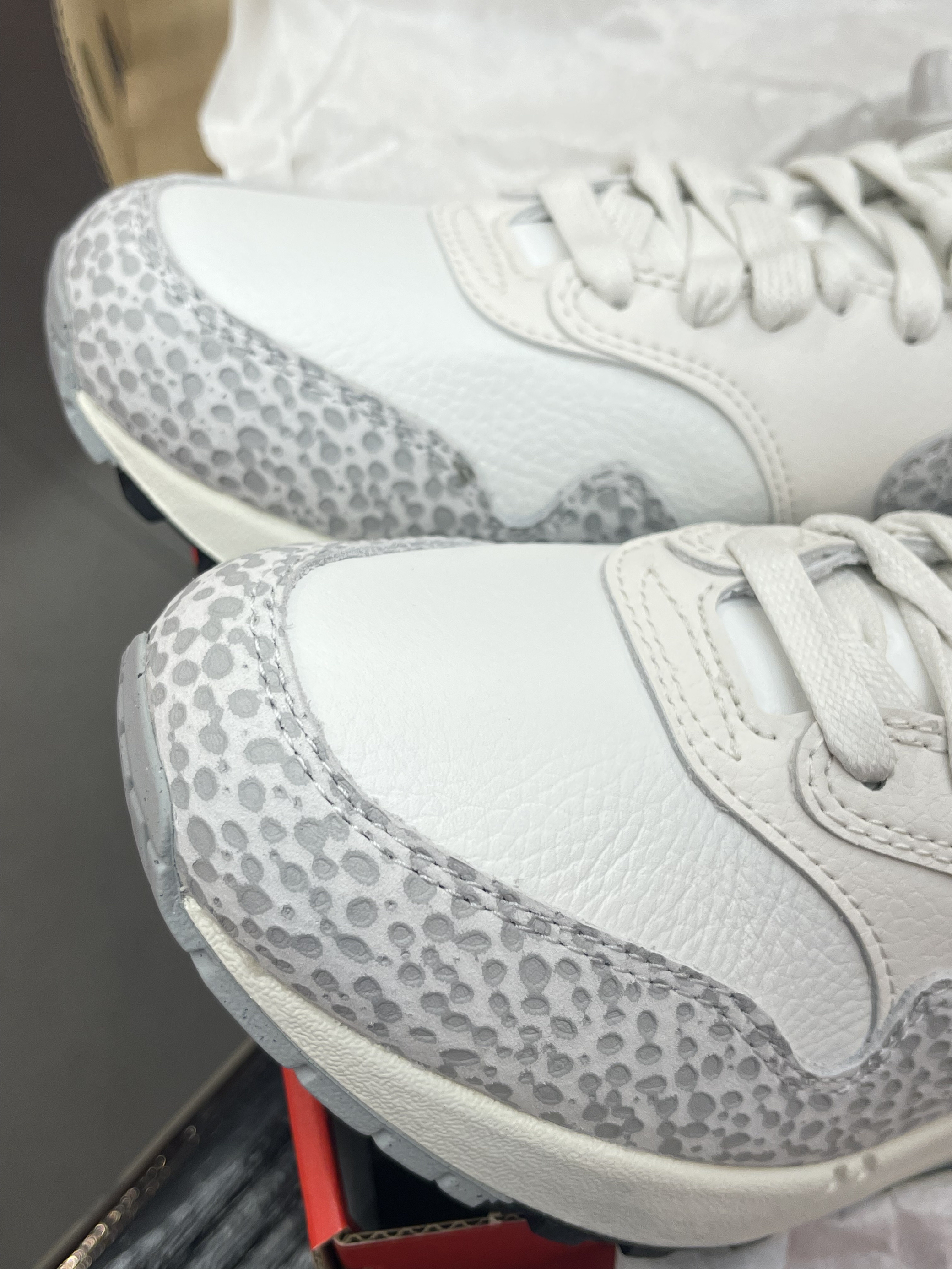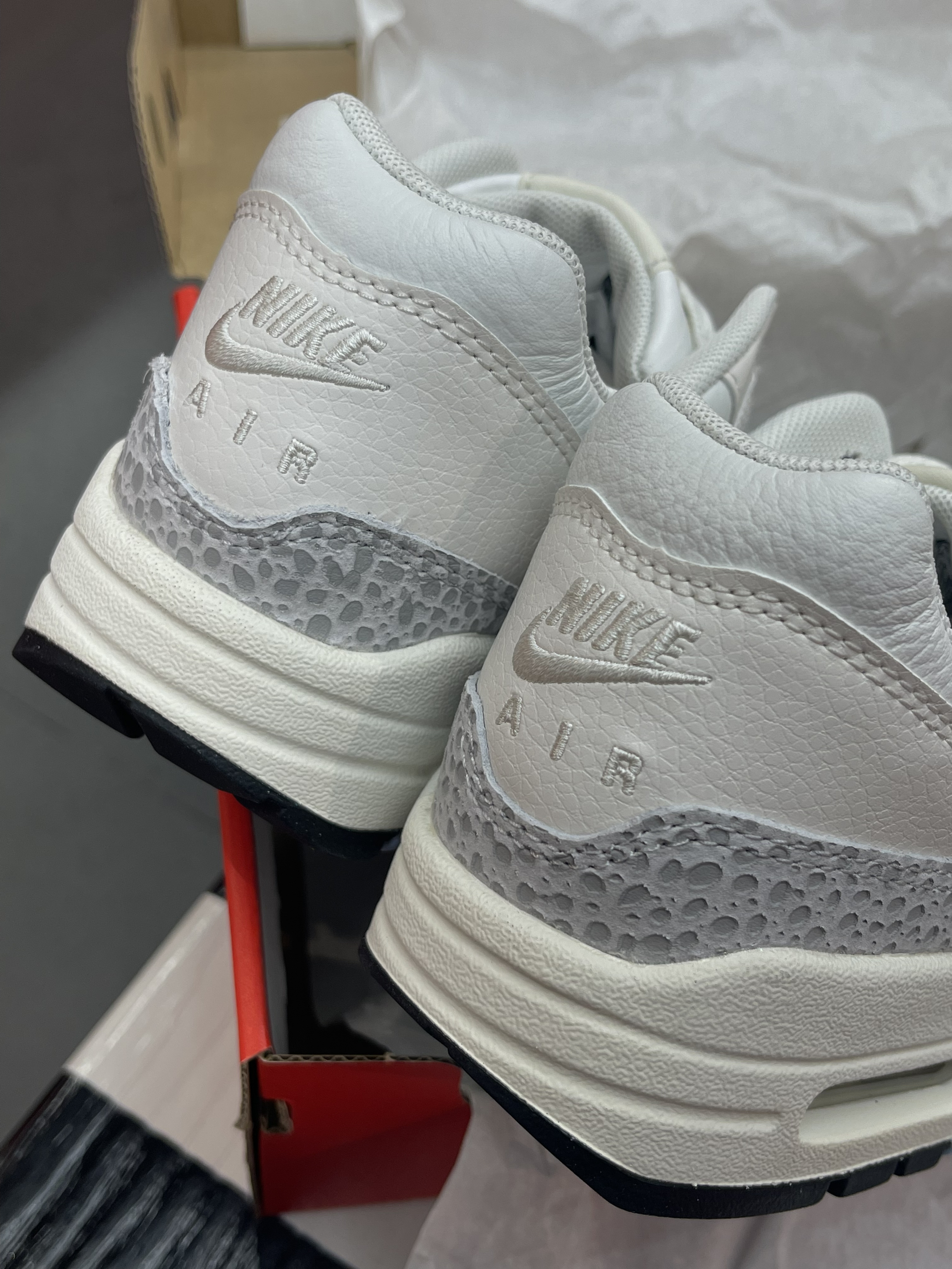 在国外很惹火的Air Max 1在国内似乎没有那么抢手,这下自穿党有福啦~😆 Nike|Air Max 1 Safari "Summit White"低帮休闲鞋“灰白色”,经典复古的Air Max 1鞋型,百搭又增高。灰白色三种柔软皮革拼接搭配,点缀狩猎印花,整体层次感十足。软弹厚实的中底➕可视化气垫,脚感十足的同时妥妥增高神器!😍