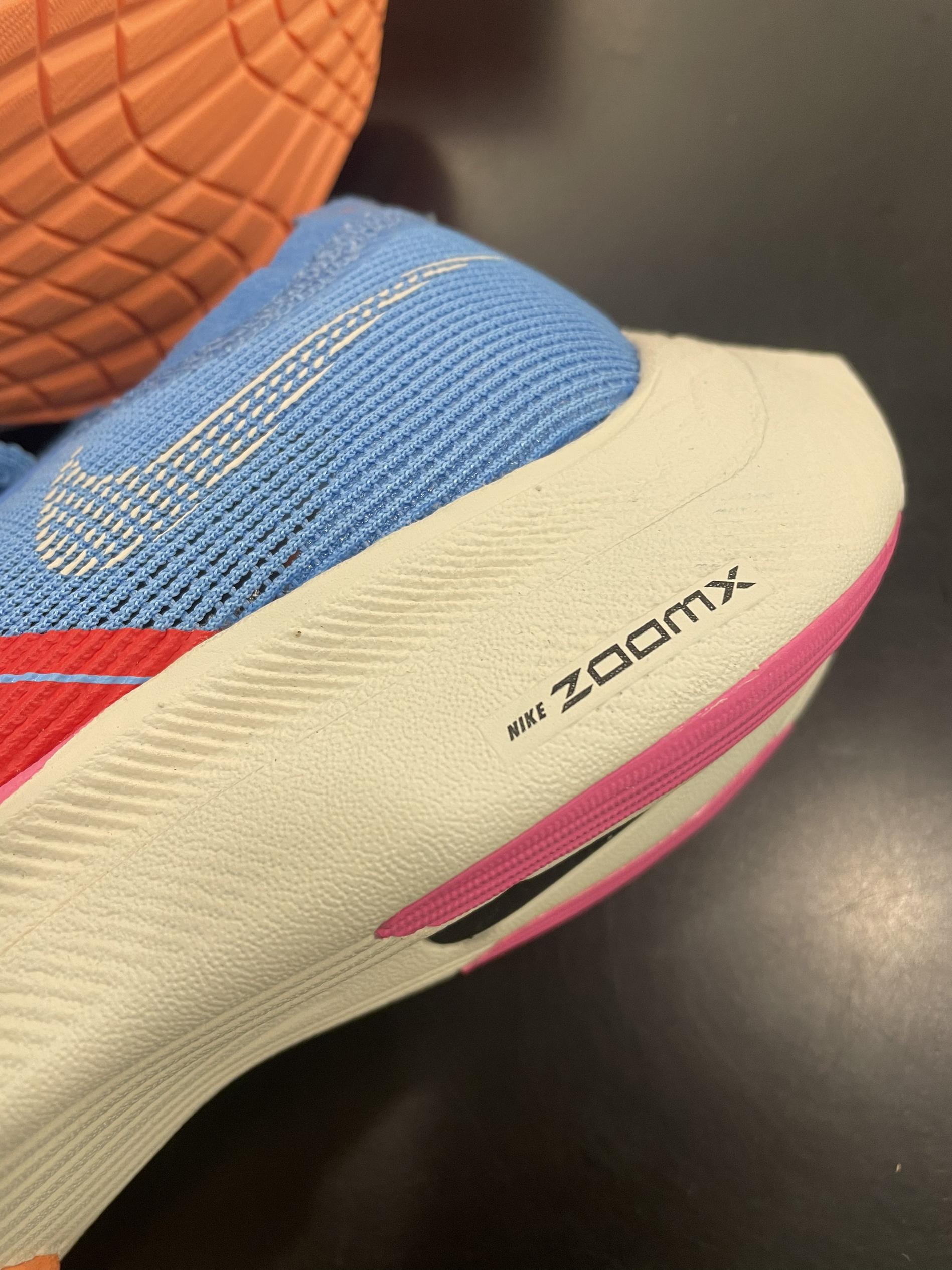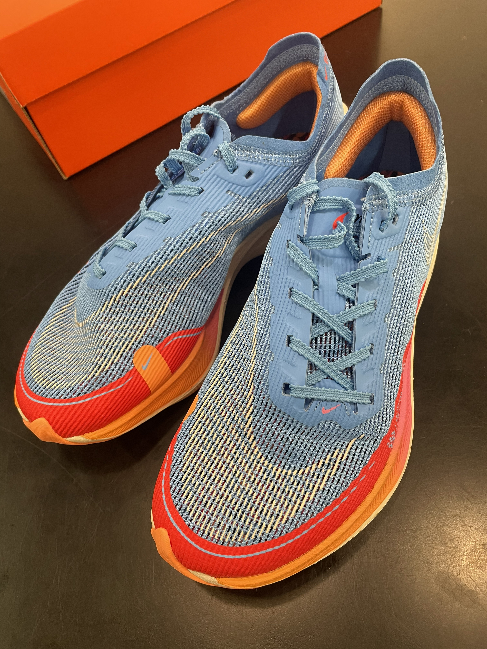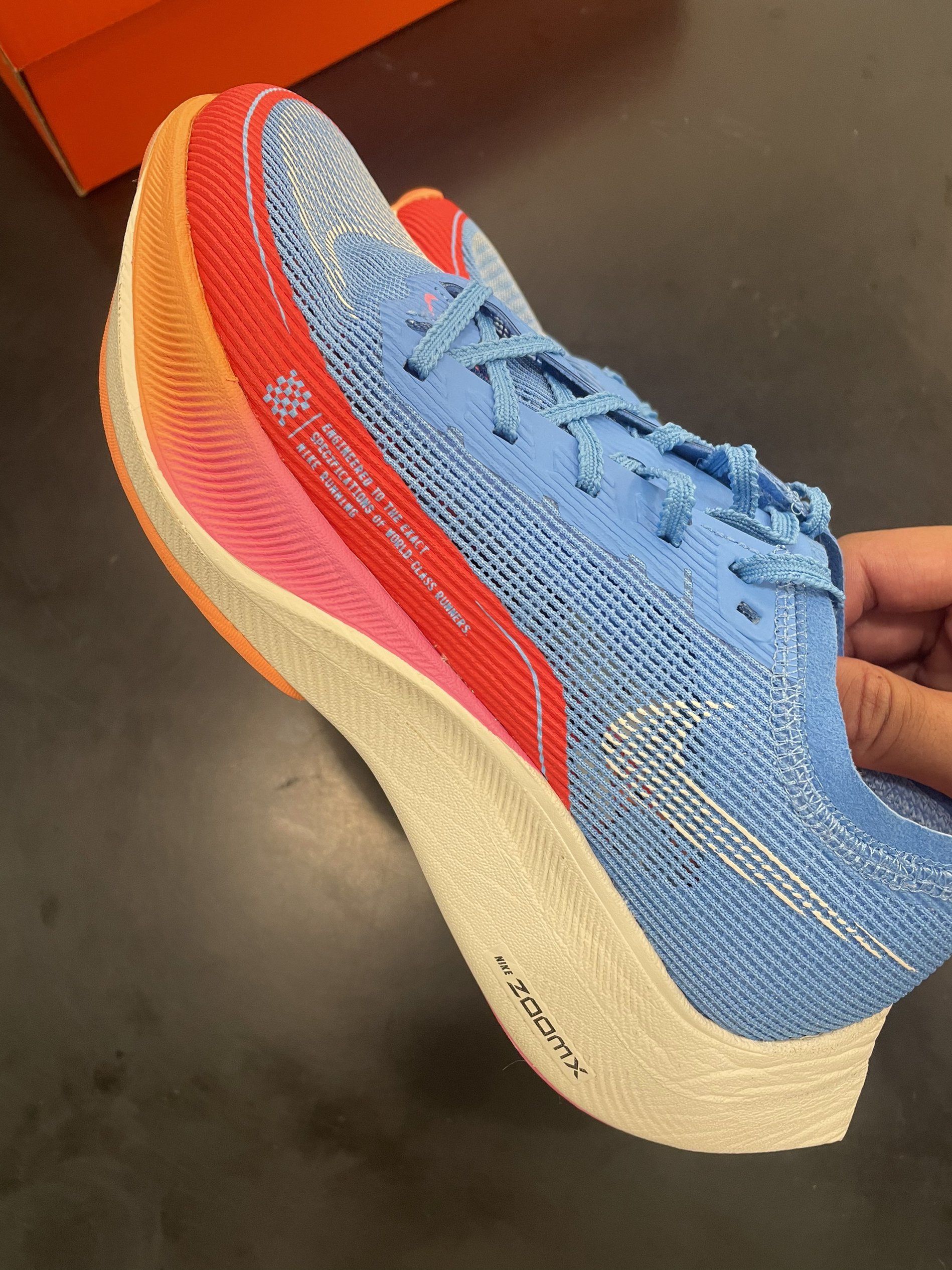 Nike ZoomX Vaporfly Next% 2 “For Future Me” 蓝红 编织鞋面加前掌半圈热熔胶补强,鞋面兼顾支撑与透气性。中底全掌ZoomX科技,脚感相当澎湃,踩屎感非常非常明显。中底还加了一块超大的碳板,跑起步来助推感明显,加上极低的重量,让你感受不到脚上穿了鞋,可以健步如飞⁉️ 这双马拉松跑鞋非常不错,但还是有一些局限性⚠️ 不适合日常通勤穿着,碳板刚性太...