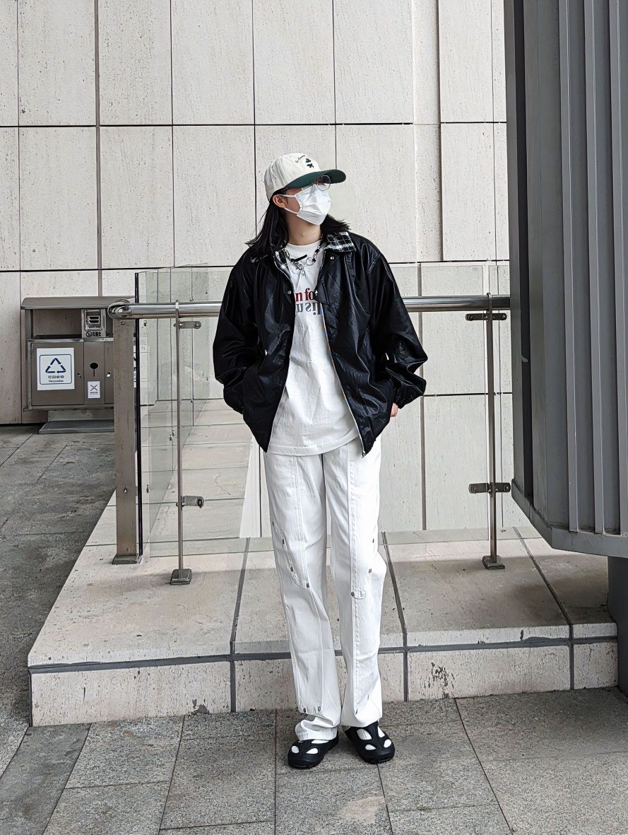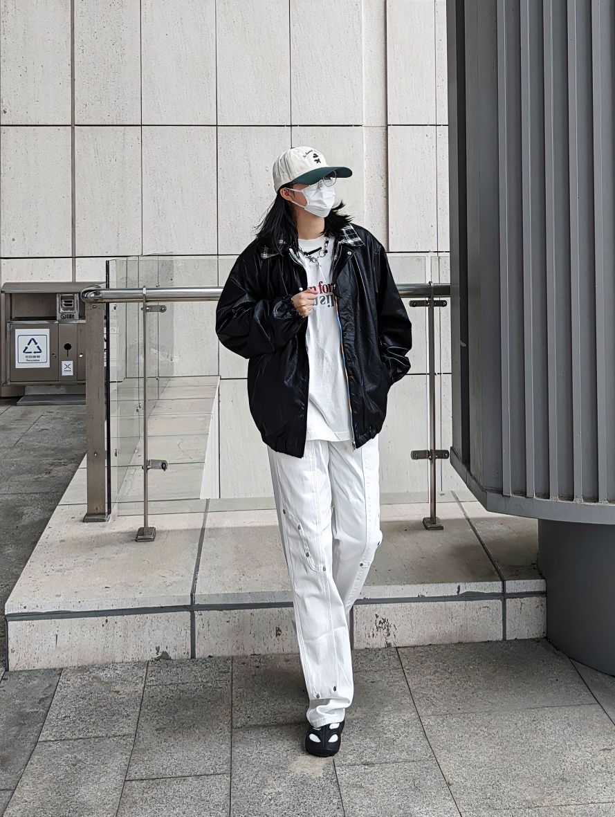 大家好,这里是舟粥 165/53kg 喜欢朋克风的小伙伴们看过来 今年的流行趋势再次转向了皮衣,搭配一条铆钉白色长裤 帅到没朋友