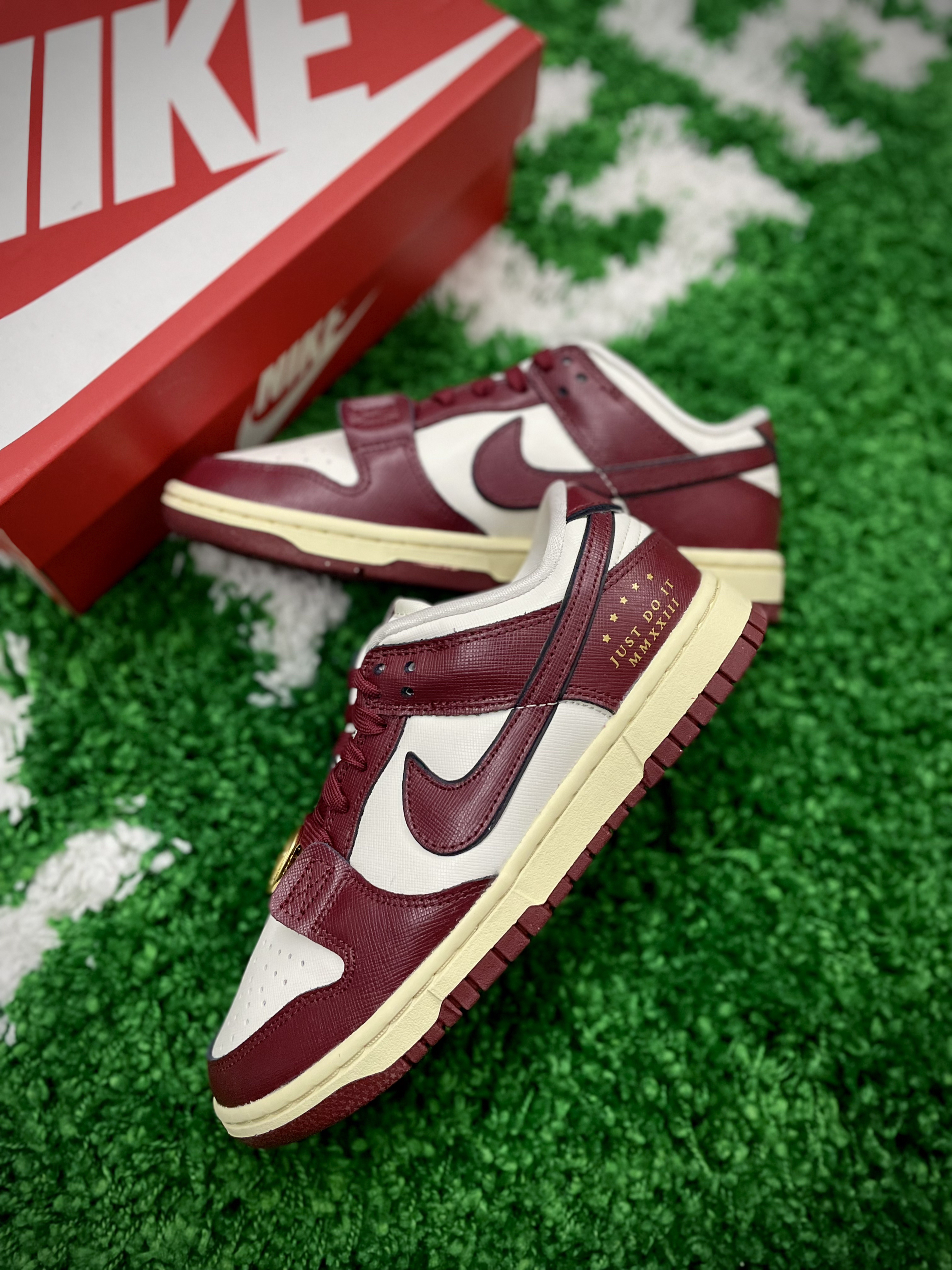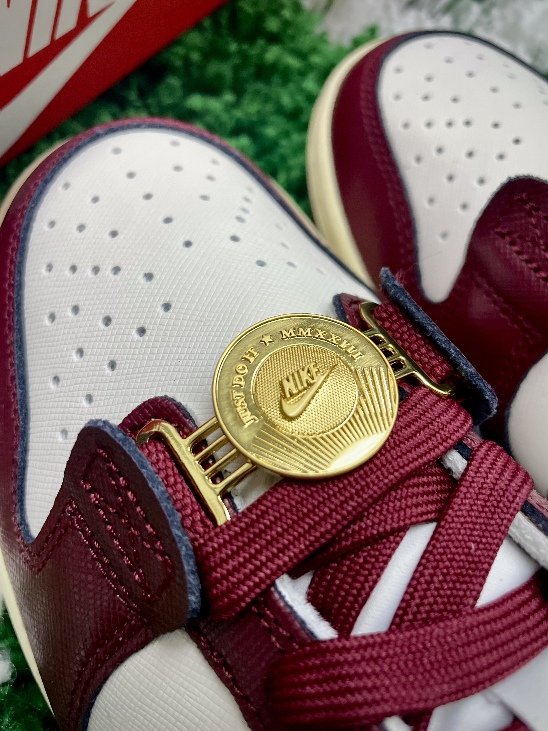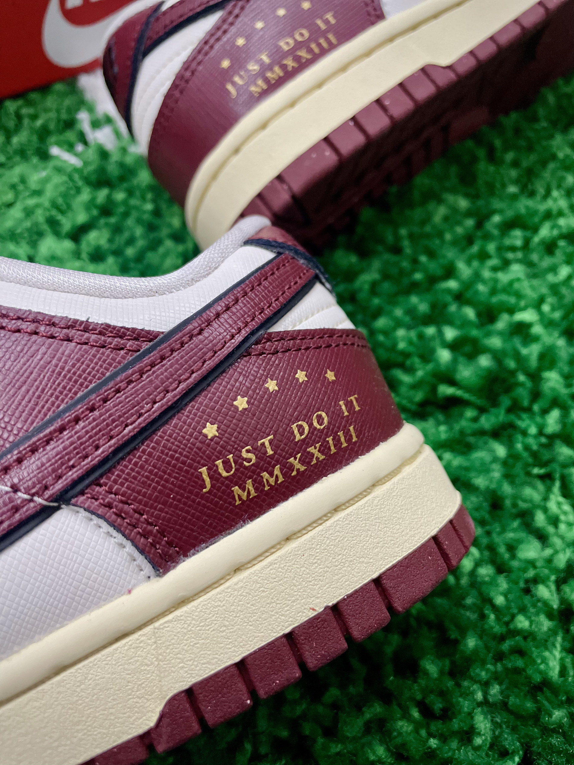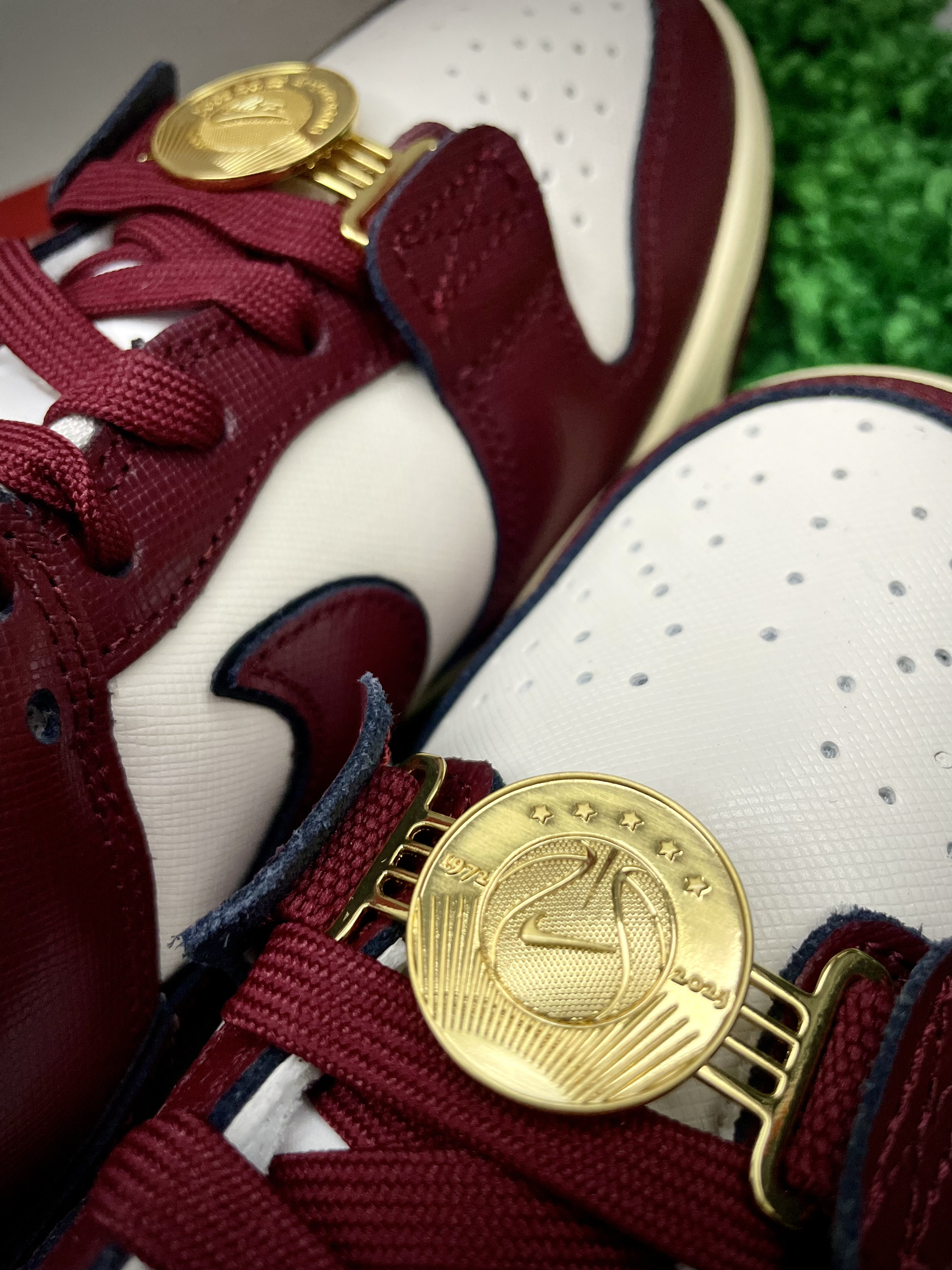 🍷酒红色的dunk ⚜️前面有两颗不一样的金色鞋带扣 后跟也烫了金色文字 整体中规中矩吧 皮质一般般,个人不是很喜欢这个皮质 不过这种皮应该很耐脏和放水 喜欢这种带小配饰的可入