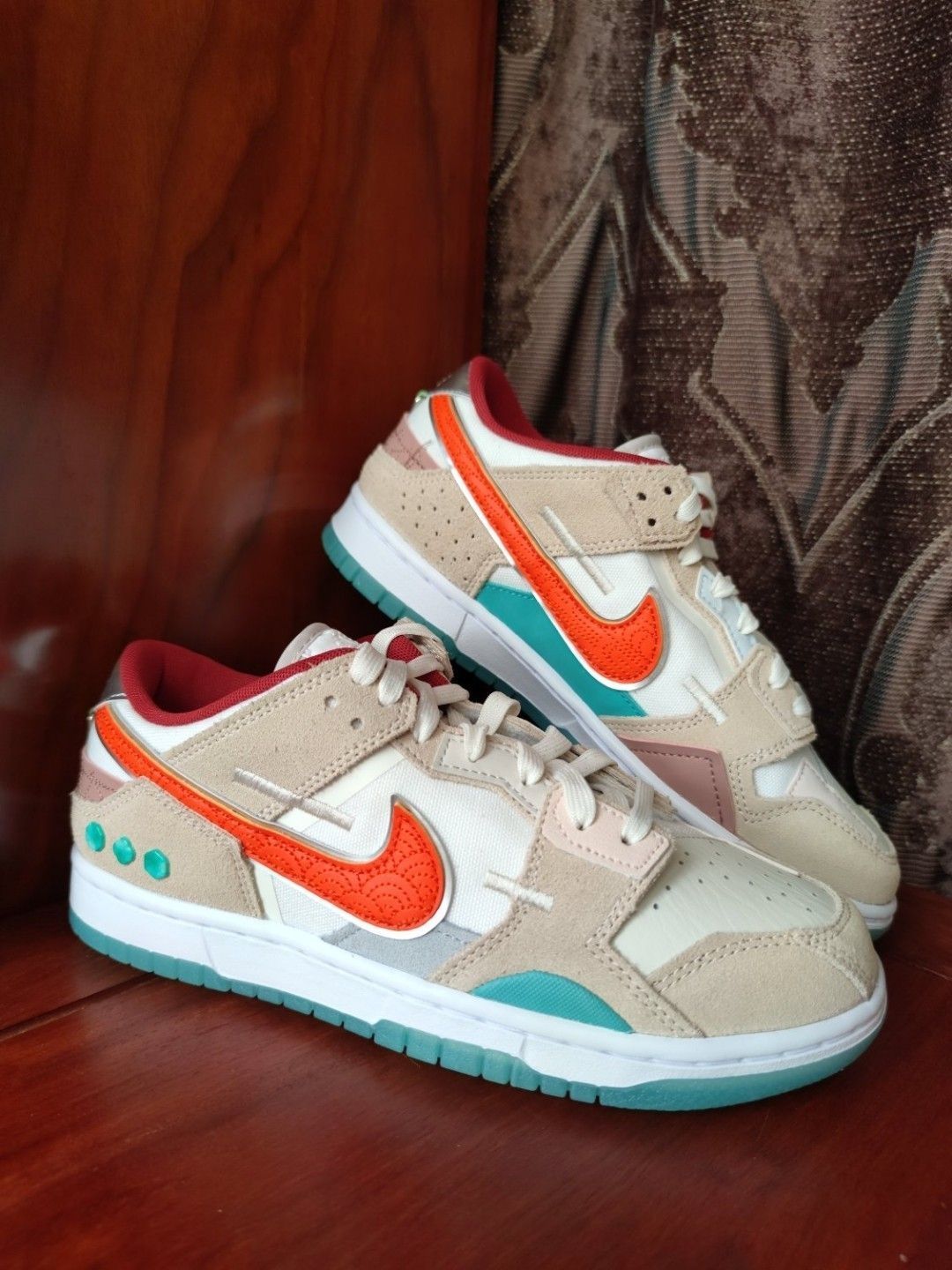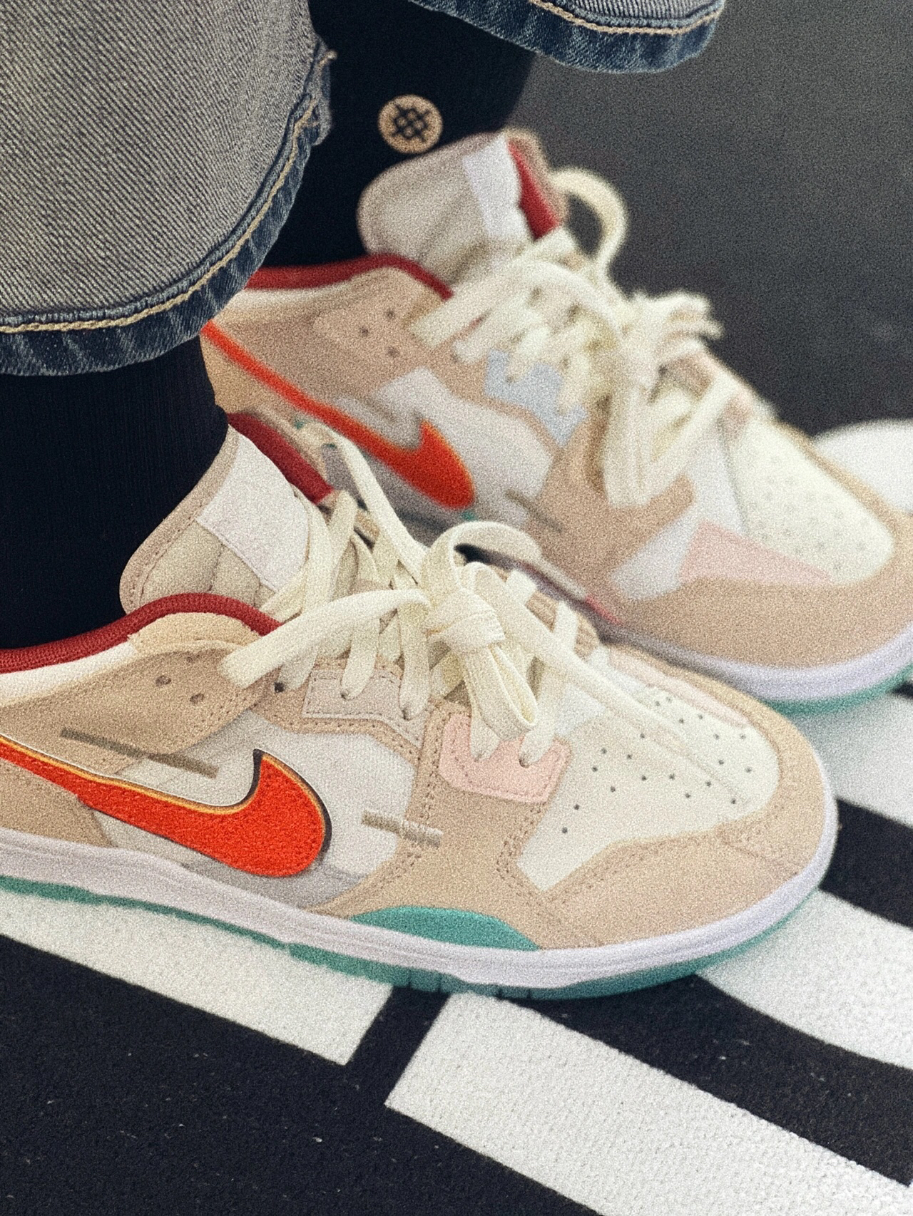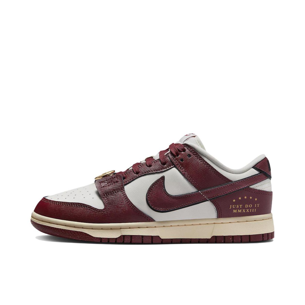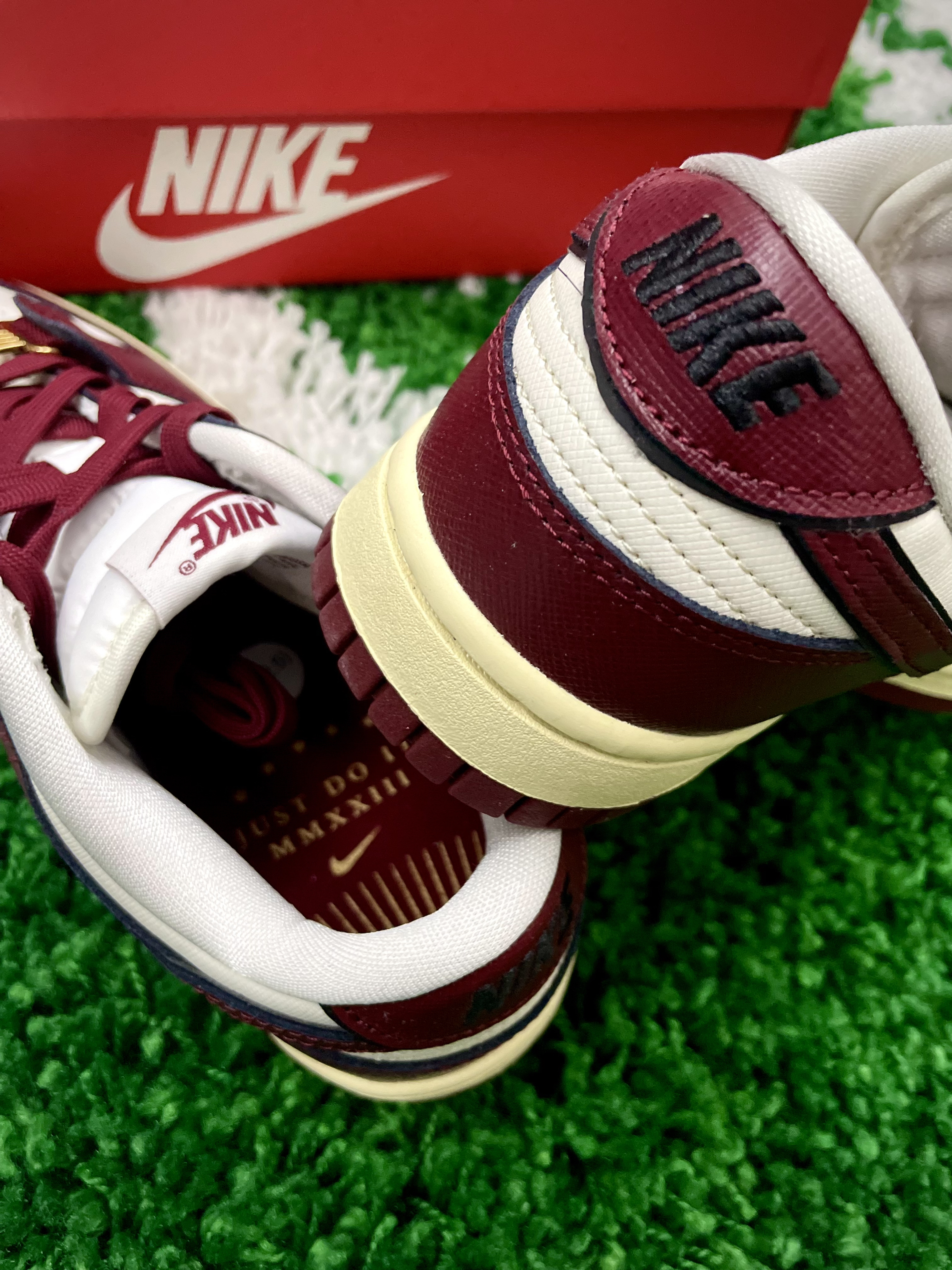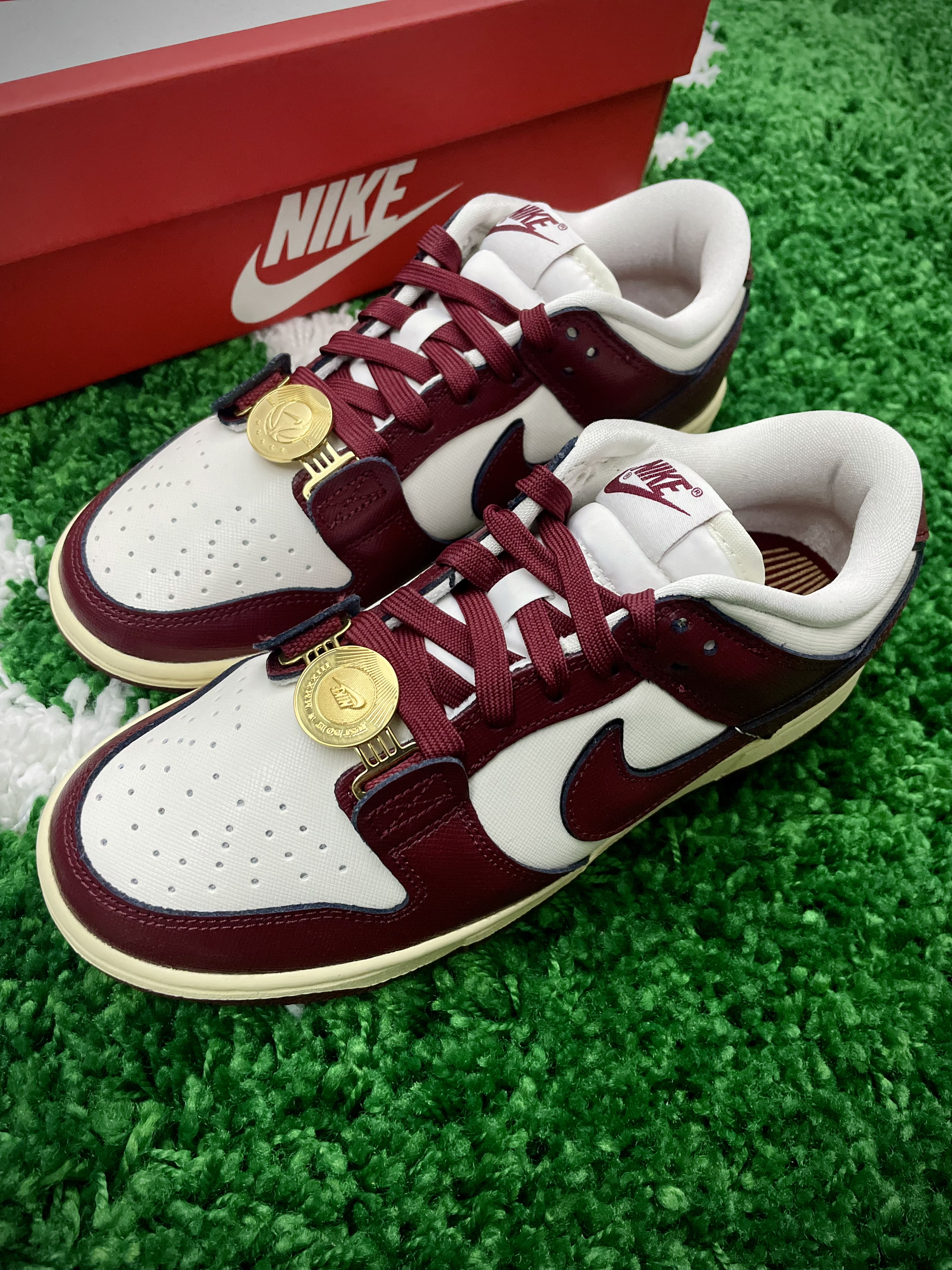 🍷酒红色的dunk ⚜️前面有两颗不一样的金色鞋带扣 后跟也烫了金色文字 整体中规中矩吧 皮质一般般,个人不是很喜欢这个皮质 不过这种皮应该很耐脏和放水 喜欢这种带小配饰的可入