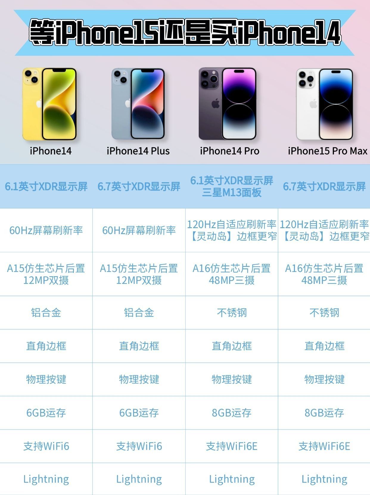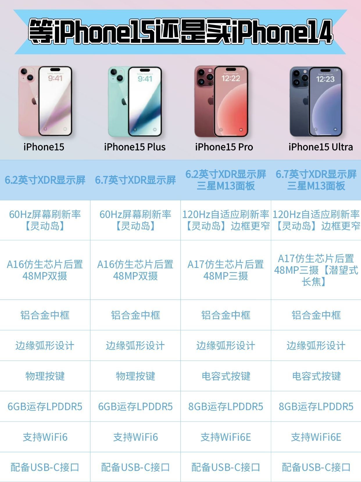 9月多份就要发布iPhone15了,很多小伙伴已经急不可耐了,现在iPhone14系列价格也降了很多,那到底是买iPhone14系列划算还是等iPhone15呢,让我们来对比一下,究竟是买iPhone14系列还是iPhone15系列。 - 一.iPhone15和iPhone14的区别 1️⃣iPhone15全系列上了灵动岛。 2️⃣接口全部换成USB-C接口。 3️⃣iPhone15 Pro和iP...