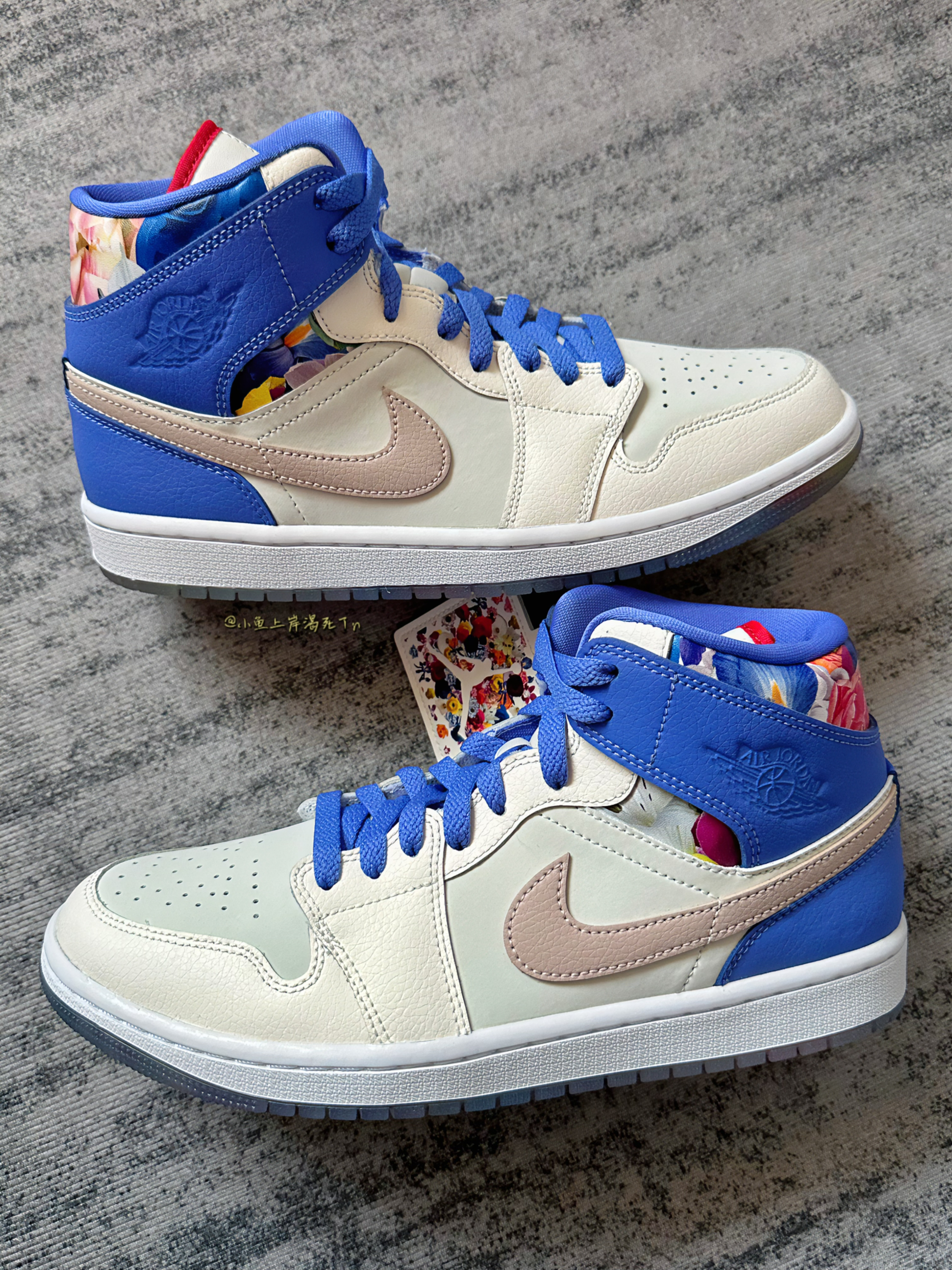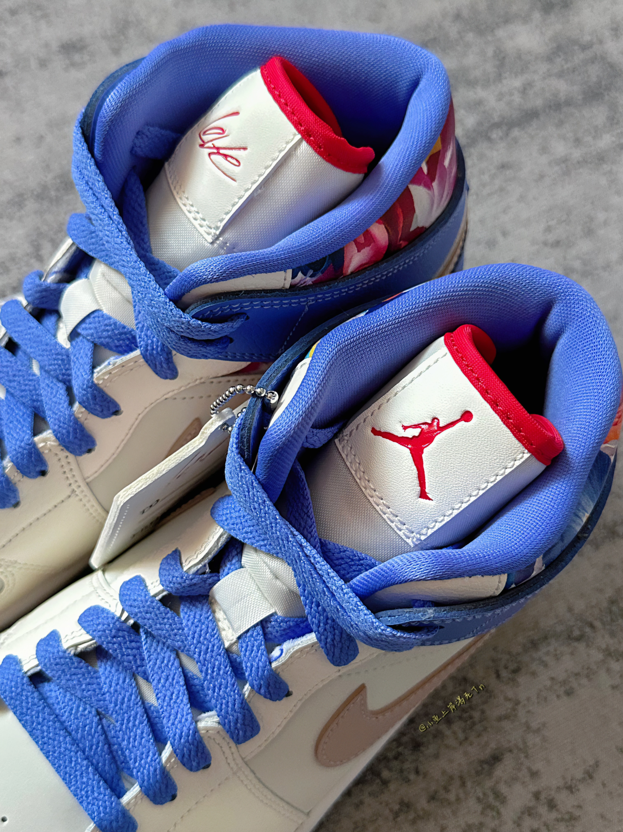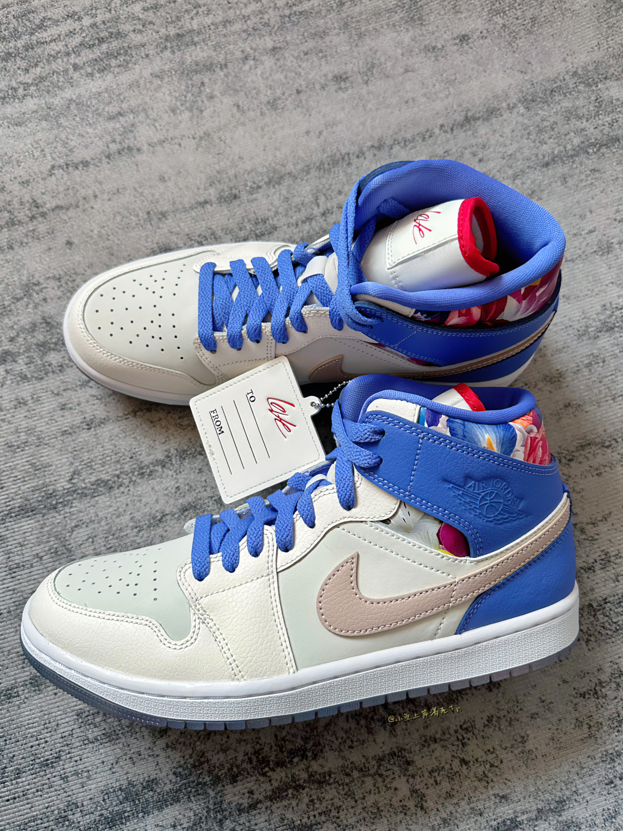 哈喽 小鱼🐟来喽! 今天给大家推荐分享这双aj1 mid 情人节限定 这款我觉得是最美的aj1 满满的浪漫气息 鞋面牛皮革拼接合成革 质感还是不错的 后跟的花卉印花很亮眼 鞋舌一边是飞人logo一边是 love 还送一个小卡牌 满满的送礼仪式感 hhh 水晶大底 里面还带花卉设计 真的很美 马上七夕节啦!送女友搭配情侣鞋都是很不错的