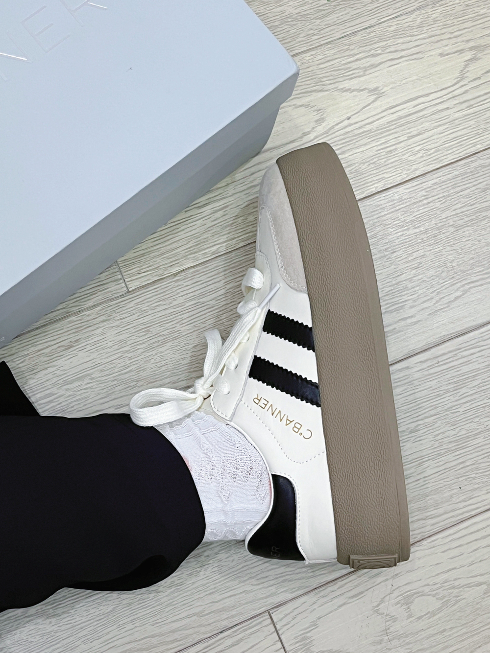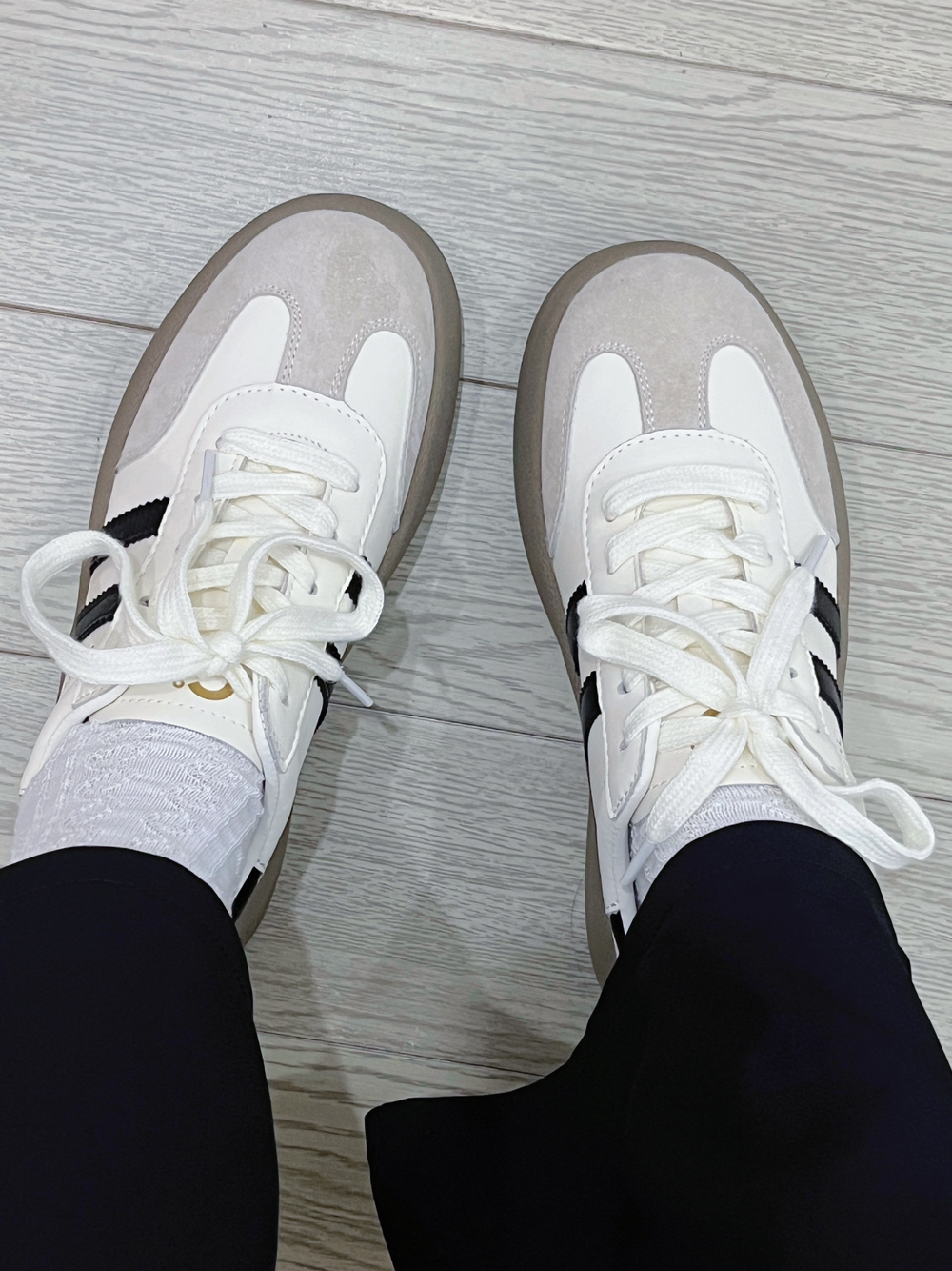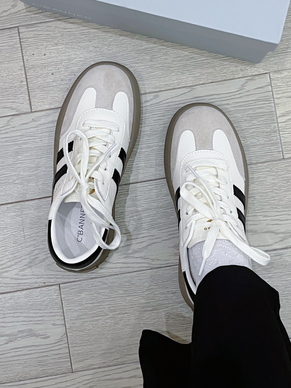 丸子🍡冻冻来分享❣️ 今天分享的就是这双非常🈶复古风的板鞋啦 这双板鞋和德训鞋还蛮像的🎉 鞋面是皮革和麂皮的拼接设计 看上去看上去很有质感💓 鞋底还是那种防滑材质的橡胶底 很舒服👍🏻 搭配黑色裤子都能很好看的程度怎么会不爱呢