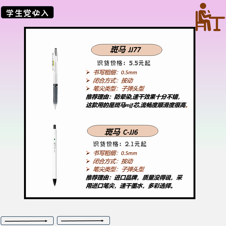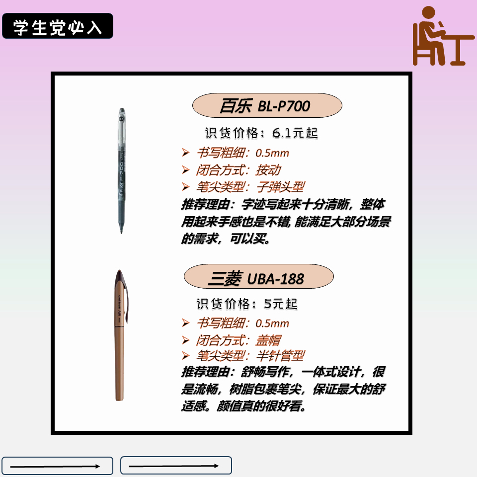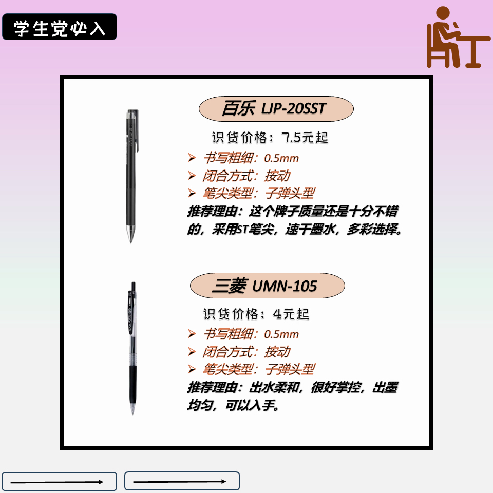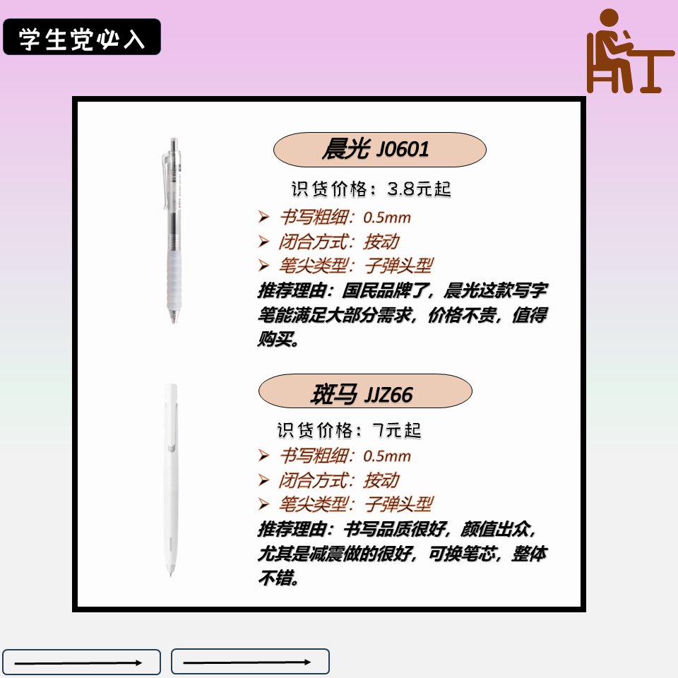 作为一名学生👨🎓👨🎓免不了要有大大小小的考试,一根好的笔就很重要。流畅与否直接关系到成绩,因为,小编整理了几款写字很不错的写字笔,希望能给为大家做一个参考。👏👏 🌼晨光 J0601 国民品牌了,晨光这款写字笔能满足大部分需求,价格不贵,值得购买。 🌼斑马 JJZ66 书写品质很好,颜值出众,尤其是减震做的很好,可换笔芯,整体不错。 🌼百乐 LJP-20SST 这个牌子质量还是十分不错的,...