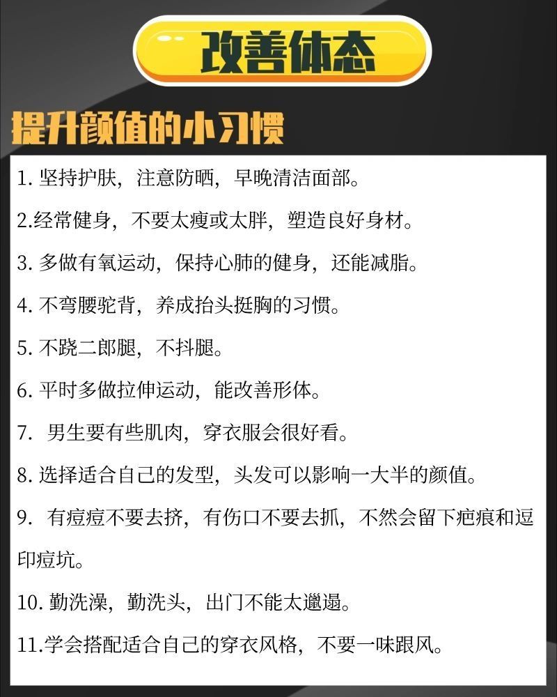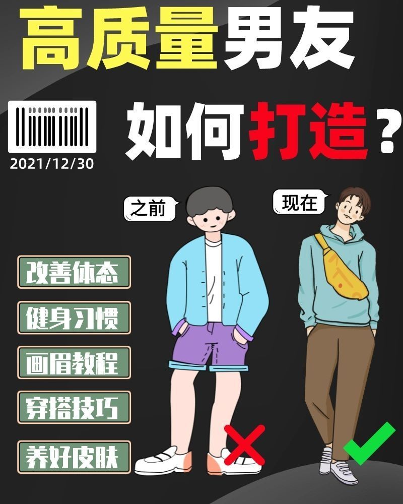 男生改造:高质量男友改造计划✔ 超级有用!超级有用!超级超级有用!! 一直坚持这篇把颜值最大化的变帅思路就能让颜值逆天! 人都要清醒认知人大都是始于颜值,才忠于才华的本质,男女都是视觉动物,已经是个公认的事实,一个漂亮脸蛋的微胖女生、长相普通的气质男生和一个身材标准的痘痘女孩、一米八高的粗糙男生,相信更多的人还是会选择前者。 所以万万不能指望未来对象的目光能够穿透皮囊直击你的内心,坚持以下提升自我...