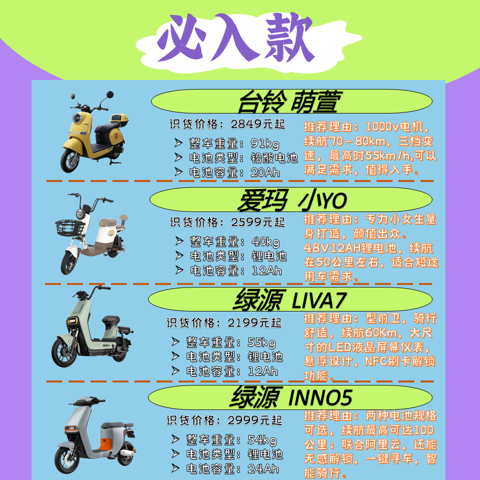 电动自行车作为日常的代步工具,🛵🛵不仅受到了小姐姐们的喜爱,男生也经常骑,好的电动自行车也是不容易选择的,今天小编就为大家整理了几款不同需求的电动自行车,快来看看吧。👀 🌼【必入款】台铃 萌萱 1000v电机,续航70~80km,三档变速,最高时55km/h,可以满足需求,值得入手。 🌼【必入款】爱玛 小YO 专为小女生量身打造,颜值出众。48V12AH锂电池,续航在50公里左右,适合短途用车需...