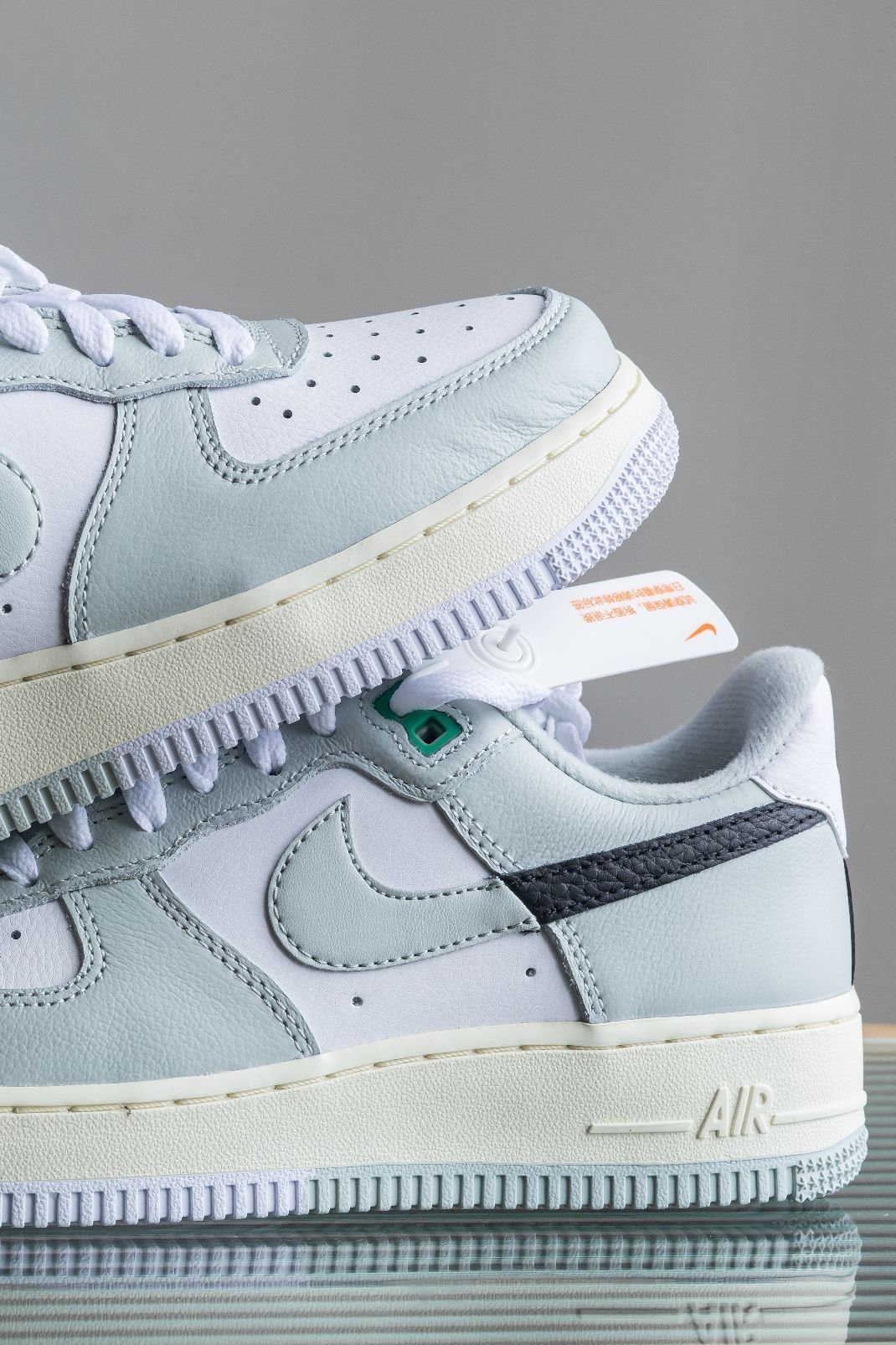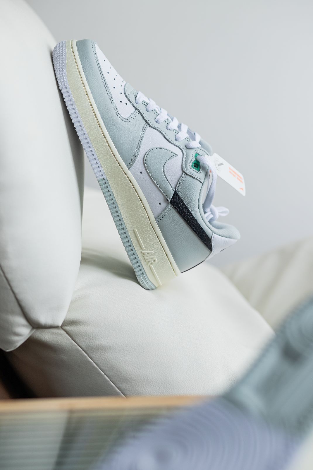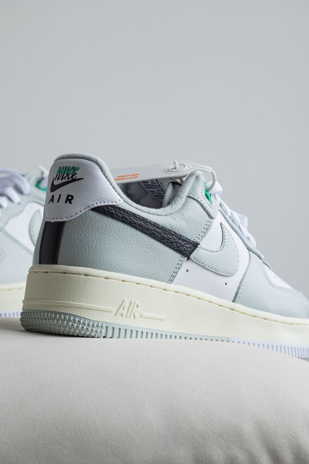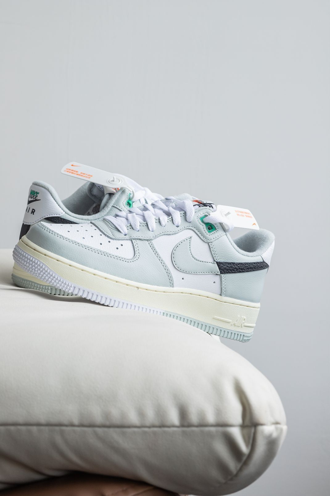 ‼️来了来了!尼克的最新设计AF1他来了~ 〰️ 拿到实物的第一感觉肯定是鞋面大面积的莫兰迪灰绿色带来的典雅和小清新感~不得不说配色真的很加分! 〰️ Swoosh的拼勾设计已经不是头一次了,开始我还以为黑色是马毛材质,这次采用的是荔枝皮+光面皮,作为男鞋这个深色系点缀很boy~ 〰️ 鞋子的中底奶黄色做旧,外底则是呼应鞋面的灰绿。 〰️ 本次做工还是很不错,肉眼可见的细节处理~为了呼应整个鞋子的...