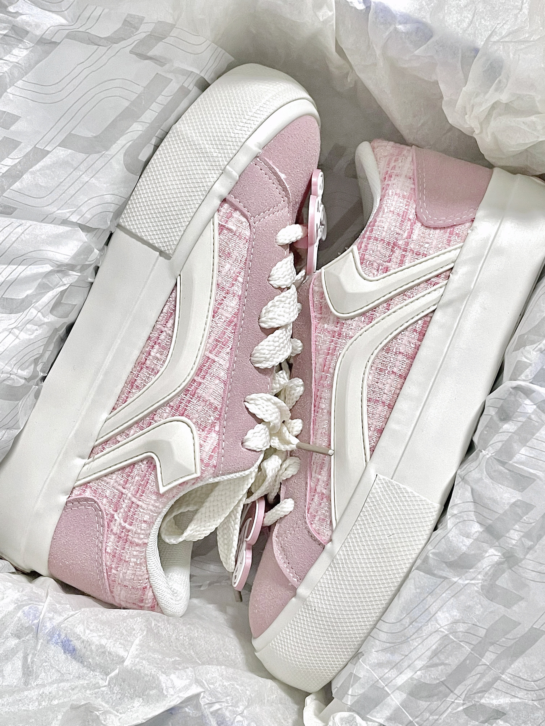 粉粉嫩嫩 侧面是小香风的和我的kitty酱就很搭! 是小公举的鞋子没跑了~ 最喜欢的就是鞋带上面的小挂件了 有特色 很有个性 踩上去软软的 关键价格不过百也