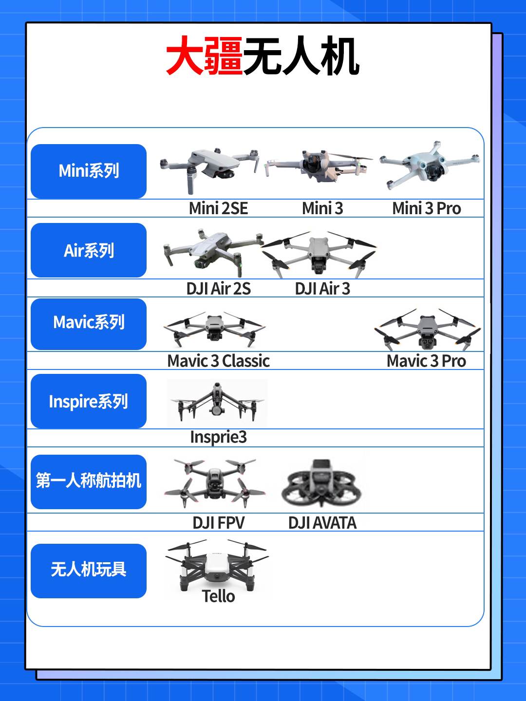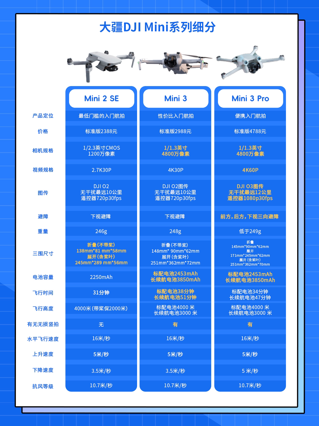 ✈️入门航拍——Mini系列(全系主打便携,机身重量均低于249g) ✅DJI Mini 2 SE:在售航拍用无人机价格最低,白天画质凑合,夜拍不行,适合尝鲜体验。 ✅DJI Mini 3:画质提升,且续航能力提升,可换长续航电池,支持无损竖拍,适合对画质有略高要求同时预算有限的用户。 ✅DJI Mimi 3 Pro:升级前后下三向避障,飞行相对更加安全,同时图传升级,遥控器图传画质有提升。 ❗M...
