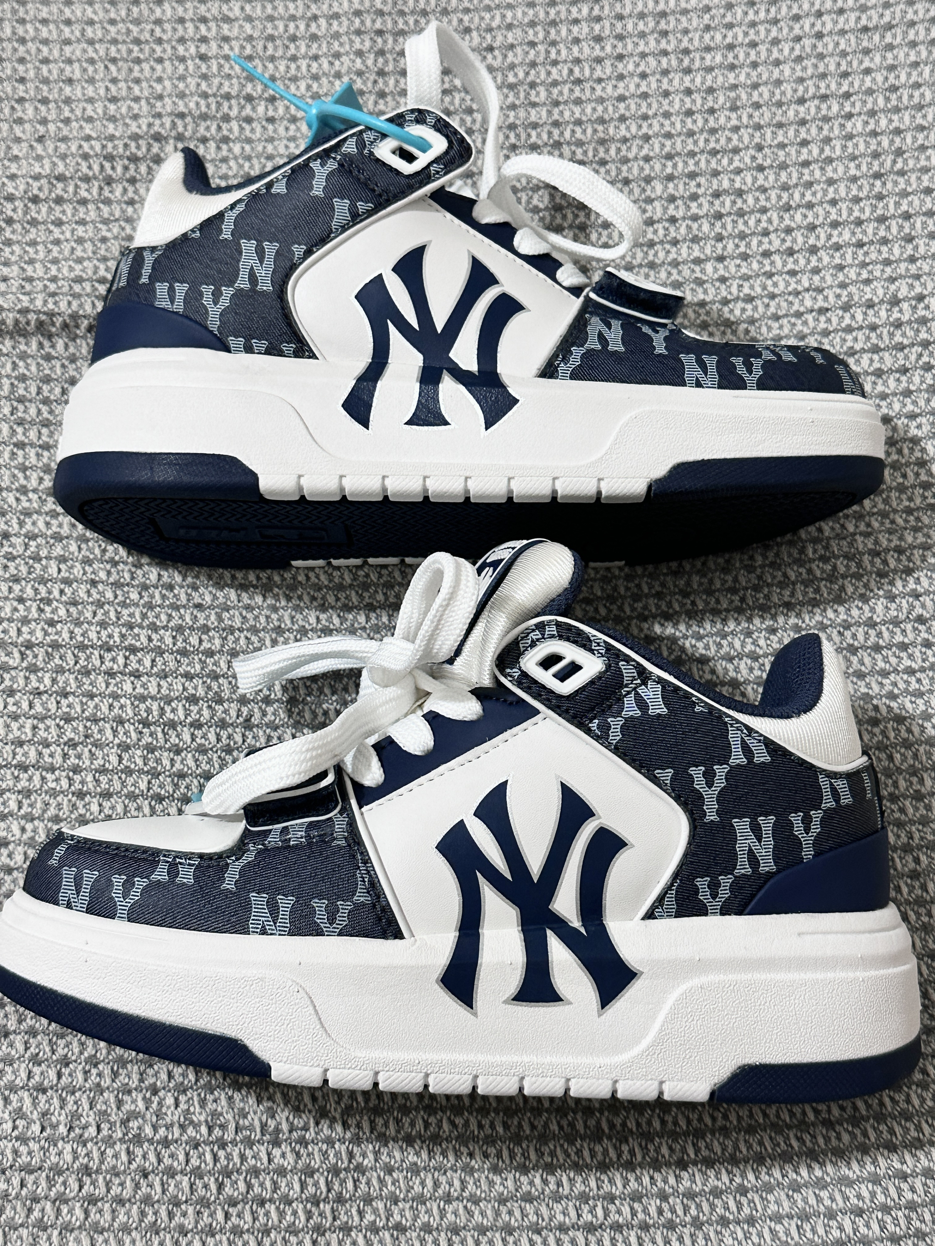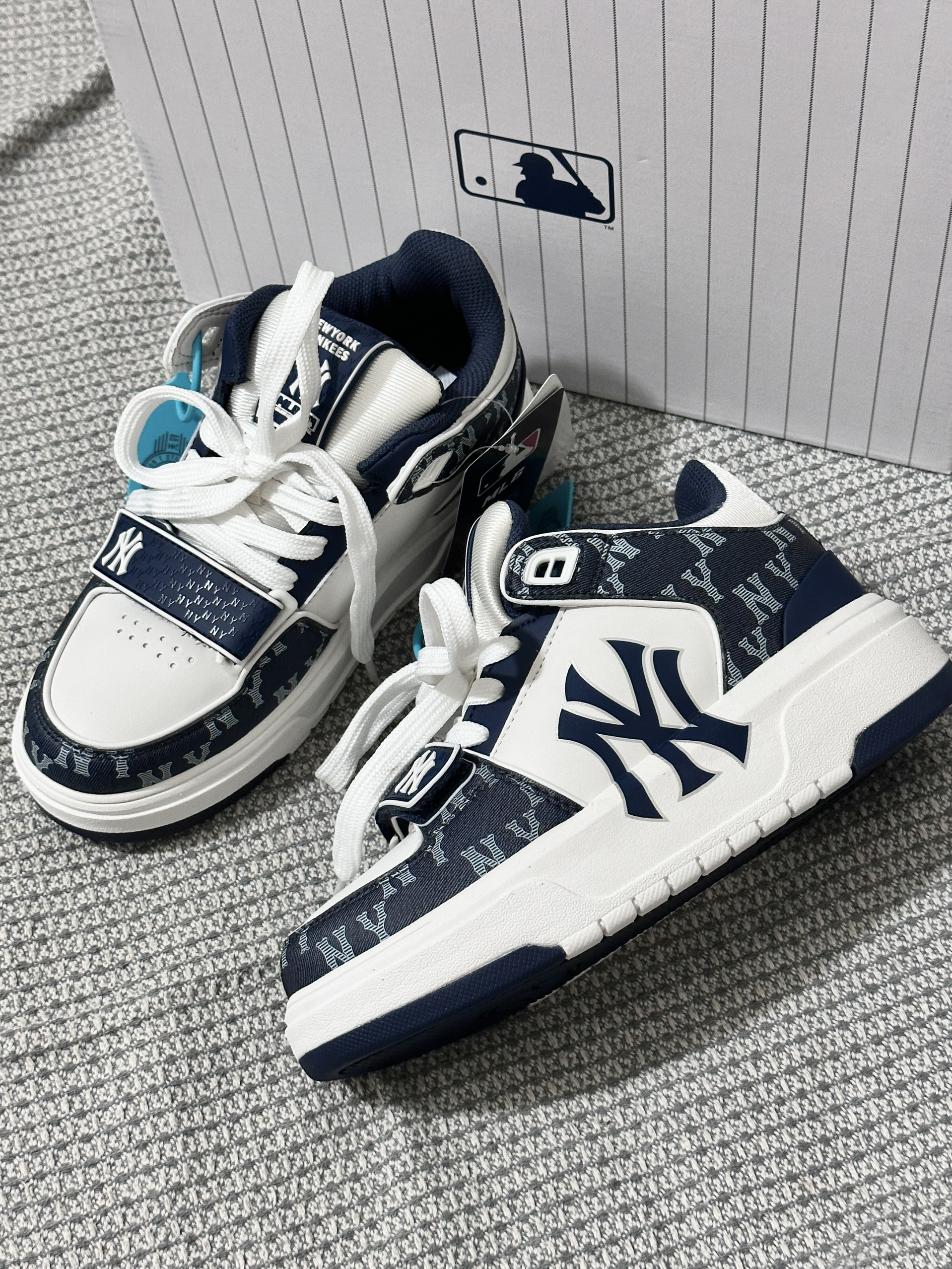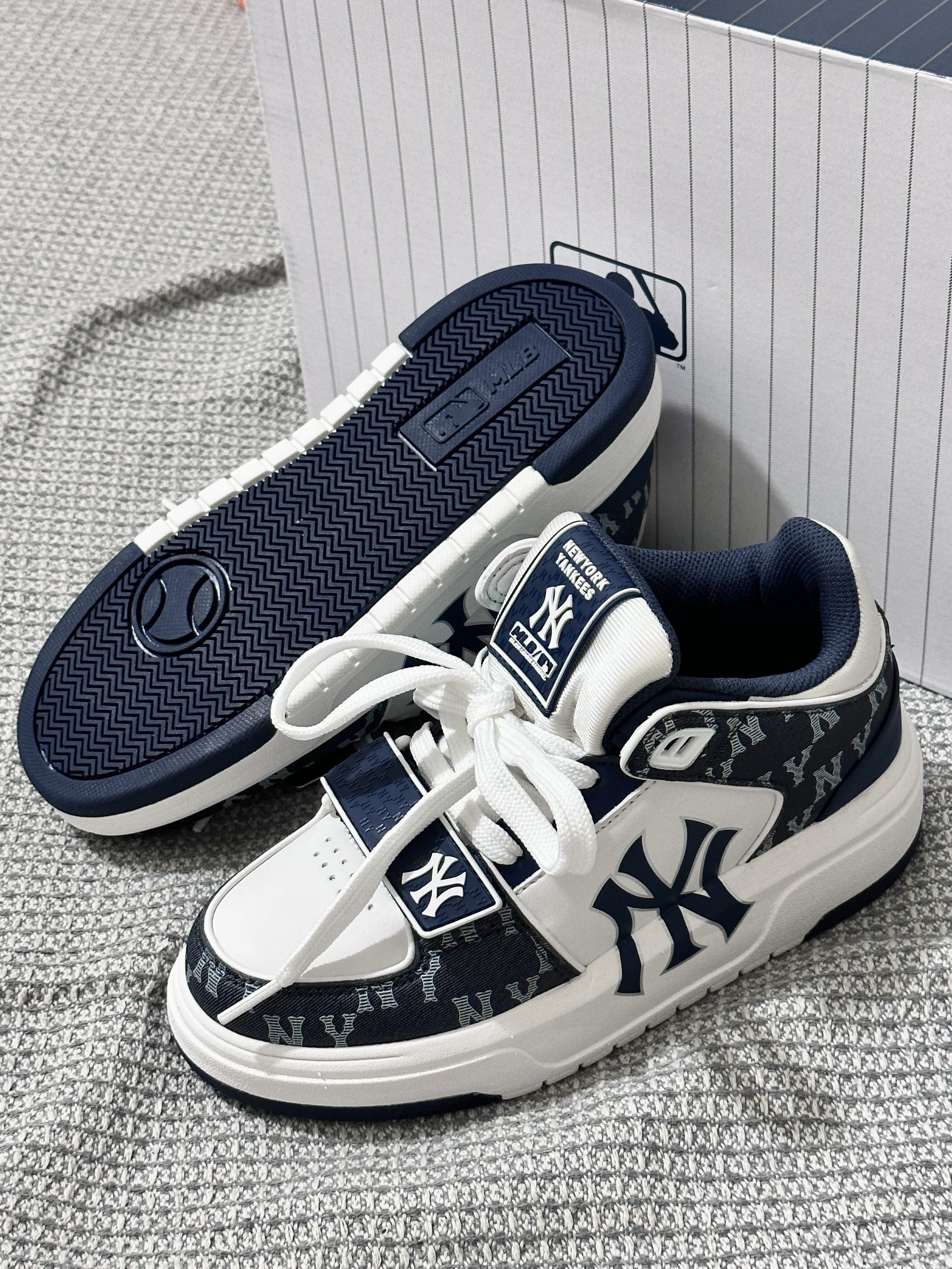 乍一看觉得一般,细看不管是版型还是花纹 都真的好深的我心❤️情侣同款帅出汁 🏜️纽约洋基队厚底增高 越看越喜欢 海军蓝配色百搭不挑人 皮质也够软 脚感舒适 很潮很潮 情侣们快穿😎