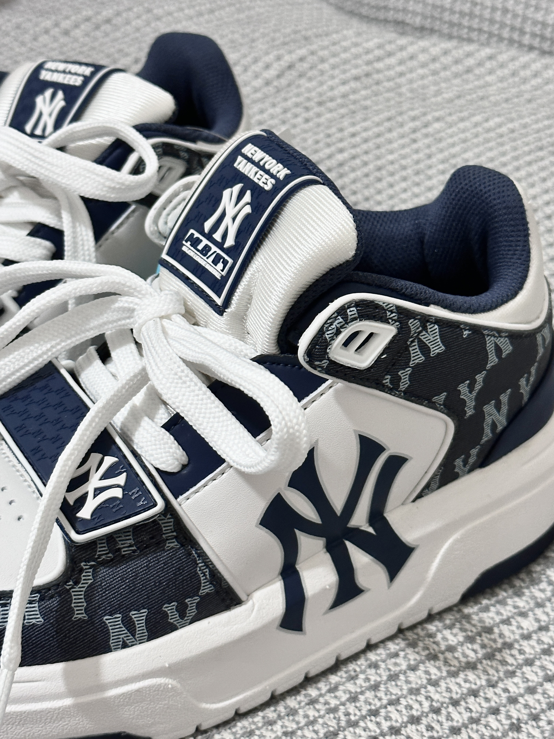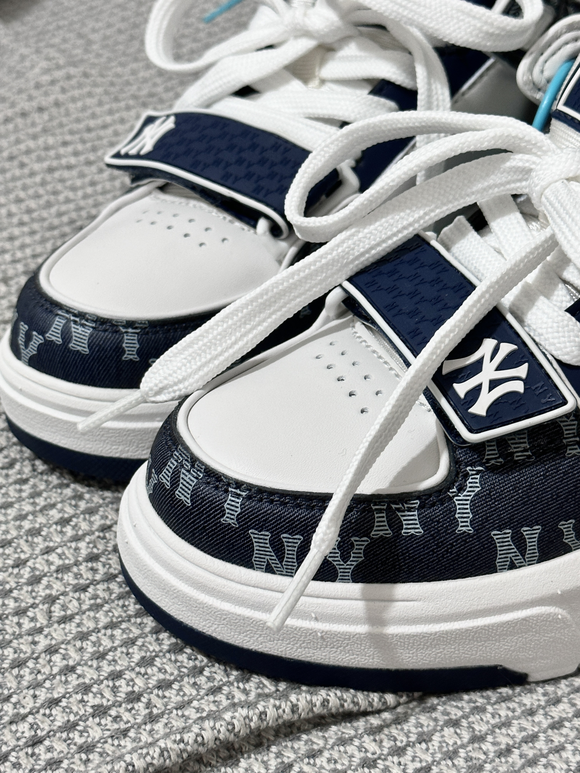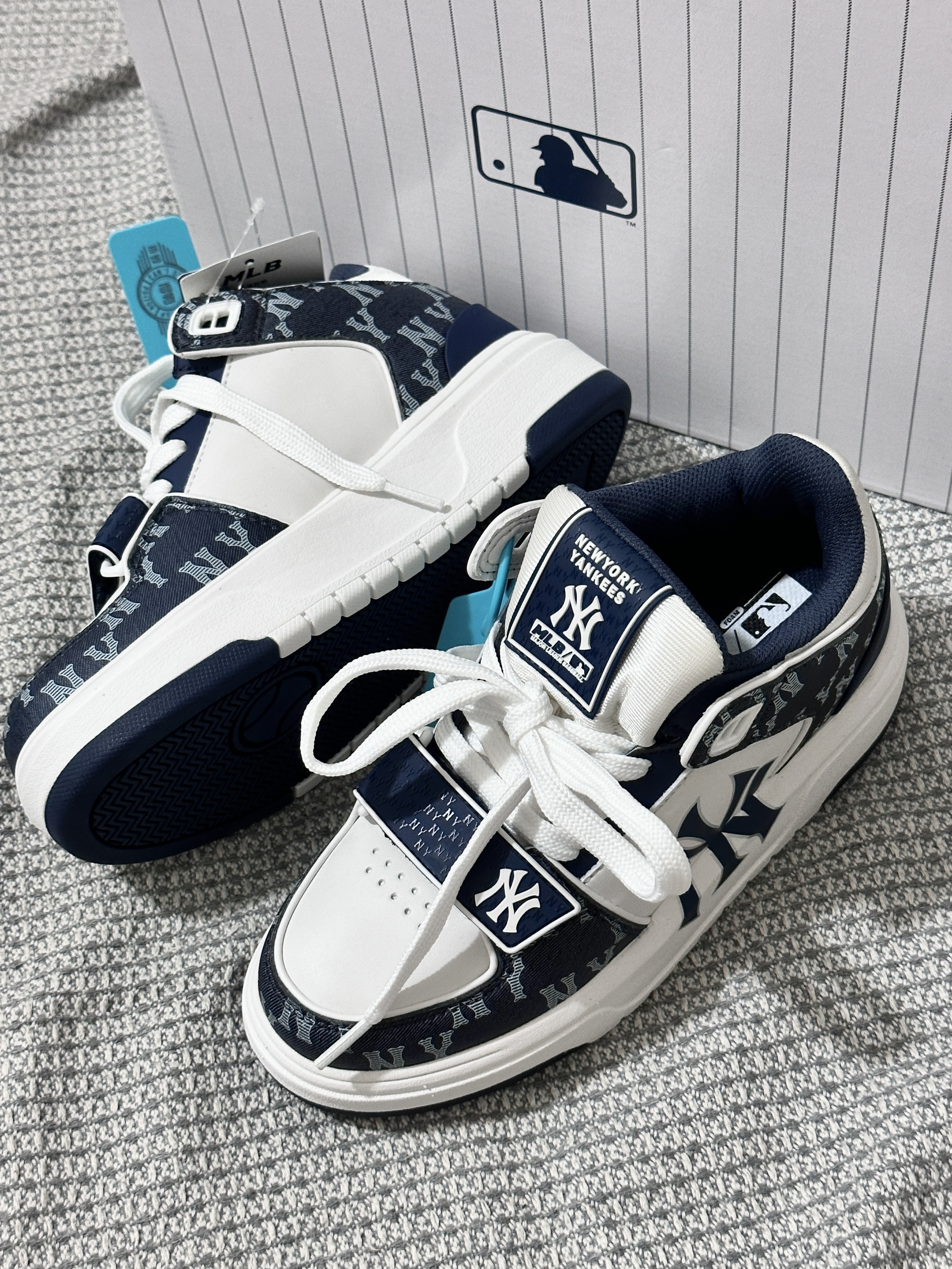 乍一看觉得一般,细看不管是版型还是花纹 都真的好深的我心❤️情侣同款帅出汁 🏜️纽约洋基队厚底增高 越看越喜欢 海军蓝配色百搭不挑人 皮质也够软 脚感舒适 很潮很潮 情侣们快穿😎