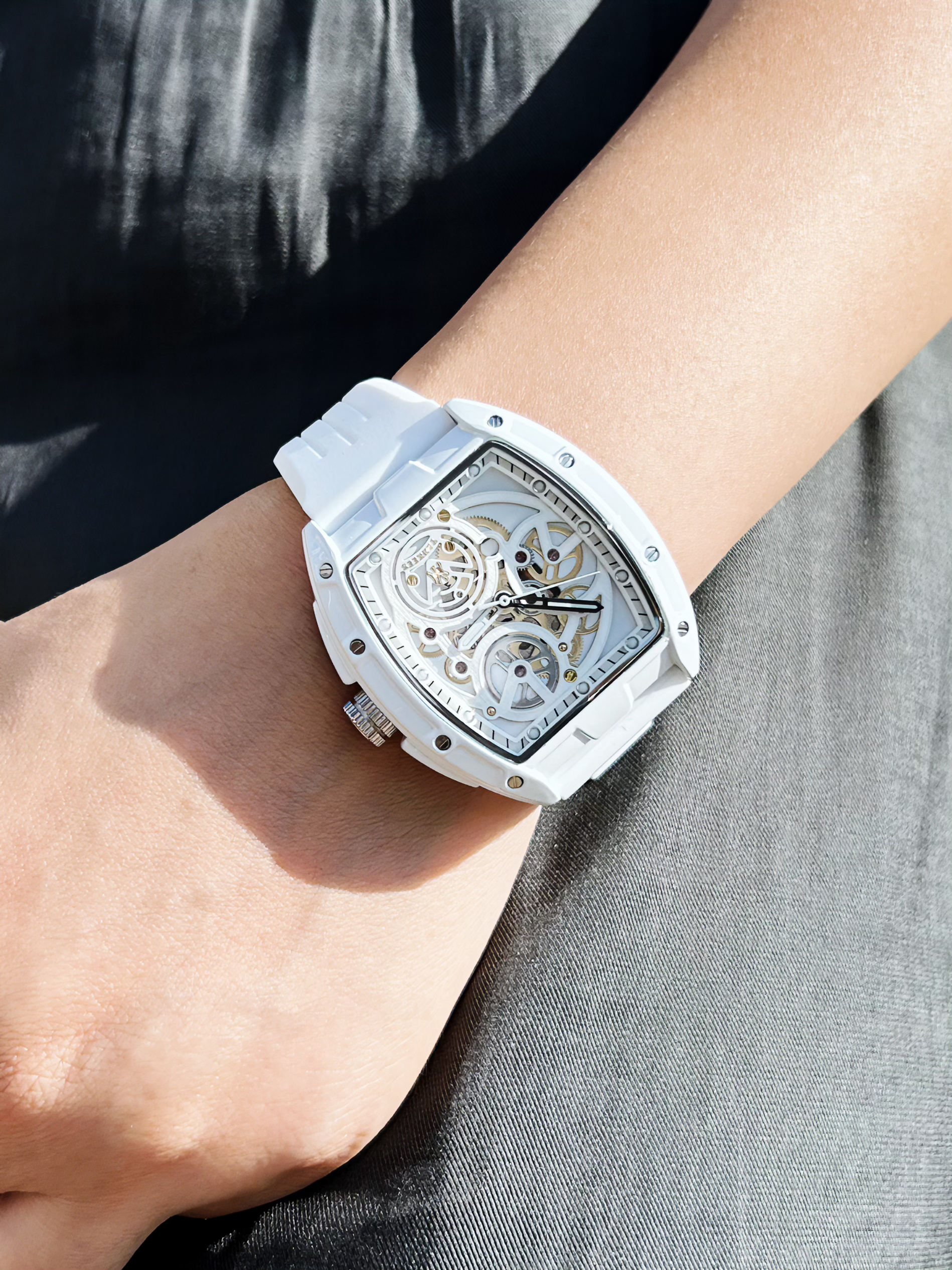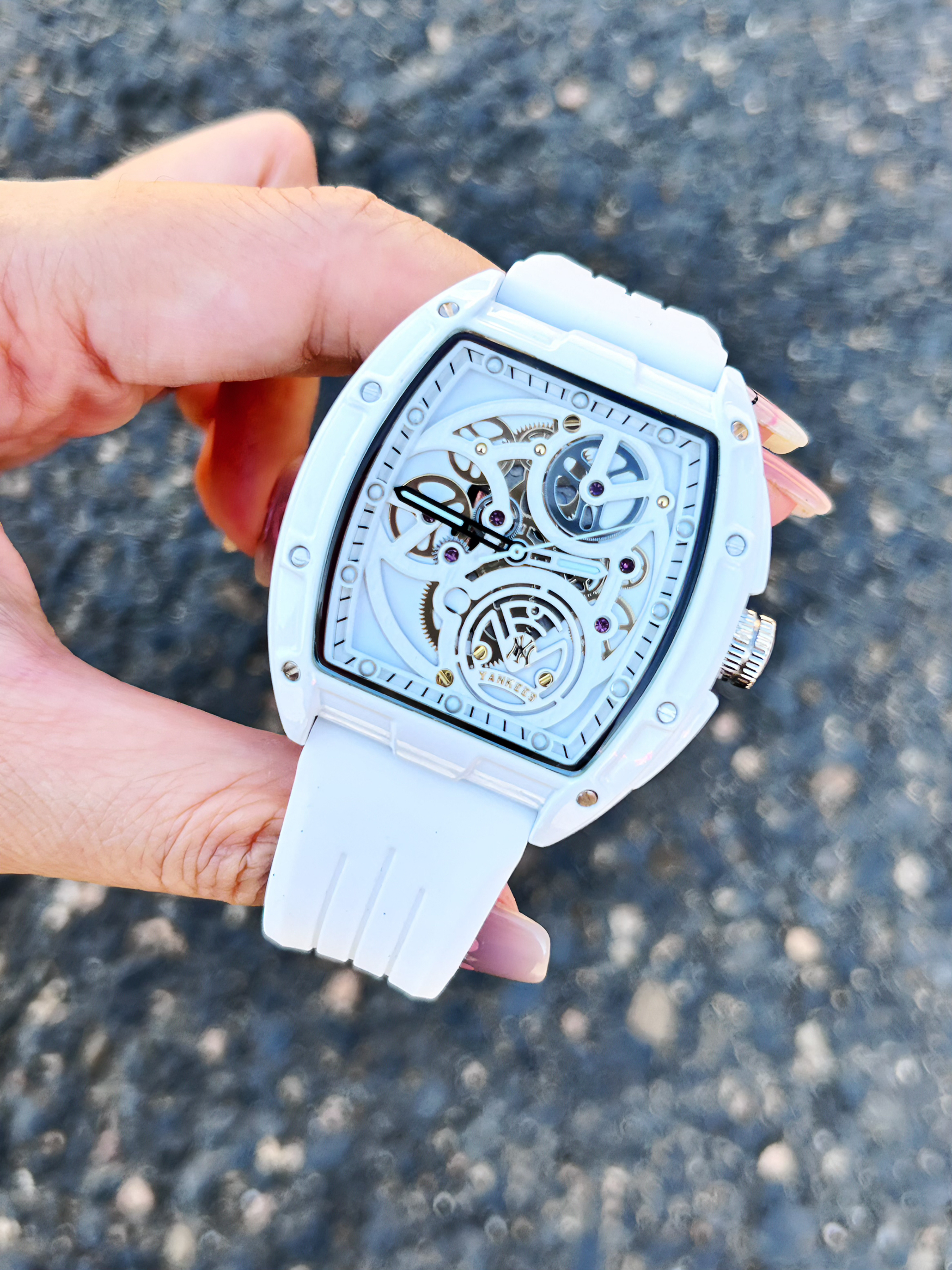 哦莫❗️这块纯白机械感手表也太🆒了 戴腻了黑色换白色戴戴 有一种眼前一亮的感觉 戴出去回头率超高! 它的外观设计尊滴深得我心 新颖镂空表盘 清晰🉑️视 炫酷有设计感又有个性 硅胶表带很贴合 佩戴舒适感敲好 日常休闲或者通勤风格都hold住 百搭不易撞款