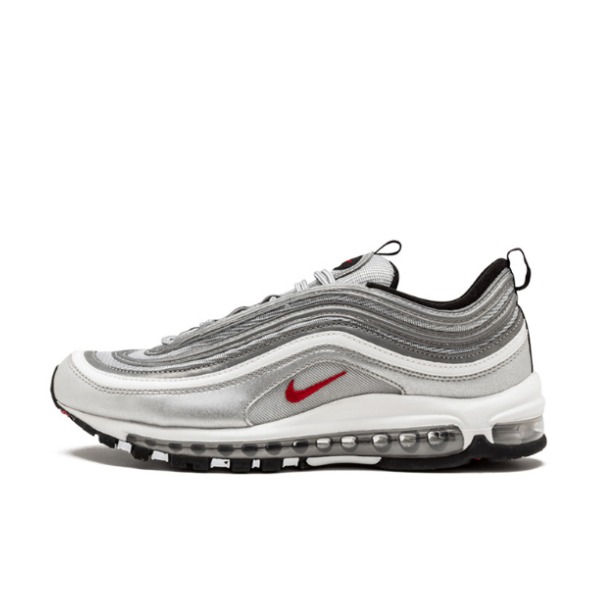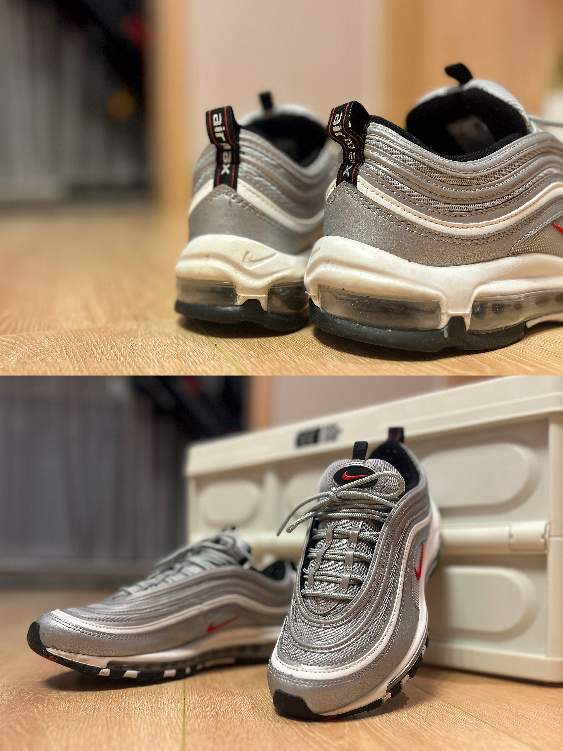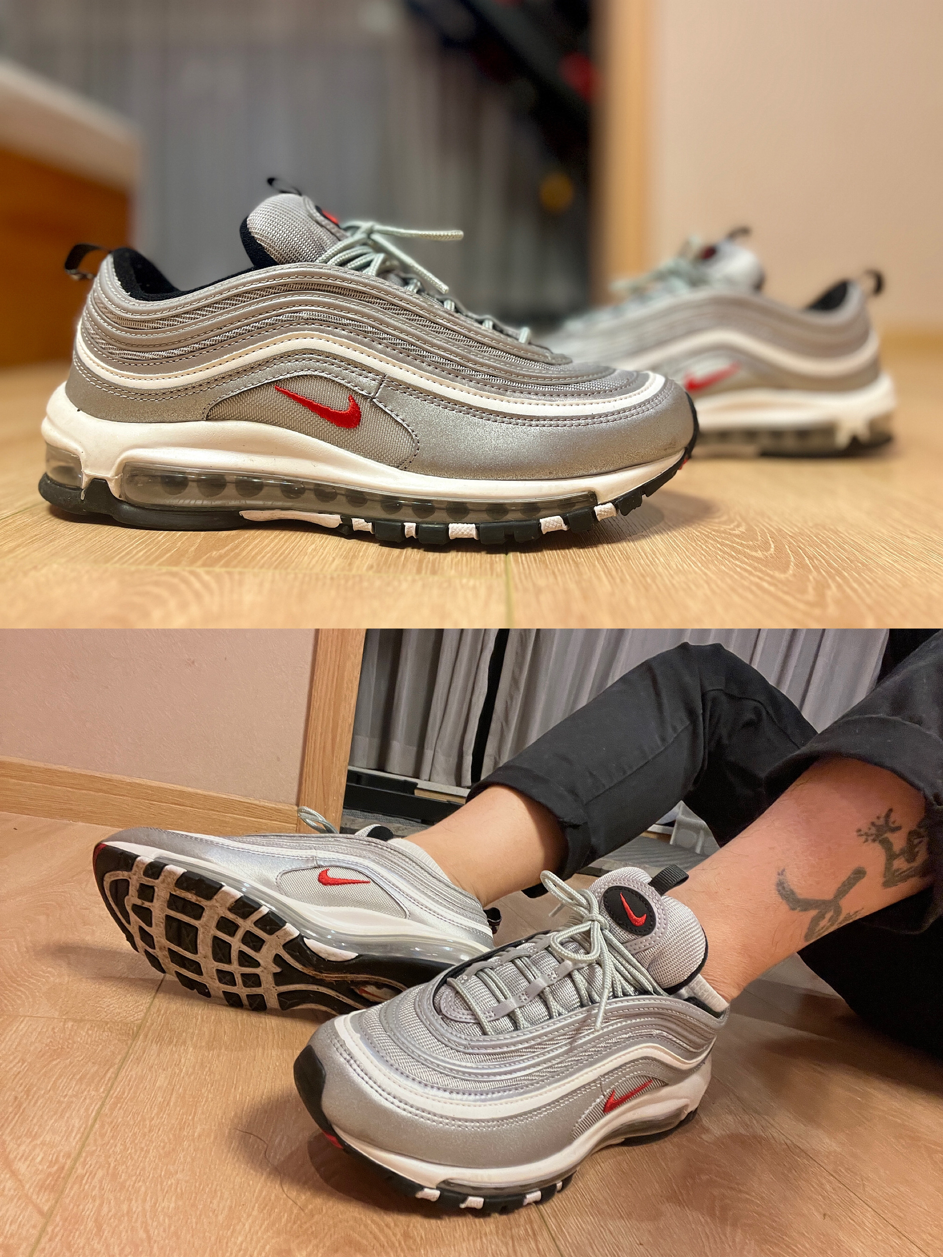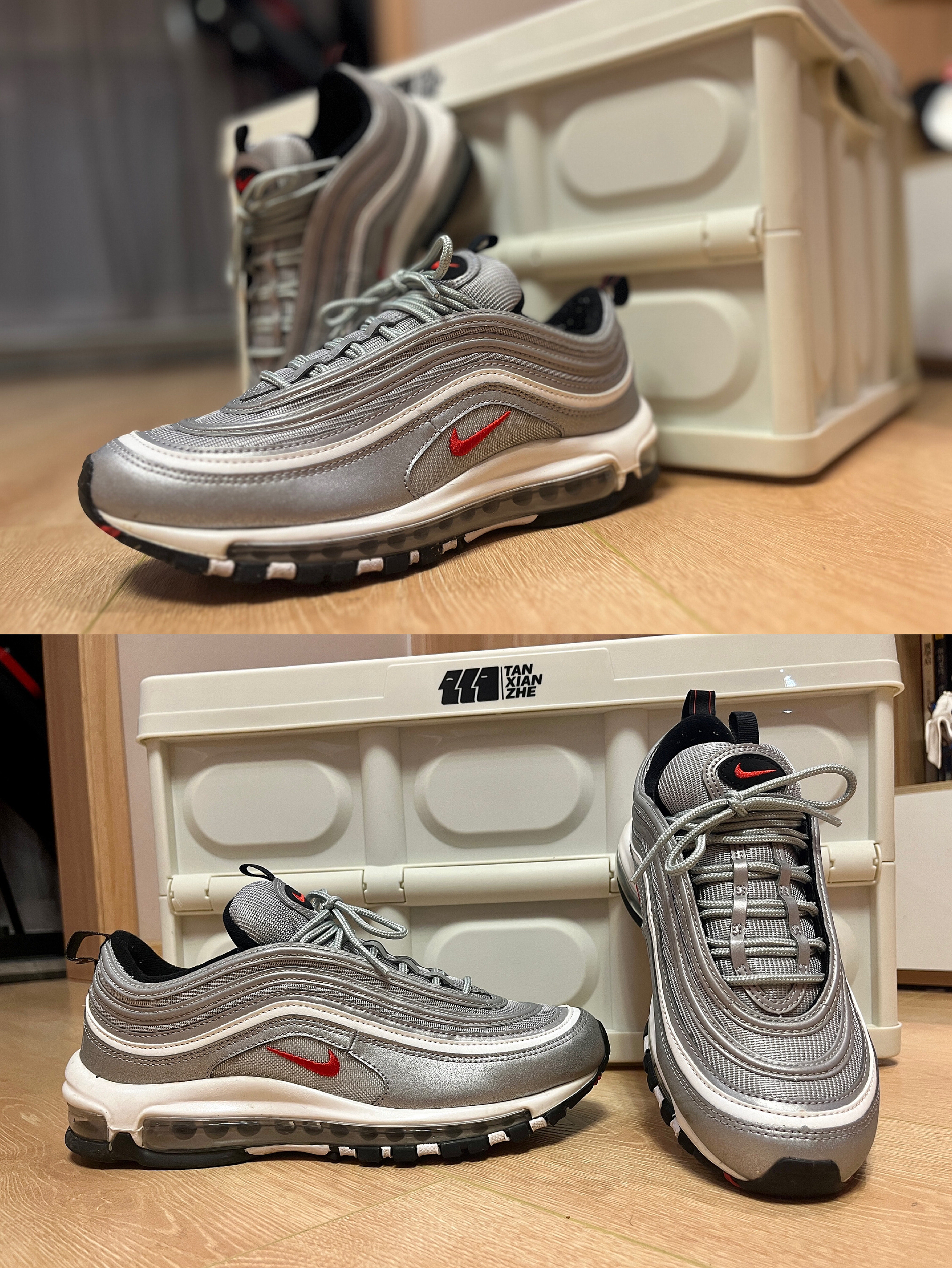 Max97银子弹 绝对可以说的上是一代神鞋了 当年发售一度价格飙升 现在三位数就可入手 性价比极高 颜值肯定没的说 全鞋3M反光 加上子弹头火车的设计和流线 看起来时尚高级 夜晚上脚出街 更是个性十足 可以说是潮人必备!!! 银灰的配色 高密度网面和牛皮 让它超好打理 脚感 配备了全掌气垫 虽然偏硬但脚感还是相对不错 但对于大体重的朋友是相当的友好 尺码个人感觉偏小一码 朋友们购买一定注意⚠️...
