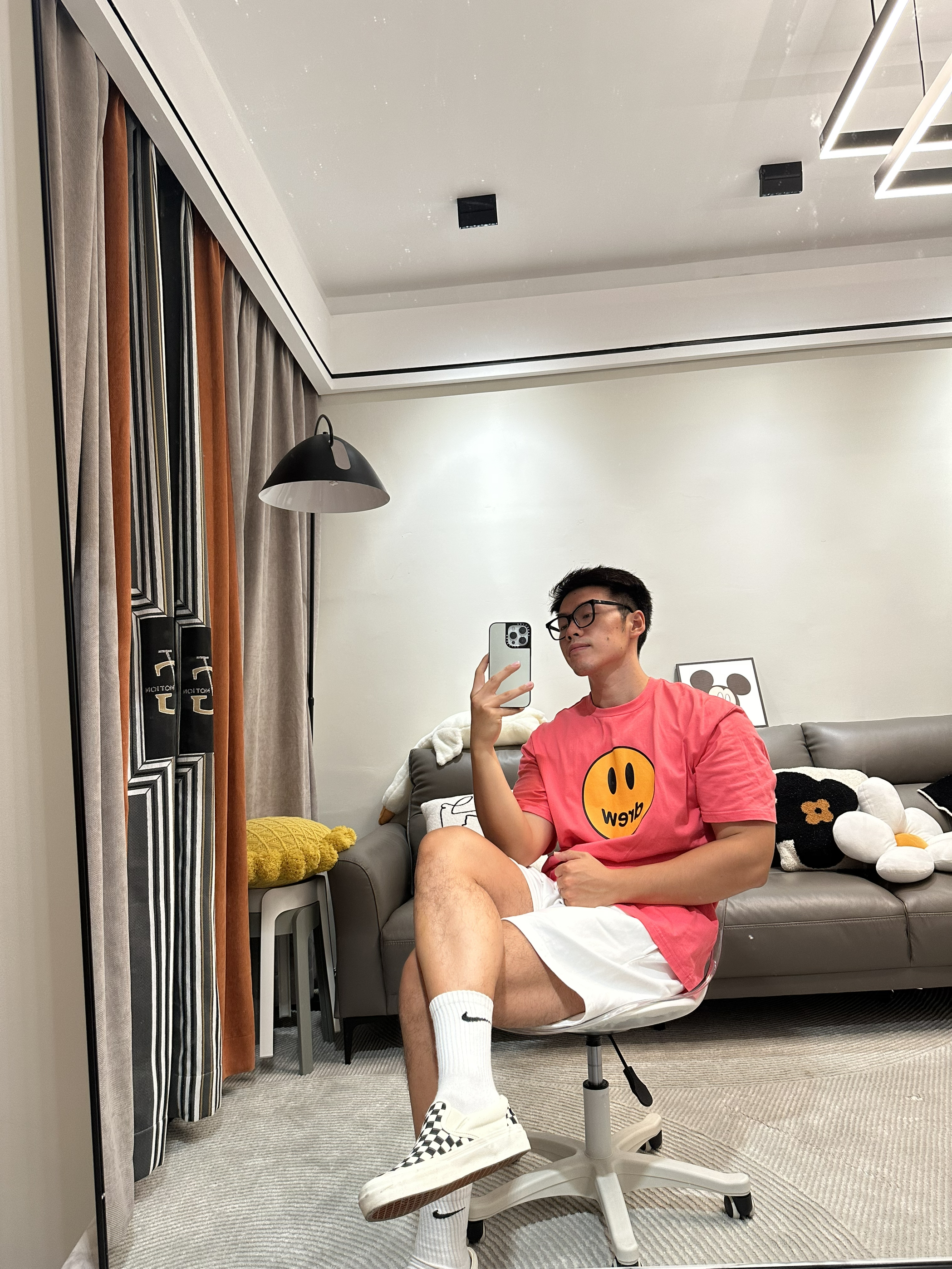 夏天就是彩色系的 男生也超级适合粉色呀🩷 在三亚晒黑了很多 索性来个多巴胺穿搭 &粉色T恤男生也可以穿的很好看猛男粉一点不 niang相反宽松的版型纯棉的质地硬挺的廓形会很 man收紧的领口设计显得肩膀会宽一些脖子长一些 &白色运动抽绳短裤膝盖以上下面全是腿 &为了搭配选择一双饱和度很低的袜子和饱和度很低的鞋子与T恤搭配上下呼应但是✅绝对不要超过三个颜 色✅不然看起来全身很热闹的