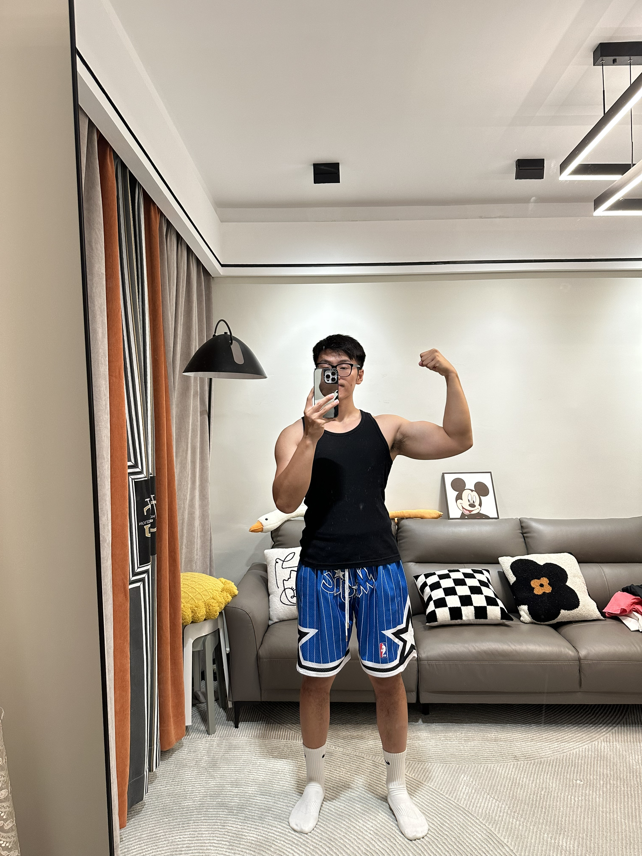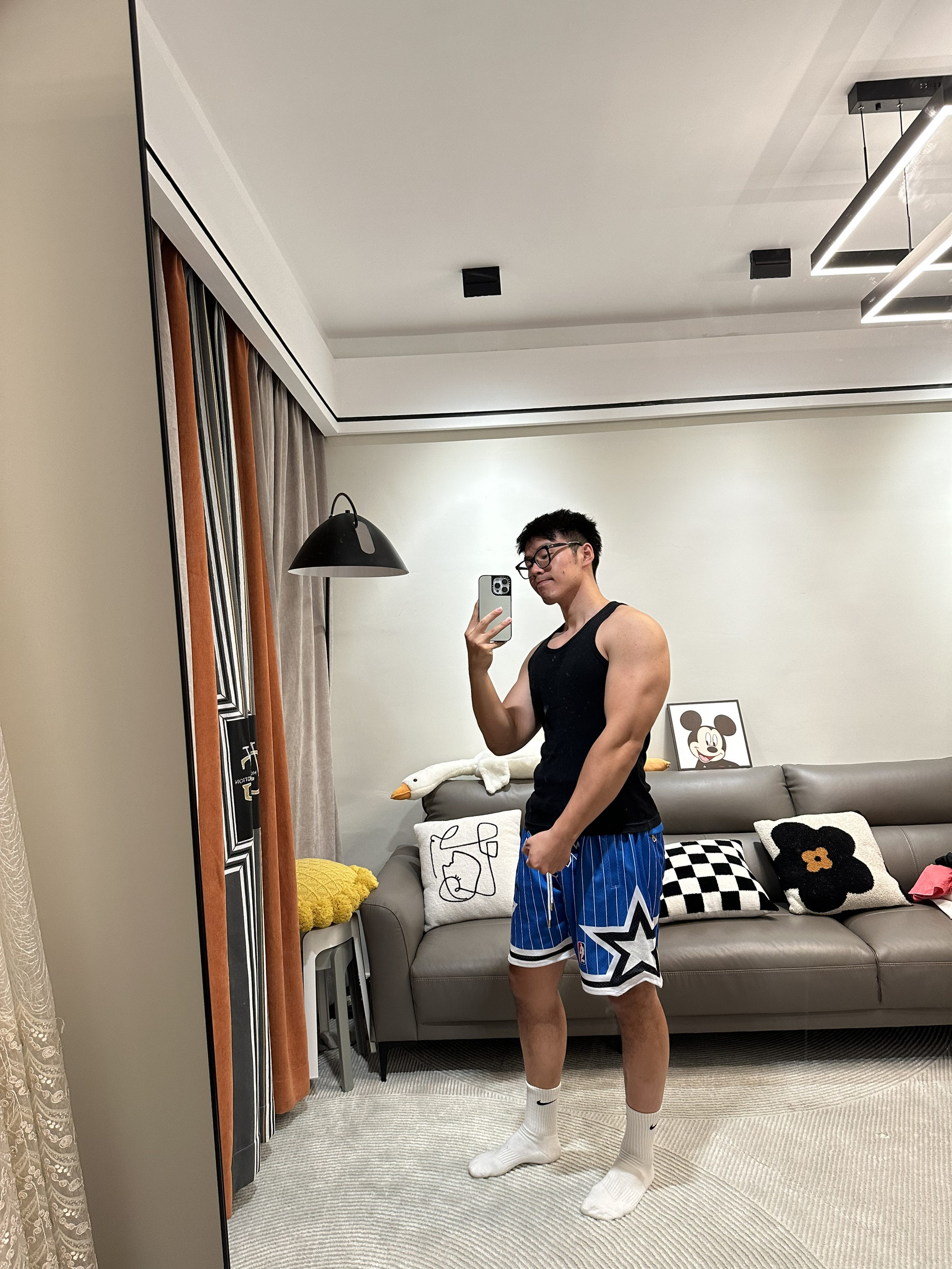 微胖健身男怎么穿显高又显大~ 💙蓝色系联名短裤与黑色背心绝配 ~深色系都可以配黑背心呦(比如紫色)~短裤一定一定不要过膝 ~再配上Nike白色长袜很显高 ~vans棋盘格真的很百搭这款鞋垫加厚很舒服穿久了也不~会累✅非常适合日常出街和健身
