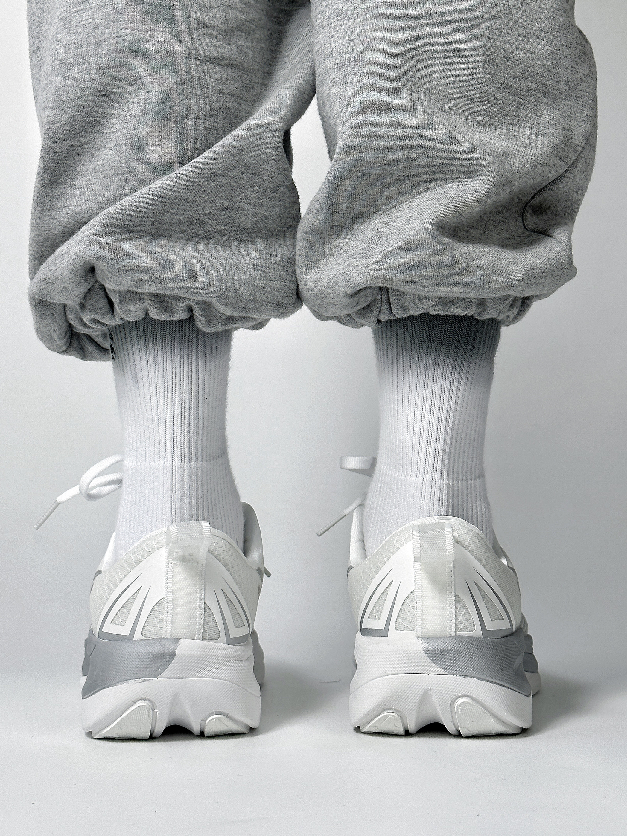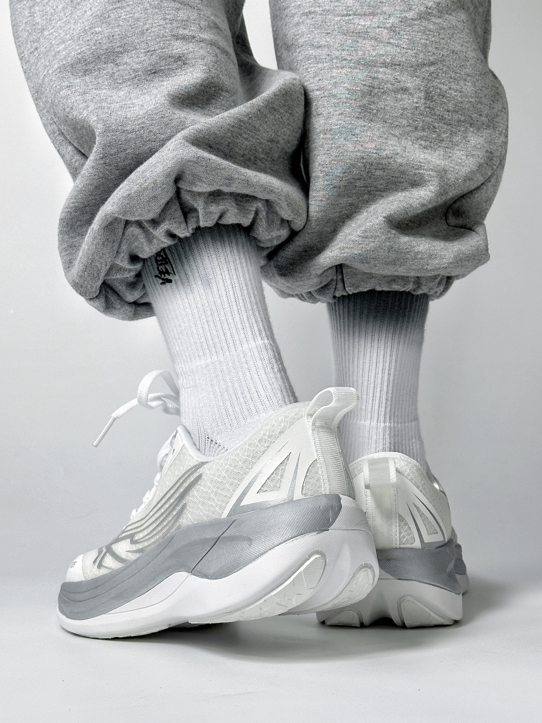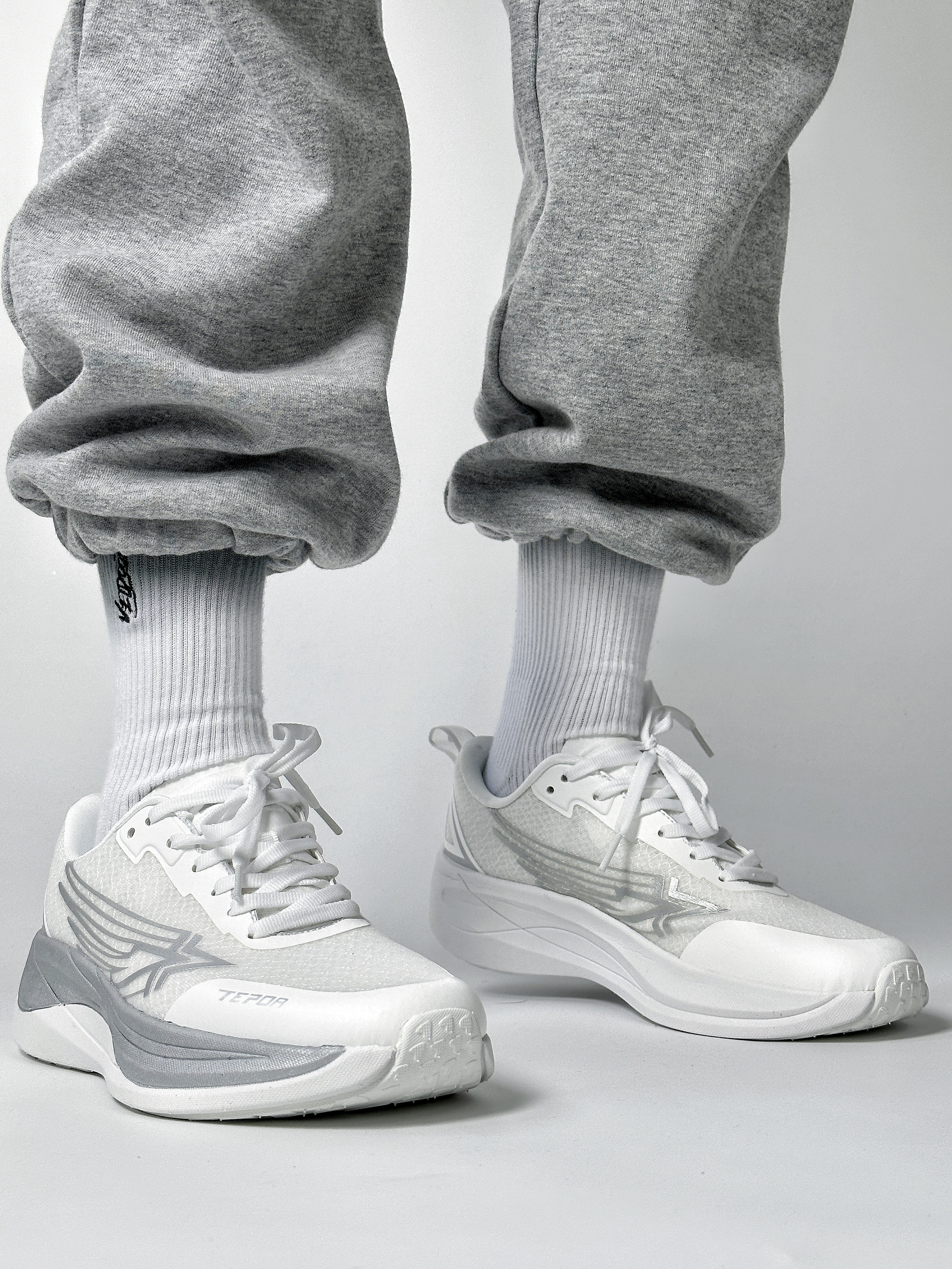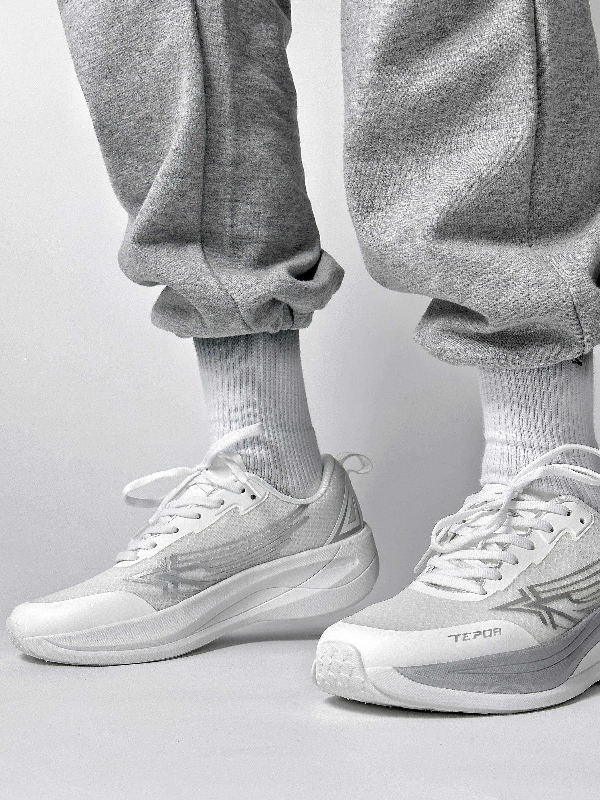 🏃👟:天跑 66号 领航 灰白 鞋子整体以白色、银灰色为主,在颜值方面还是比较耐看,但是白色不耐脏,不太适合不怎么爱打理的朋友。 鞋子采用纱贾材质鞋面搭配鞋头一圈的热熔压胶,透气性还是很不错的,鞋垫的设计很有特点前端跟后跟都有凸起加厚处理加上中底调校的比较软的EVA材质,整体脚感属于舒适的,鞋底采用了硬质橡胶材质贴片作为大底,整体耐磨性还是不错的。