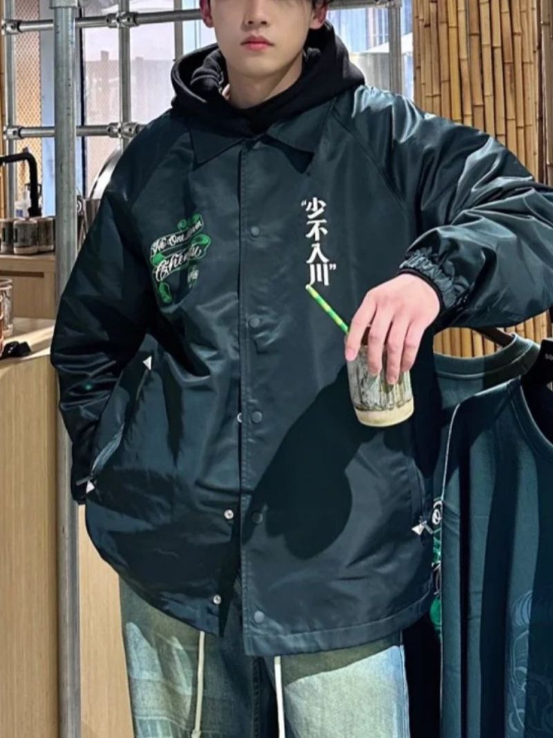 这款夹克深绿色的,与我衣柜中的衣服有很多不同,也让我尝试了一种不一样的感觉👏👏 深绿色也是比较显瘦的,而且这款夹克上面的印花有点个性哦,独特又小众🌟🌟 内搭黑色T恤,裤子就选择牛仔裤就很酷,夹克好看又可以出片我难以拒绝👌👌 图源网络侵删