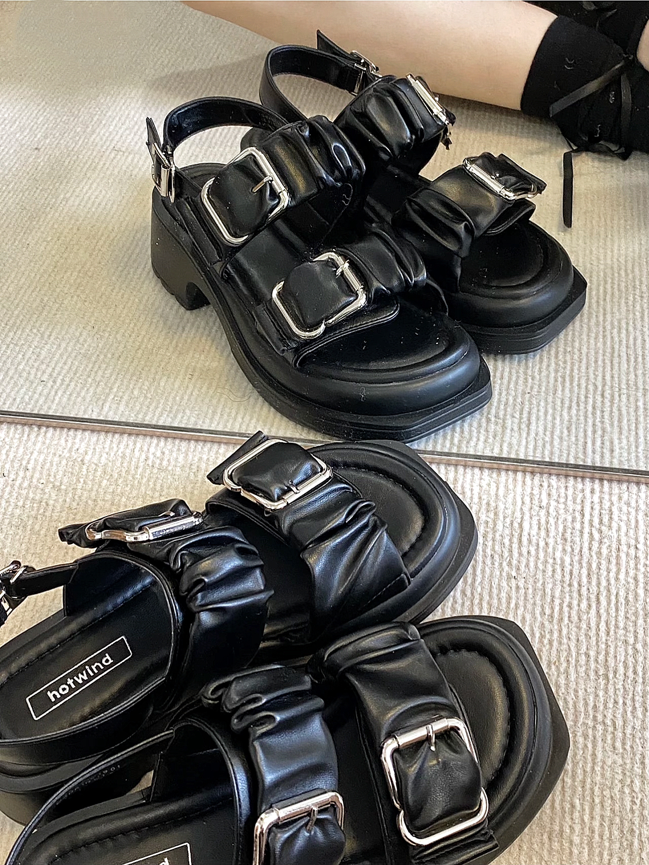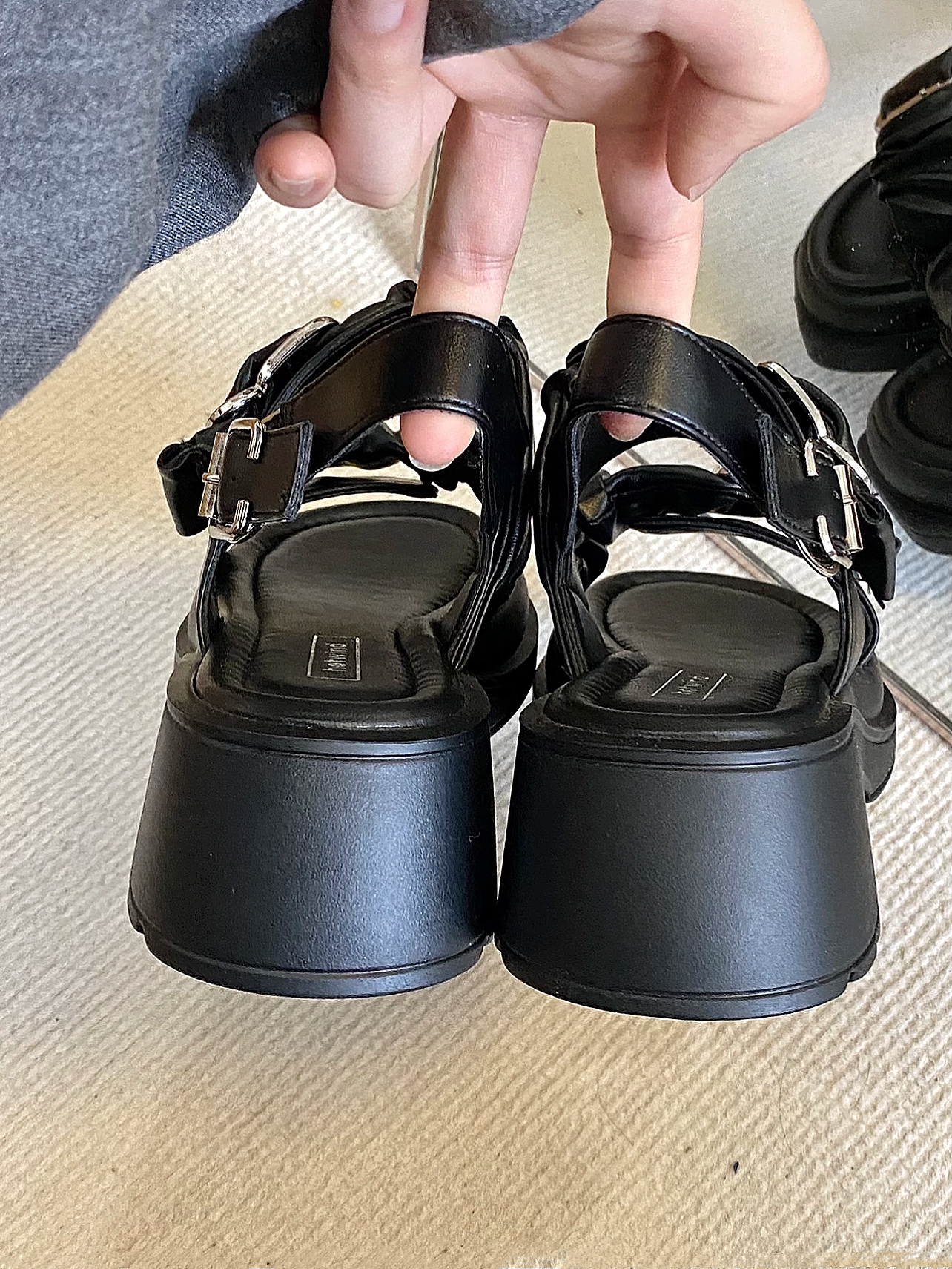 金属扣设计就很有质感 泡棉材质,穿起来很软,很轻便 底子一点都不硬! 5cm高跟,小个子女生的福音!!