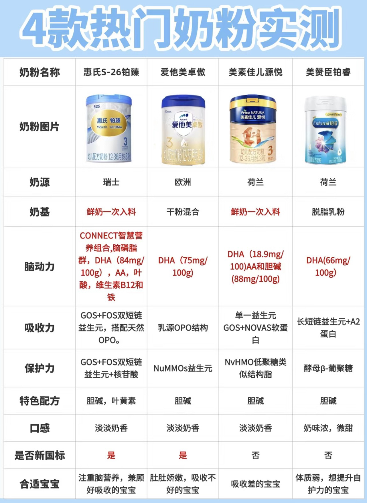 爱他美卓萃白金 🔸奶源:欧洲奶源,A1牛奶蛋白 🔸奶基:脱脂羊奶粉,全脂羊奶粉等 🔸优点:添加NuMMOs模拟低聚乳糖(2种益生元组合),天然乳脂占脂肪总量的50%,DHA含量高 🔸消化吸收配方:益生菌Bb-12、益生元GOS+FOS A2紫白金 🔸奶基:脱脂牛奶,浓缩乳清蛋白粉等 🔸奶源:新西兰 🔸维生素:10种 🔸优点:含有6种矿物质;紫白金强化配方DHA,益生元 🔸消化吸收配方:A2奶源,...