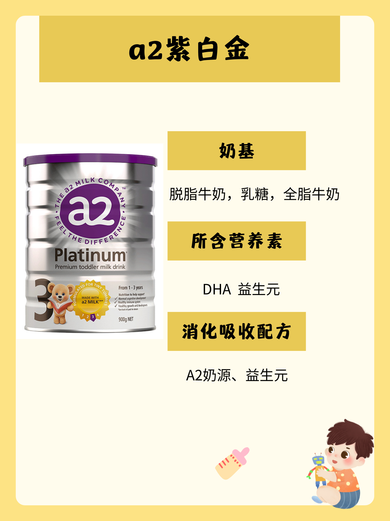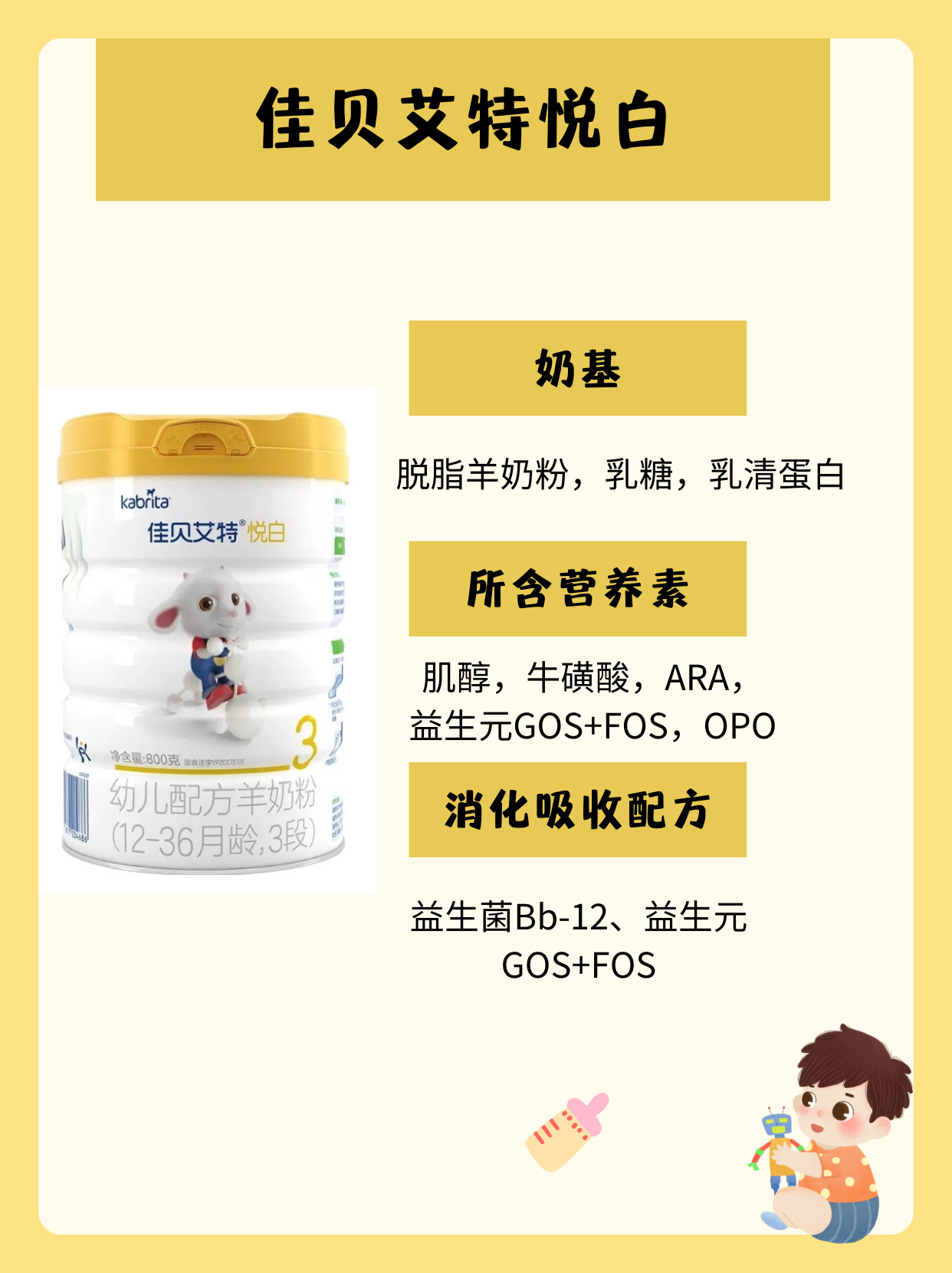 本篇笔记关联了佳贝艾特/kabrita 悦白3段12-36个月较大婴儿配方羊奶粉 荷兰原装进口新国标原罐好吸收 800g、a2 Platinum新西兰白金3段幼儿配方奶粉 原装进口含天然A2蛋白易吸收 900g、爱他美/Aptamil 白金版卓萃3段幼儿配方奶粉12-36个月 900g等商品,为用户提供真实的使用体验和购买参考。