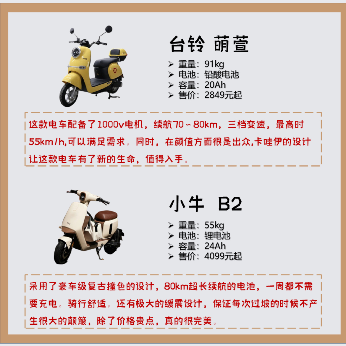 新国标电动车也就是指符合《电动自行车安全技术规范》标准的电动车。🤔🤔也就是指的重量不大于55公斤,电机功率不超过400w,额定电压不超过48v且具备脚踏骑行功能的以电力驱动的非机动车。今年小编为大家整理了几款颜值实力新国标电动车,希望能提供些参考意见。👌👌 🌼台铃 萌萱 这款电车配备了1000v电机,续航70~80km,三档变速,最高时55km/h,可以满足需求。同时,在颜值方面很是出众,卡哇伊的...