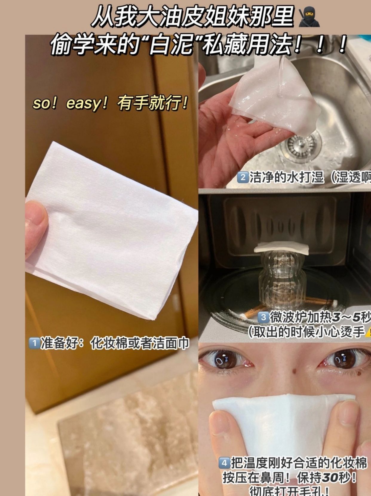 上周去闺蜜家!!当场给我教育了一番! 我一直用的白泥去黑头方法,竟然是错的???? 我好无语…@¥&$ 至于这方法,是我闺蜜的私藏!不外传! 如果被她发现 (脑海中恶补一下,她扯我头发的画面) 而且我自己用了之后,是真的nice! 俺现在的鼻头,就像剥了壳的桂圆! 细!嫩!滑! 所以,不要说白泥没效果,是你没用对方法! 私藏去黑头方法,现场教学来咯!!! 1⃣️准备好一张干净的化妆棉或者洁...