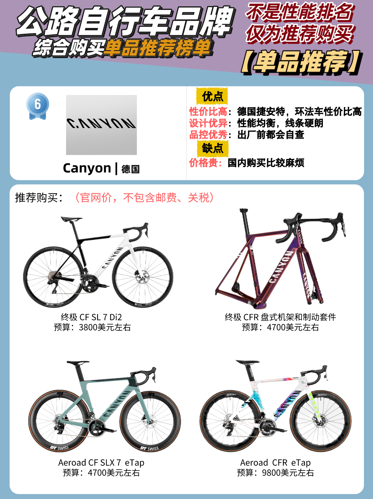🤔我想大家作为骑行爱好者 每个人都会有自己独特喜欢的公路车品牌 那么每一个品牌都有自己的独特历史和故事 😋今天小李就来给大家汇总一下各个品牌的公路车倾力之作!由于单页图文和文案字数限制,个别公路车品牌未写还望大家海涵,错误之处多多包容🫡 ♻️单品价格绝大多数来自于官网,实际价格可能会有波动 ♻️预算不够的小伙伴们可以购买车架组组车 ♻️单品推荐在上面图片里哦 - 6️⃣德国Canyon 🚵...