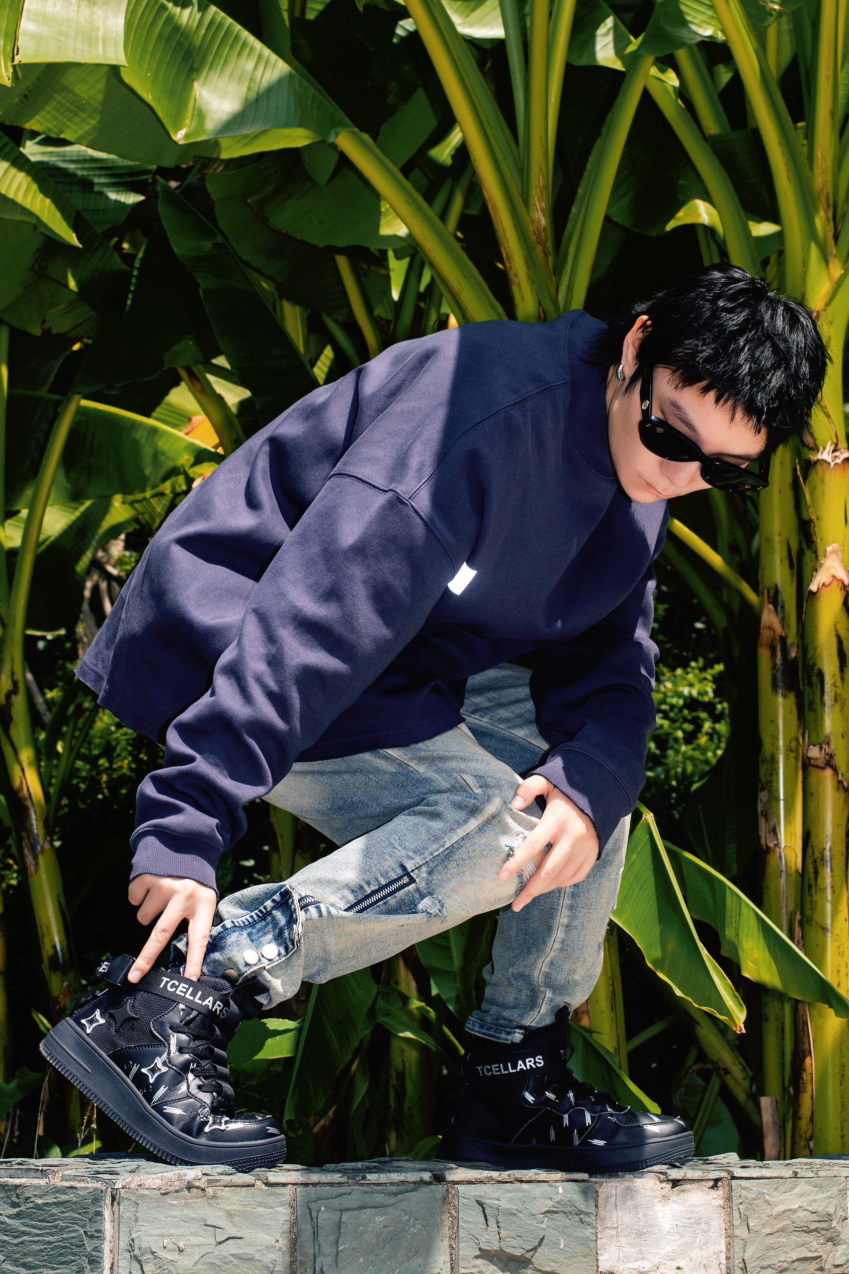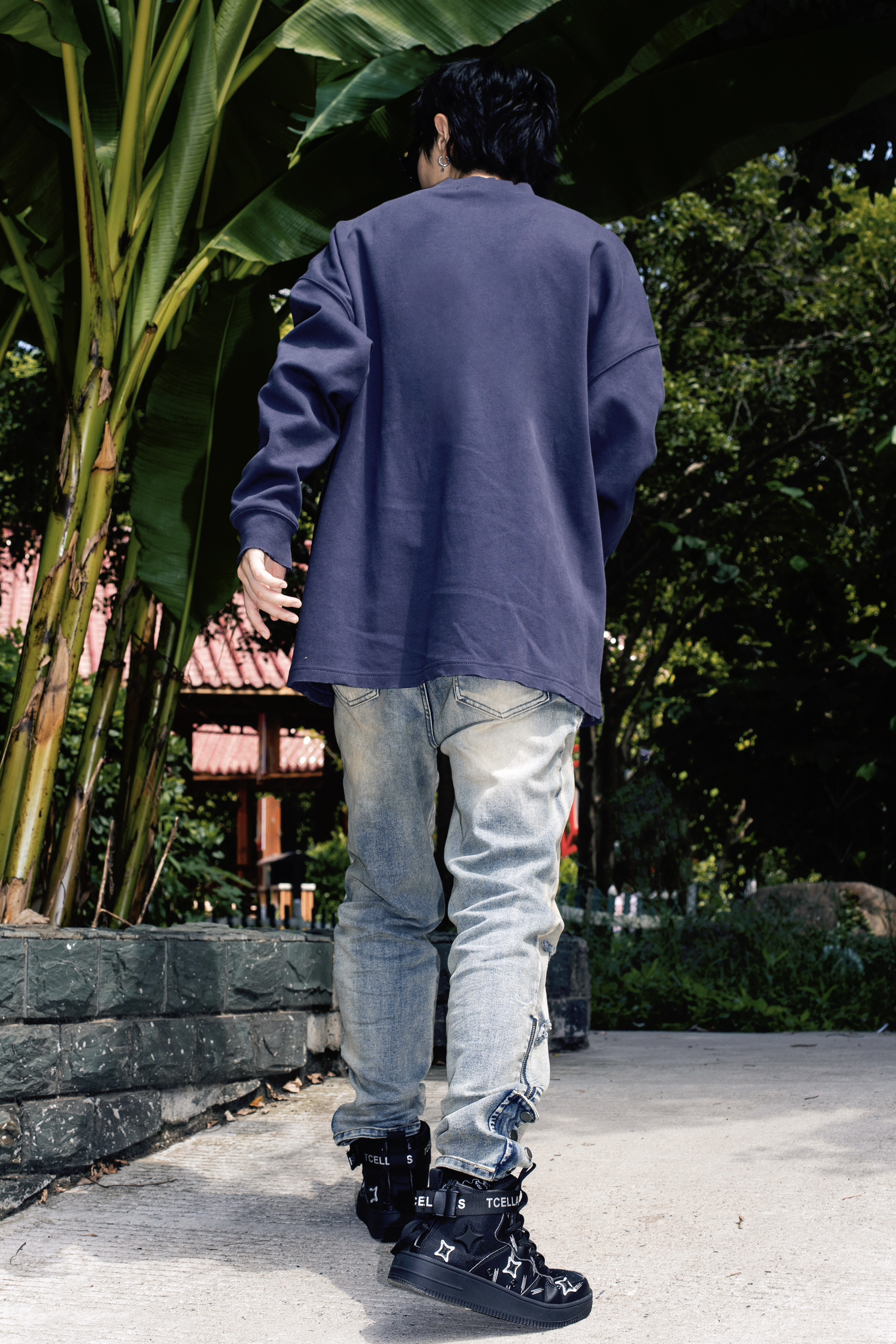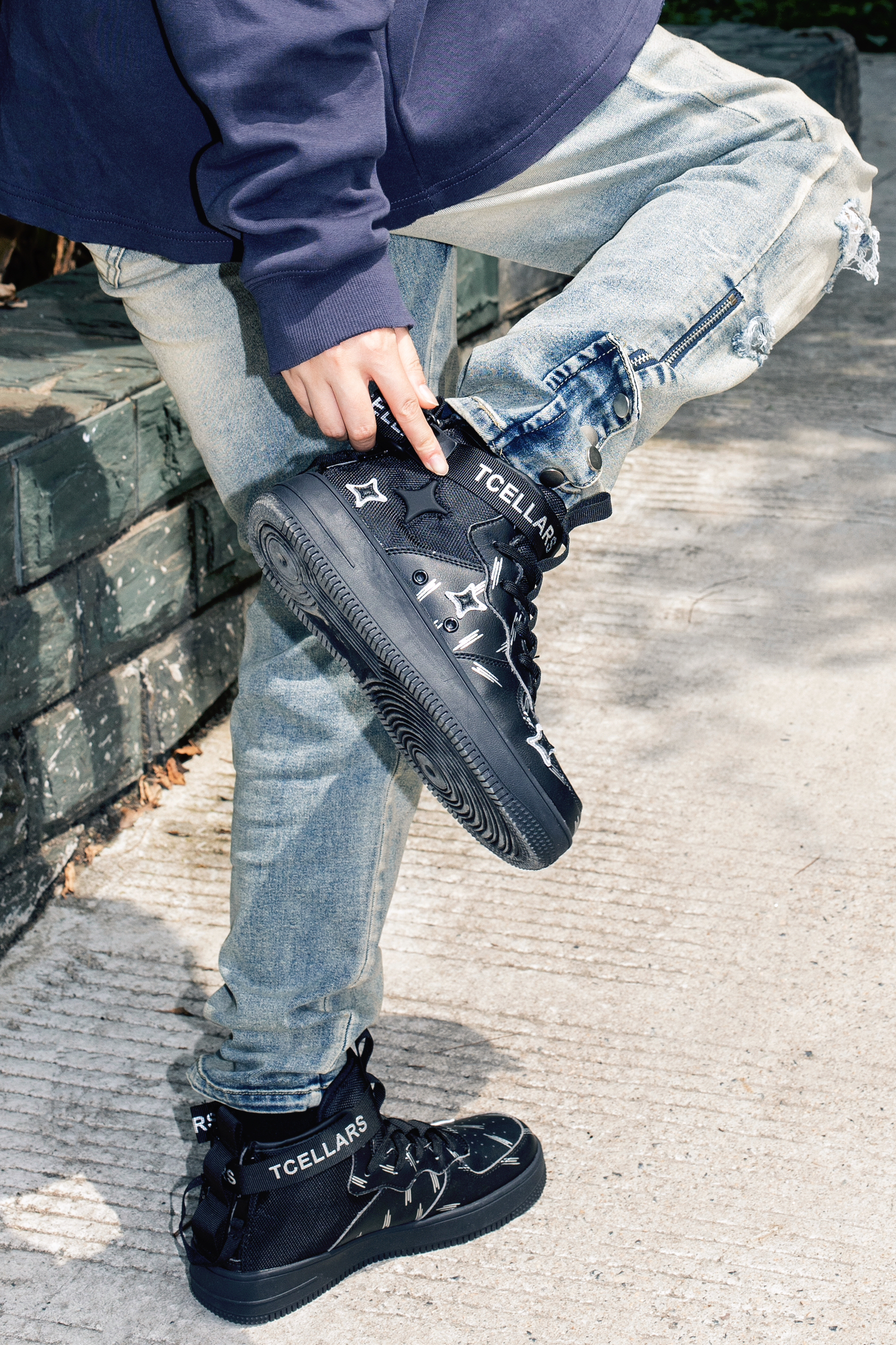 今年美式街头风很火 入秋了就分享秋季美式高街风穿搭公式 穿搭指南: 上身一件蓝灰色长袖T恤 小领口的版型设计自带高级感 下身搭配一条复古做旧牛仔裤 直筒版型和裤腿微喇的设计很高街 上脚一双黑色TCELLARS休闲板鞋 中帮设计很适合即将到来的秋冬 以黑色为主色调搭配银白色星星图案很玩味 后跟处还有绑带设计增加了街头机能感 整套T恤牛仔配板鞋 美式高级风轻松拿捏