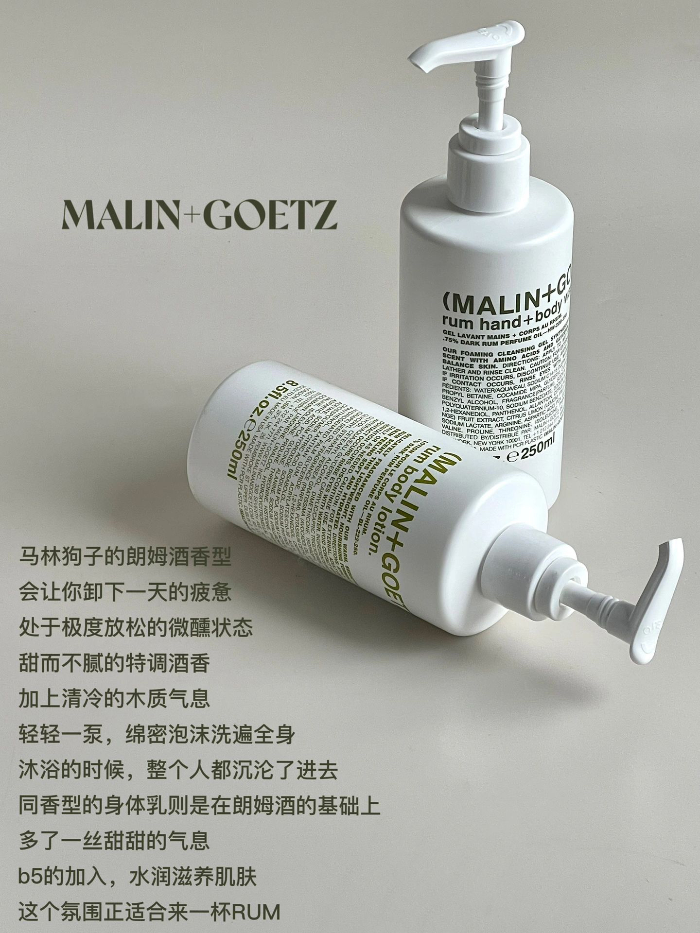 今天力荐6⃣️款海外爆火的沐浴露 提升晚间沐浴幸福值⬆️ ✨ ✨MALIN+GOETZ马林狗子沐浴露/身体乳 马林狗子的朗姆酒香型会让你卸下一天的疲惫😪 处于极度放松的微醺状态🍷 甜而不腻的特调酒香,加上清冷的木质气息🪵 轻轻一泵,绵密泡沫洗遍全身🛁 沐浴的时候,整个人都沉沦了进去 同香型的身体乳则是在朗姆酒的基础 上多了一丝甜甜的气息 b5的加入,水润滋养肌肤 这个氛围正适合来一杯RUM🥃 ✨ ...