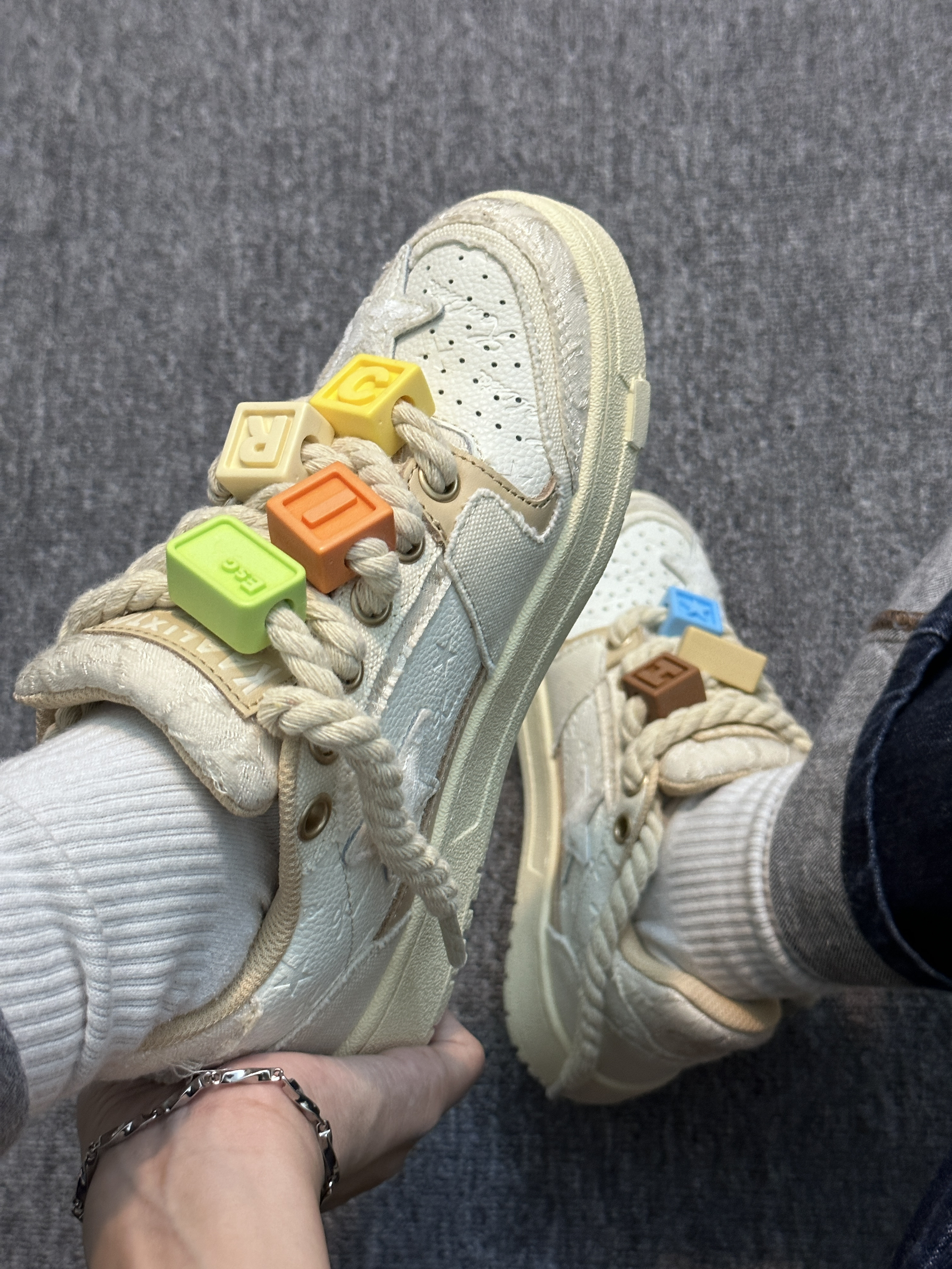 米白色搭配彩色配件 活泼可爱又俏皮🤪 版型上身效果👍 脚感舒适巨显脚小🦶 颜色百搭不挑人 多巴胺色彩配饰增添一抹趣味 越看越喜欢 🥰不输给其他颜色 感觉穿的频率高