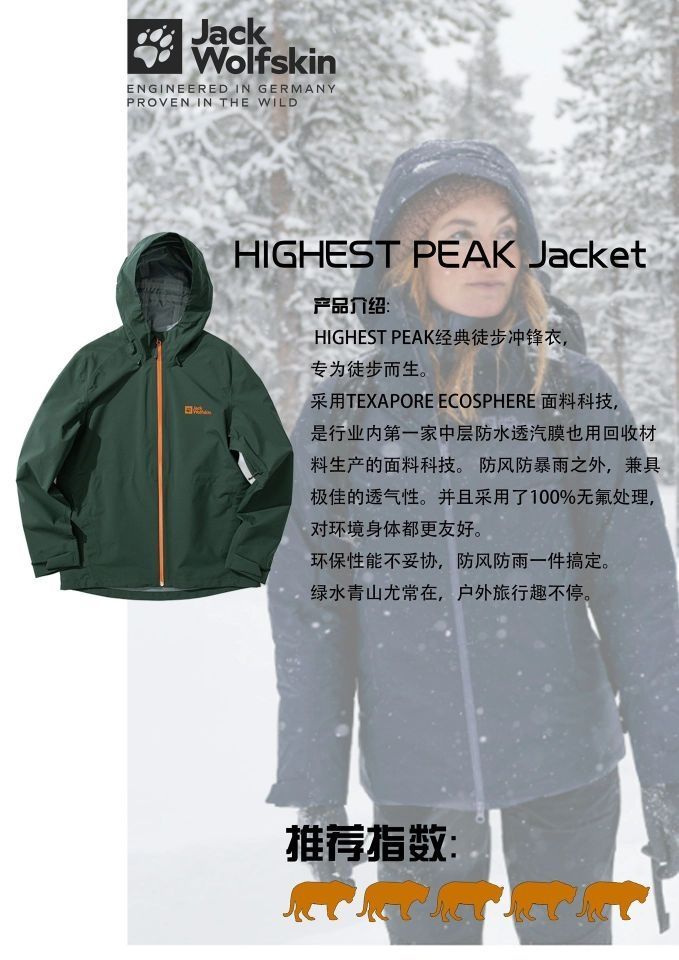 🐺狼爪Jack Wolfskin HIGHEST PEAK经典徒步冲锋衣,在功能性上可是没话说的!首个三层均采用回收材料再生制成的新型面料科技——TEXAPORE Ecosphere。具有出色的透气性和防风防水性能,解决徒步过程中不透气,闷热的问题。👍同时它具有卓越的防风防水功能,可抵挡暴雨💦,产品设计上面也很用心,防水拉链,腋下透汽拉链都能迅速散热,可调节帽子和下摆可以 应多多重天气变化,是一款为徒步而生的冲锋衣!
