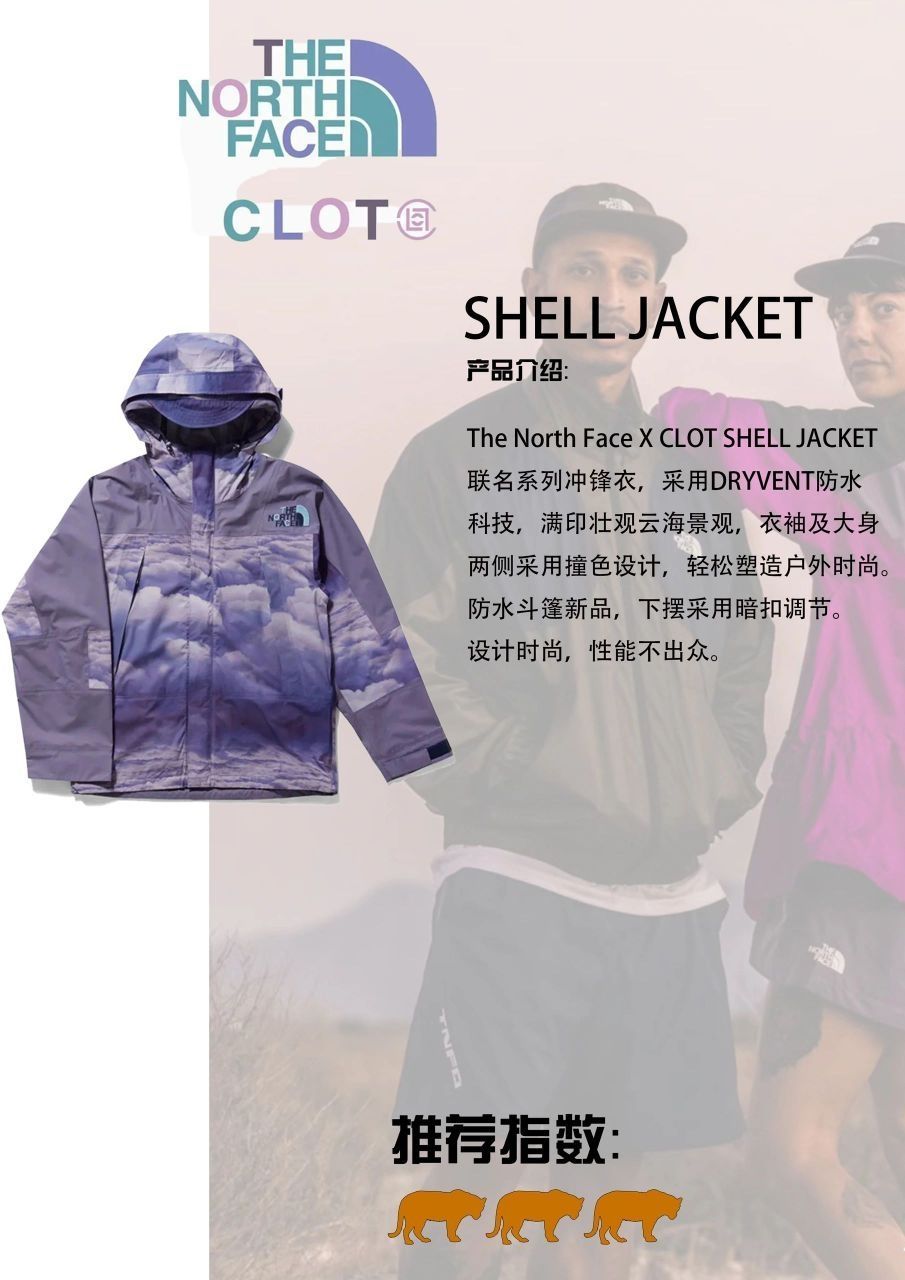 The North Face X CLOT 联名系列冲锋衣,采用DRYVENT防水科技,满印壮观云海景观,采用撞色设计,轻松塑造户外时尚。