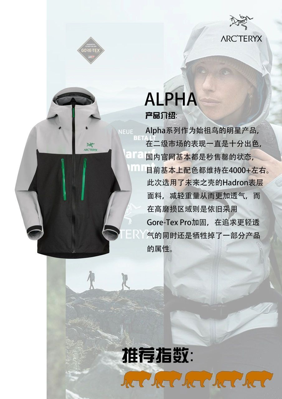 作为冲锋衣领域的领军品牌,王牌产品则是Alpha的硬壳,鸟的硬壳无需多言。