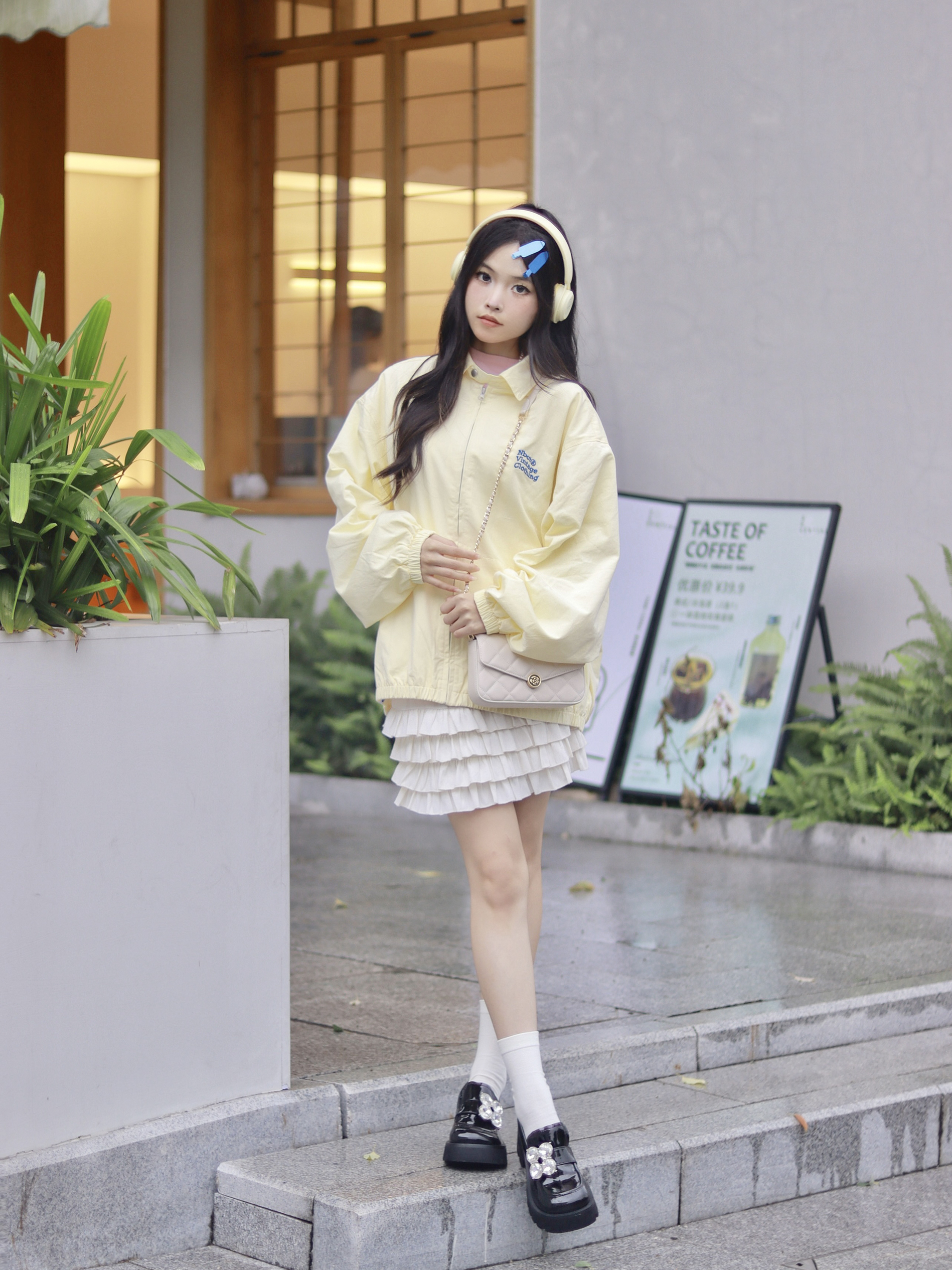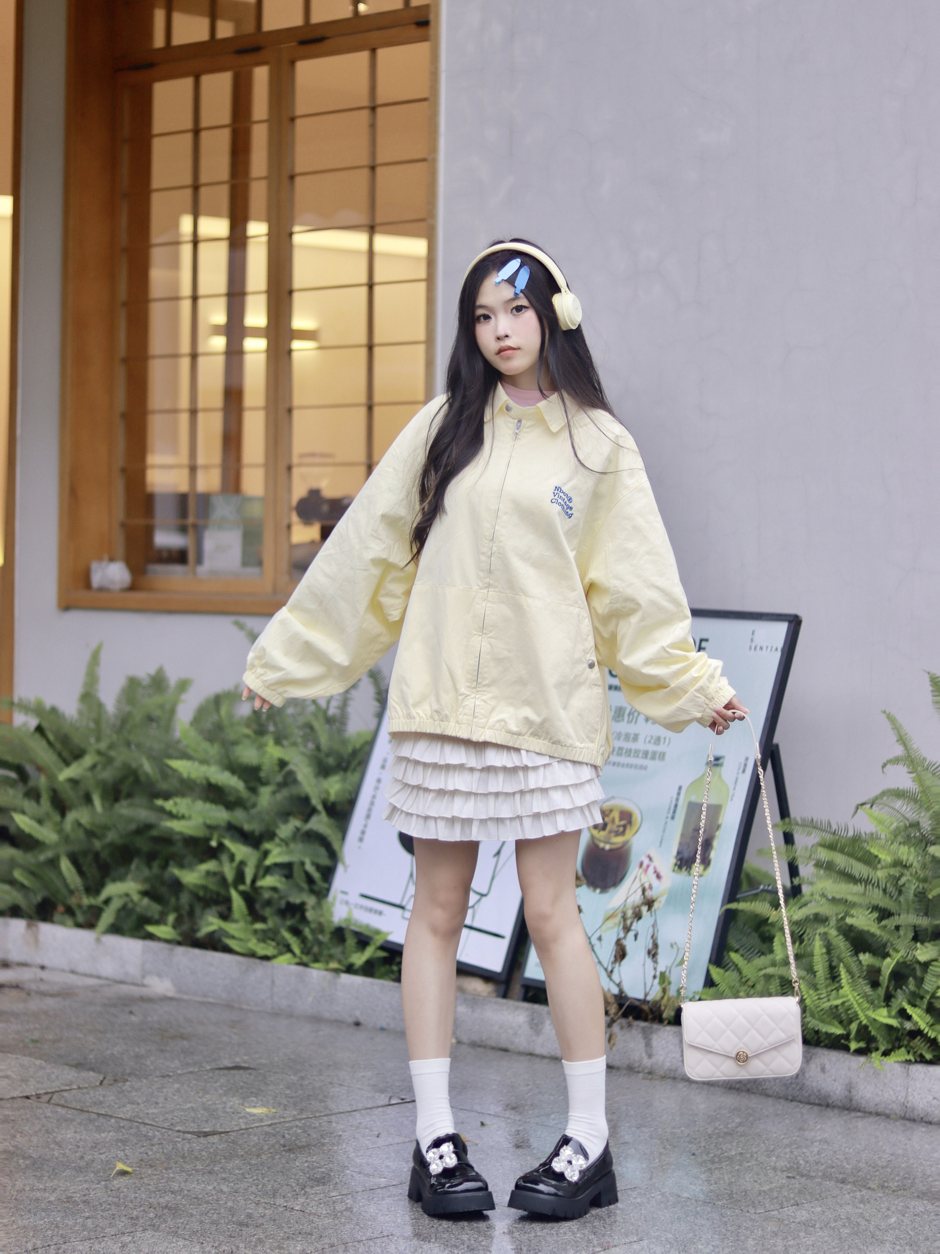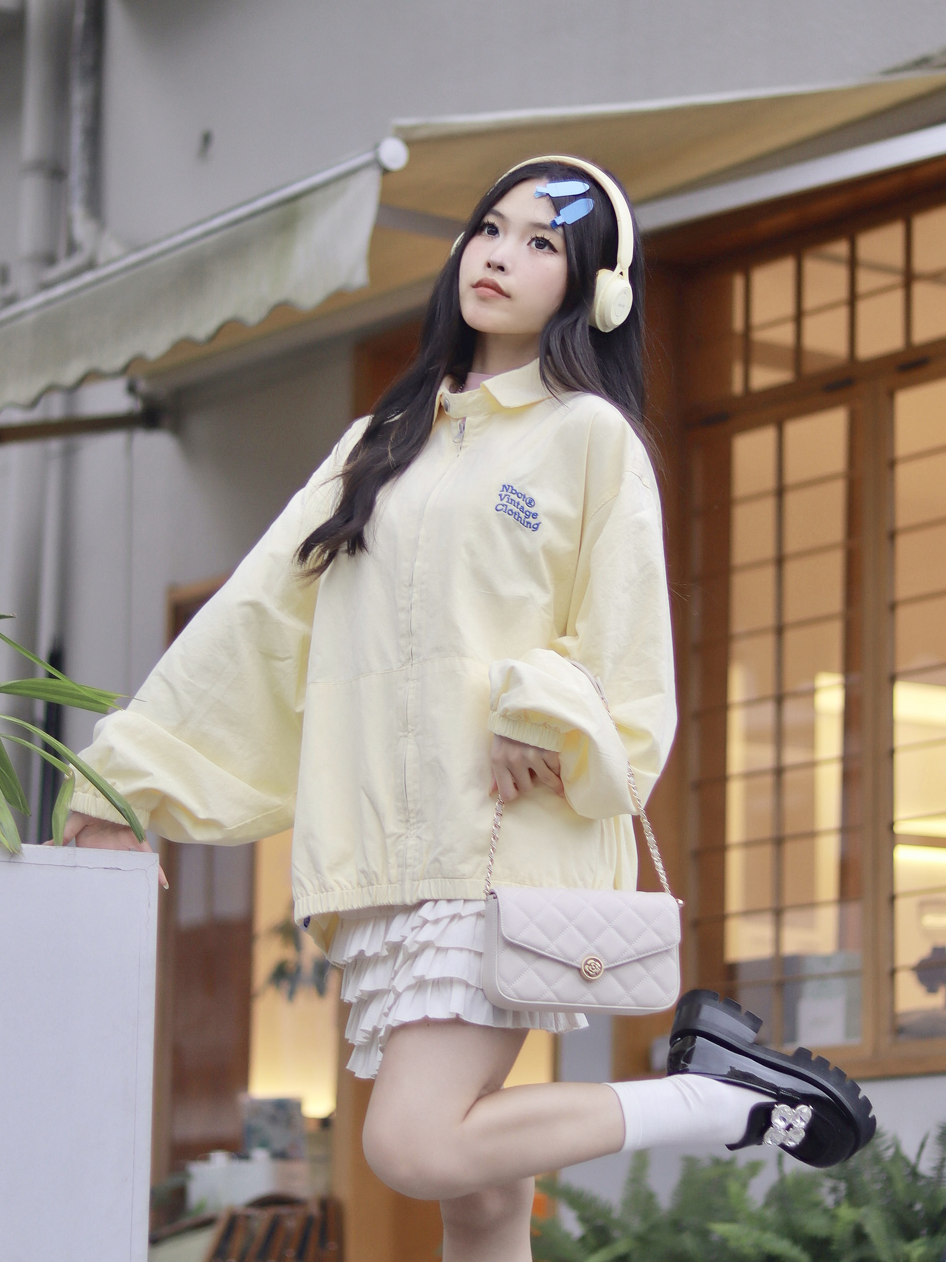 这身嫩黄色穿搭真的太甜啦!又嫩又软妹~ 上衣搭配了NBCT的外套,嫩黄色搭配米色的裙子,真的超级多巴胺!oversize的版型很显瘦~添加上背后的和胸前的蓝色印花超有设计感! 搭配了mio的乐福鞋,圆头的鞋头超级可爱!5.5cm厚底增高又显瘦~四叶草的大钻别提有多闪了!