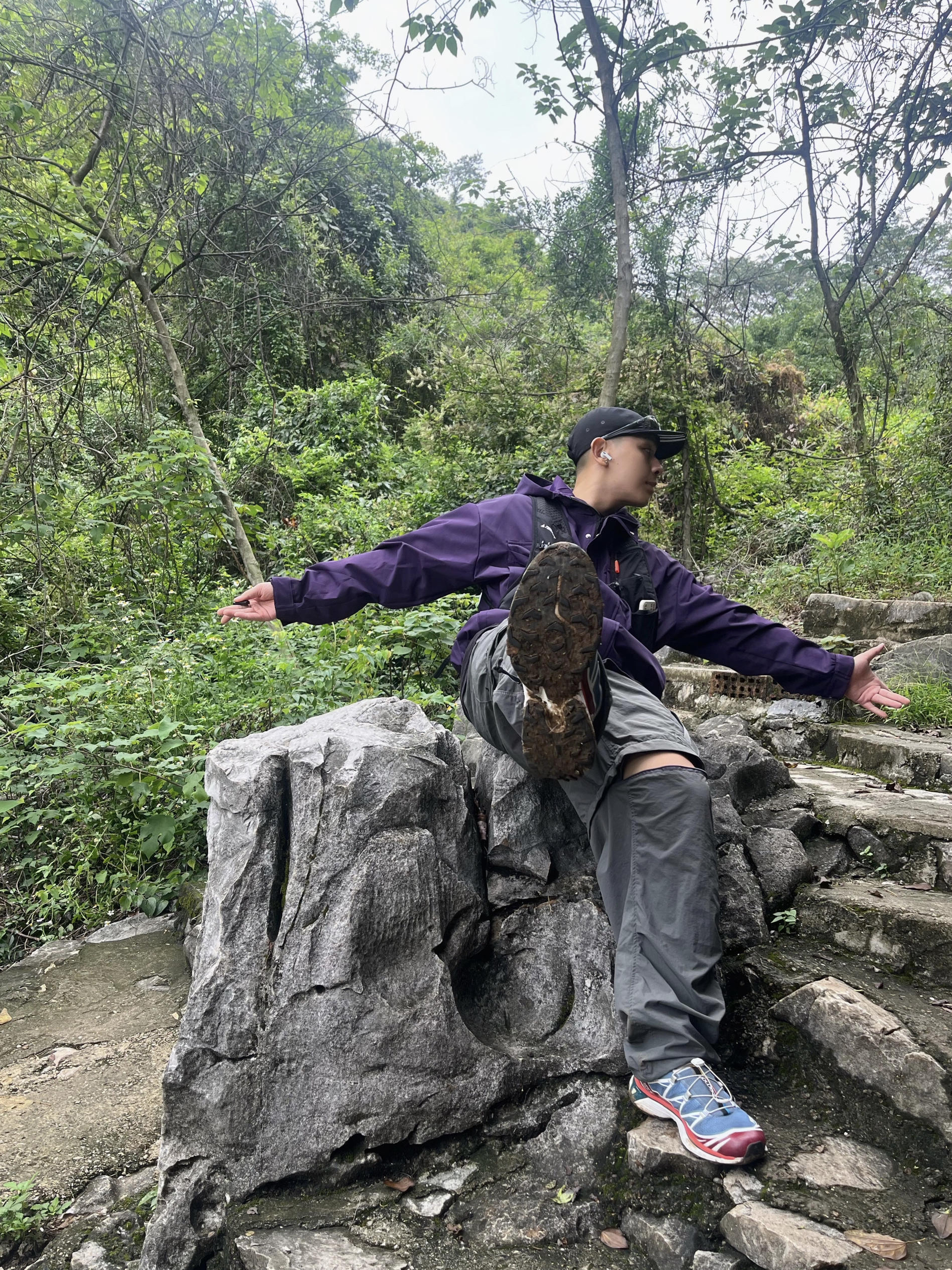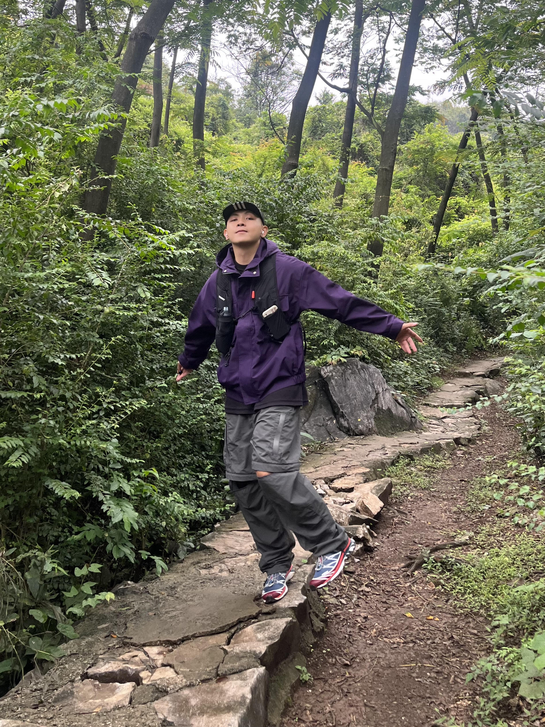户外穿搭不应该只有沉闷的大地色⛰️冲锋衣恰到好处的紫色完美融入自然背景,搭配一条两用机能裤也太顶了🫠同时在户外穿着十分舒适,蹬上亮眼配色的萨洛蒙XT6👟,我宣布这个山头没人比我更帅咯!🙌🏼 🧢:Adidas 🧥:GTRG 👖:GTRG 👟:Salomon XT6
