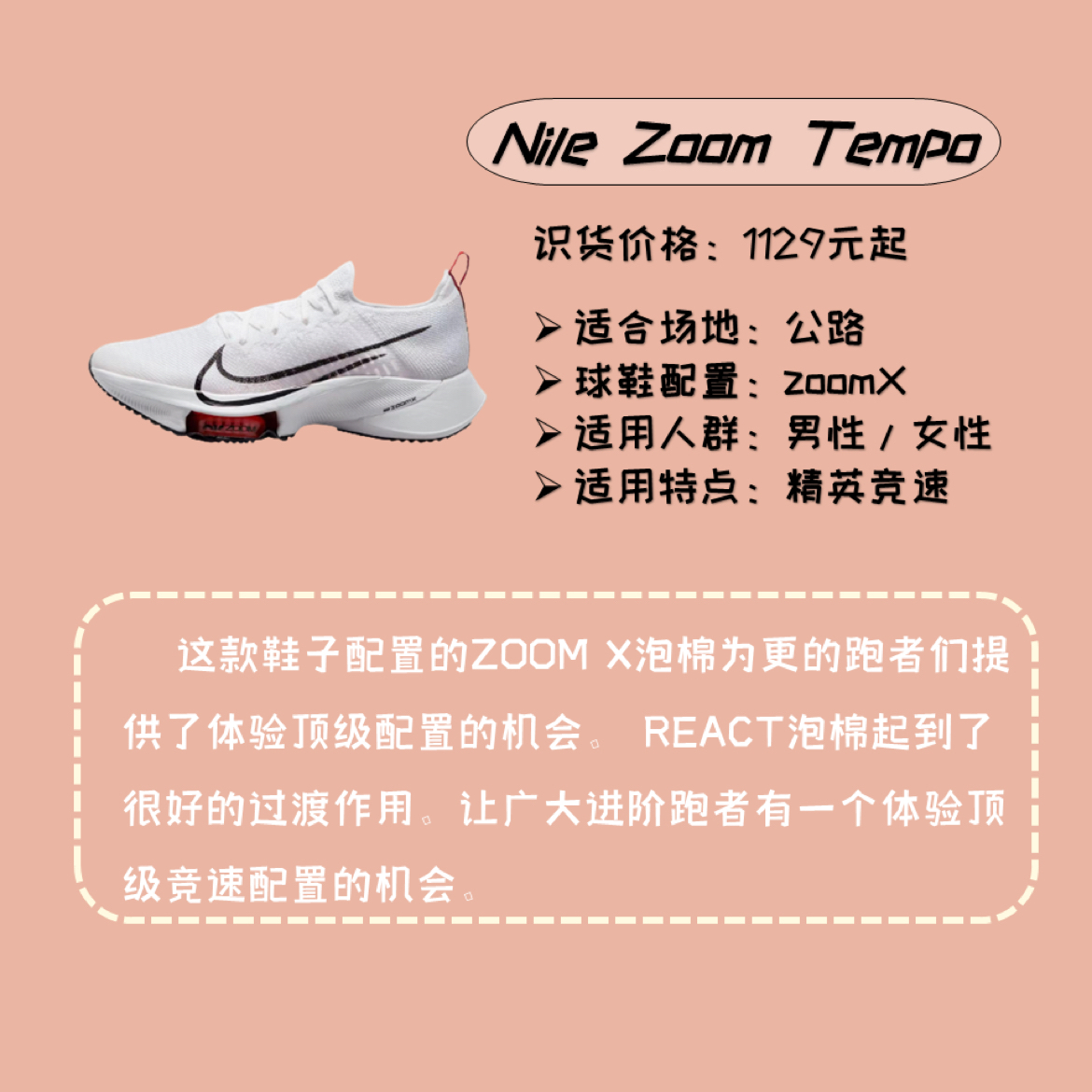 跑鞋不仅仅要有实力科技,还需要颜值好搭配。每一个品牌选择一双的话,我是这么选的🤔🤔 🌼李宁 绝影2 绝影系列一经问世就因前卫时尚的外形和令人耳目一新的科技受到大众喜欢。这款鞋子材料缓震与结构缓震的一次完美结合,蓄能弹速节省能量消耗,也提供了能量反馈。 🌼Nile Zoom Tempo 这款鞋子配置的ZOOM X泡棉为更的跑者们提供了体验顶级配置的机会。 REACT泡棉起到了很好的过渡作用。让广大进...