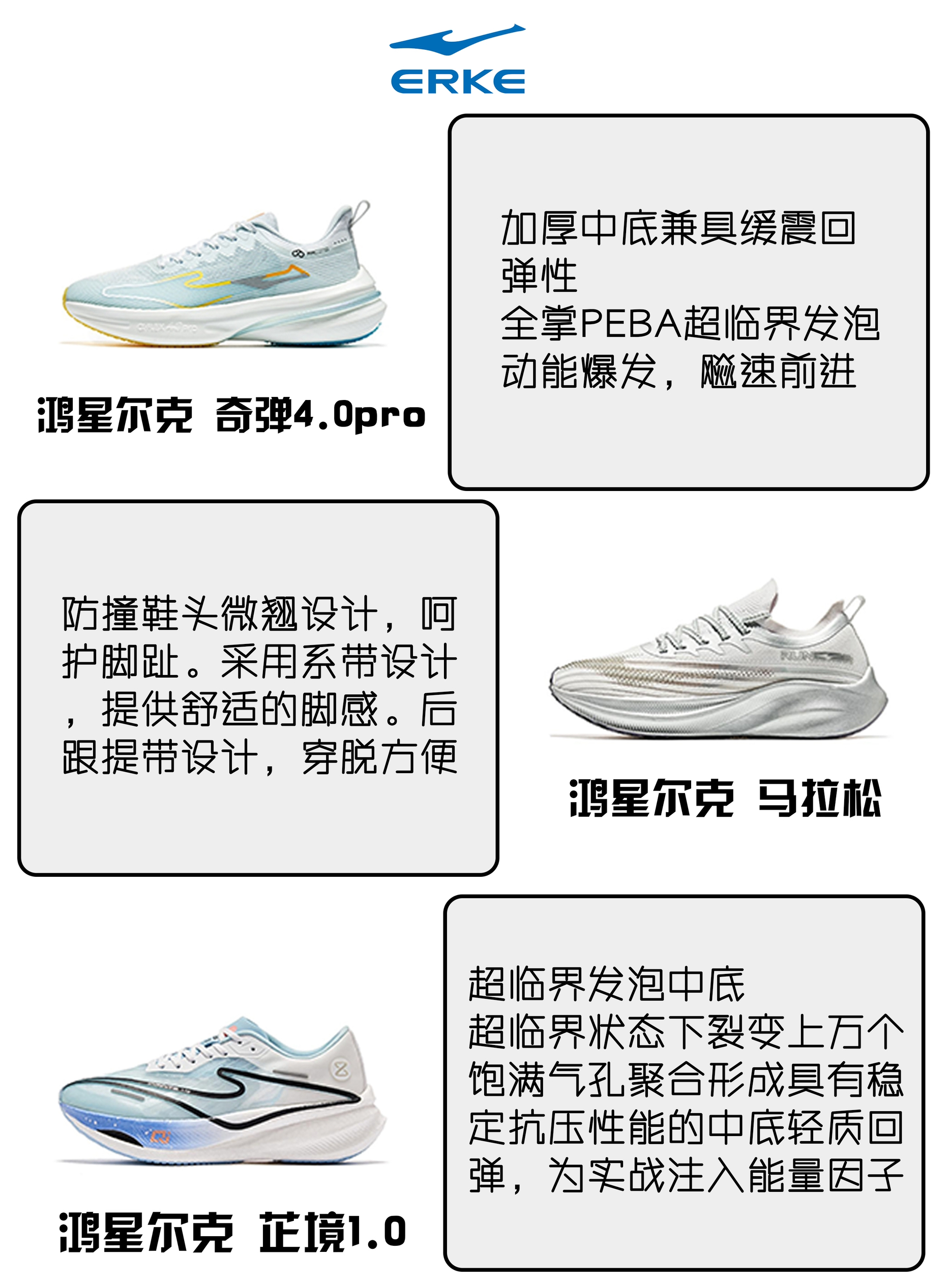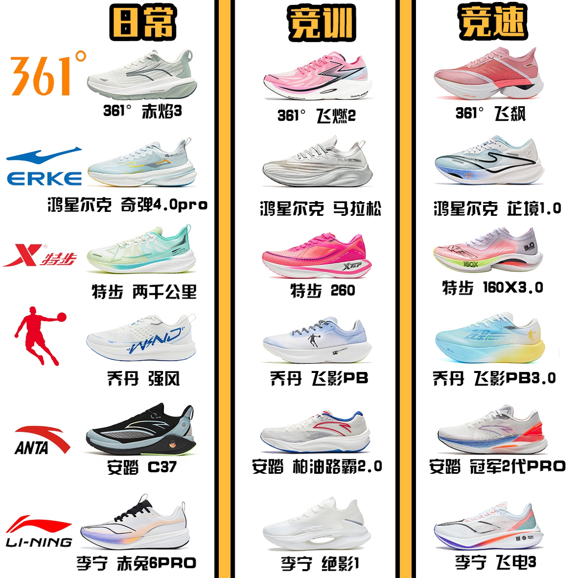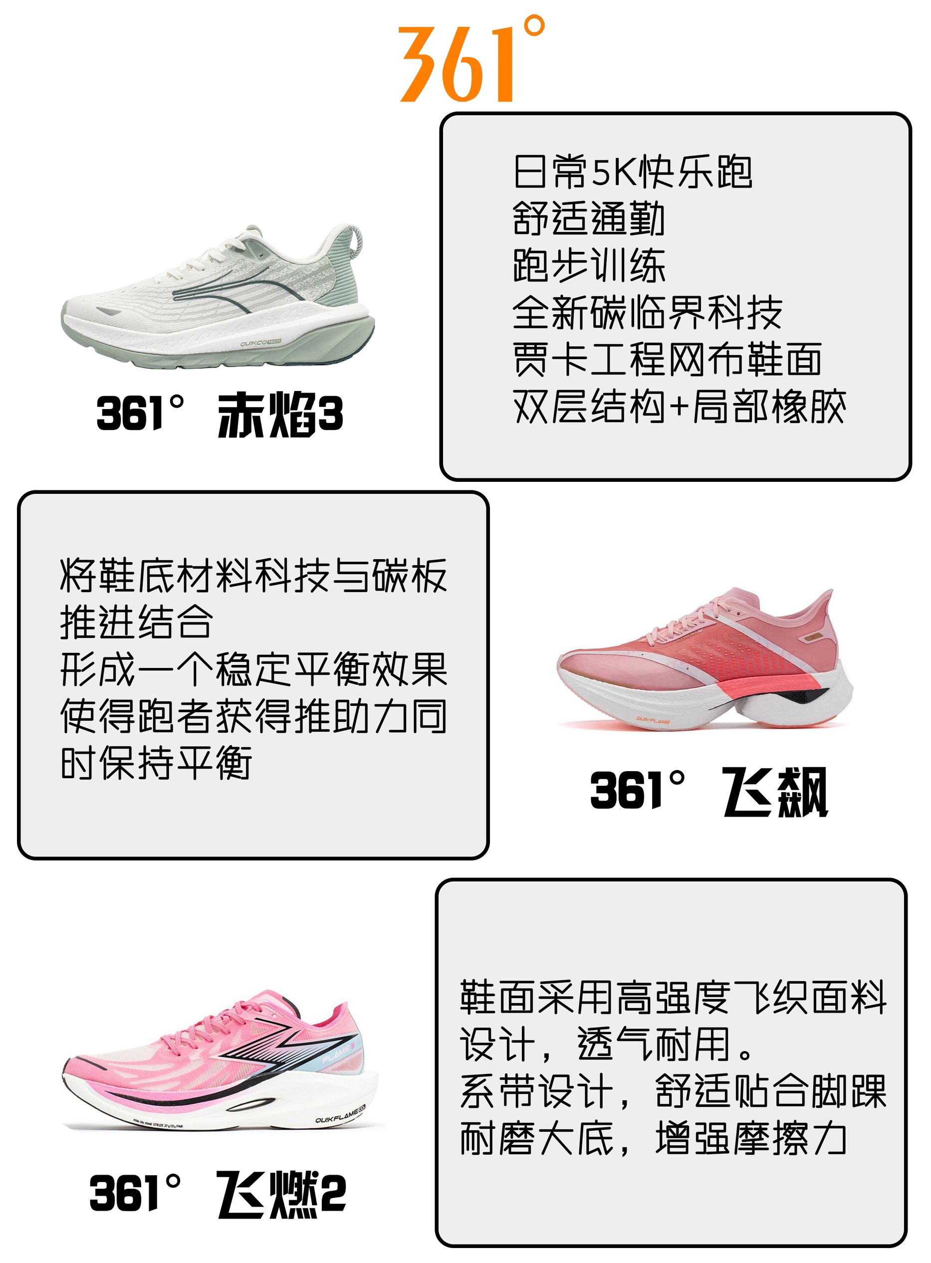 本期为大家挑选了比赛/竞训/日常训练的国产跑鞋! 361°赤焰3 日常5K快乐跑,舒适通勤跑步训练,全新碳临界科技,贾卡工程网布鞋面,双层结构+局部橡胶 361°飞飙 将鞋底材料科技与碳板推进结合,形成一个稳定平衡效果,使得跑者获得推助力同时保持平衡 361°飞燃2 鞋面采用高强度飞织面料设计,透气耐用。系带设计,舒适贴合脚踝,耐磨大底,增强摩擦力 鸿星尔克 奇弹4.0pro 加厚中底兼具缓震...