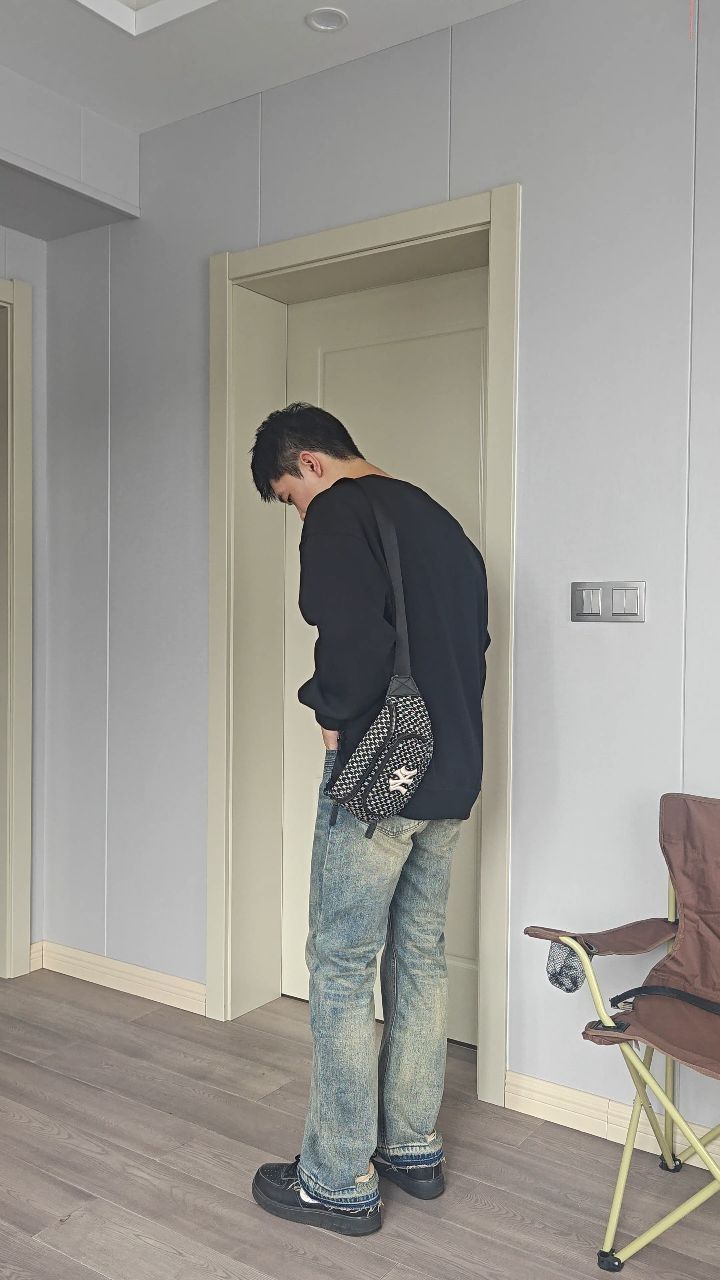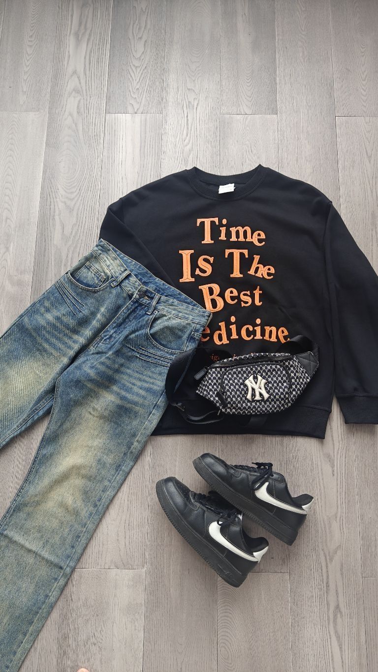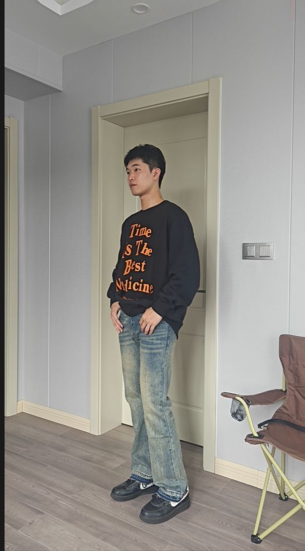 175/125 黑色印花圆领卫衣+微喇牛仔